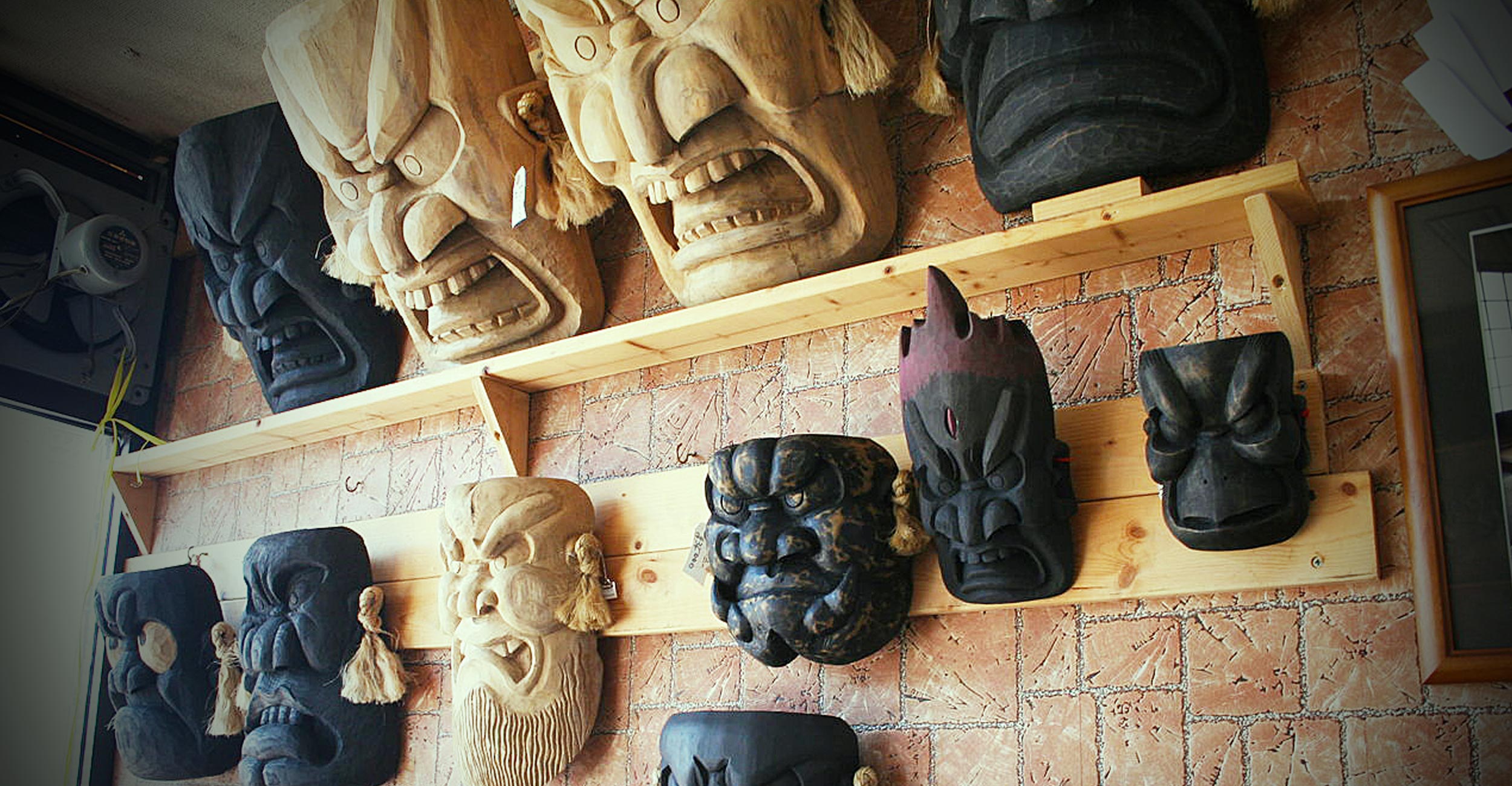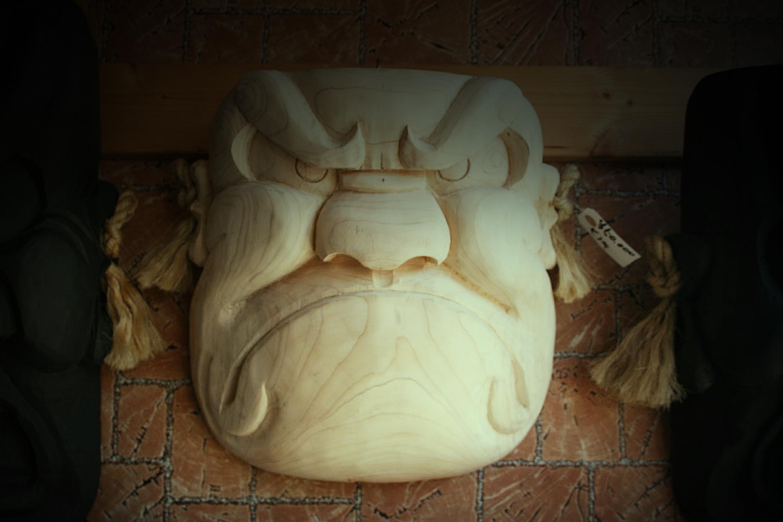 「おい、こら!」と怒り出しそうな顔。鬼みたいな形相もあれば、とぼけた顔もある。でも、ずっと見ていると笑っているようにも見えてくる。そんな不思議なお面の数々。民俗学者たちが、その起源を調査したらしいが、結局は「火の守り神」ということくらいしか、わかっていないようだ。
