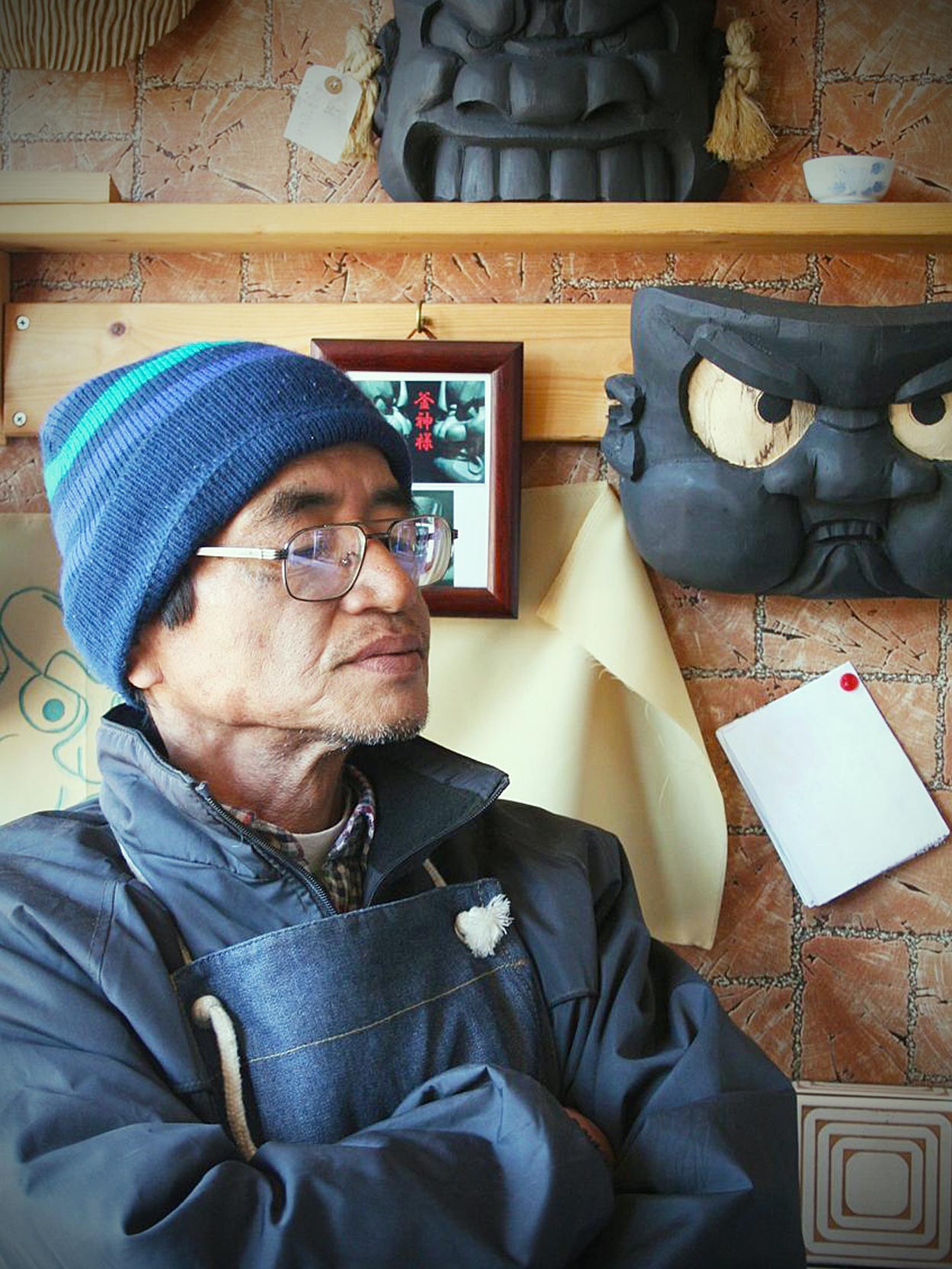 ガラガラとガラスの引き戸を開けると、男性が座っていた。土間のような店の中は冷えるのだろう。帽子にジャンパーを身につけ、壁一面のお面に囲まれている。少し無精髭を生やした顔が、