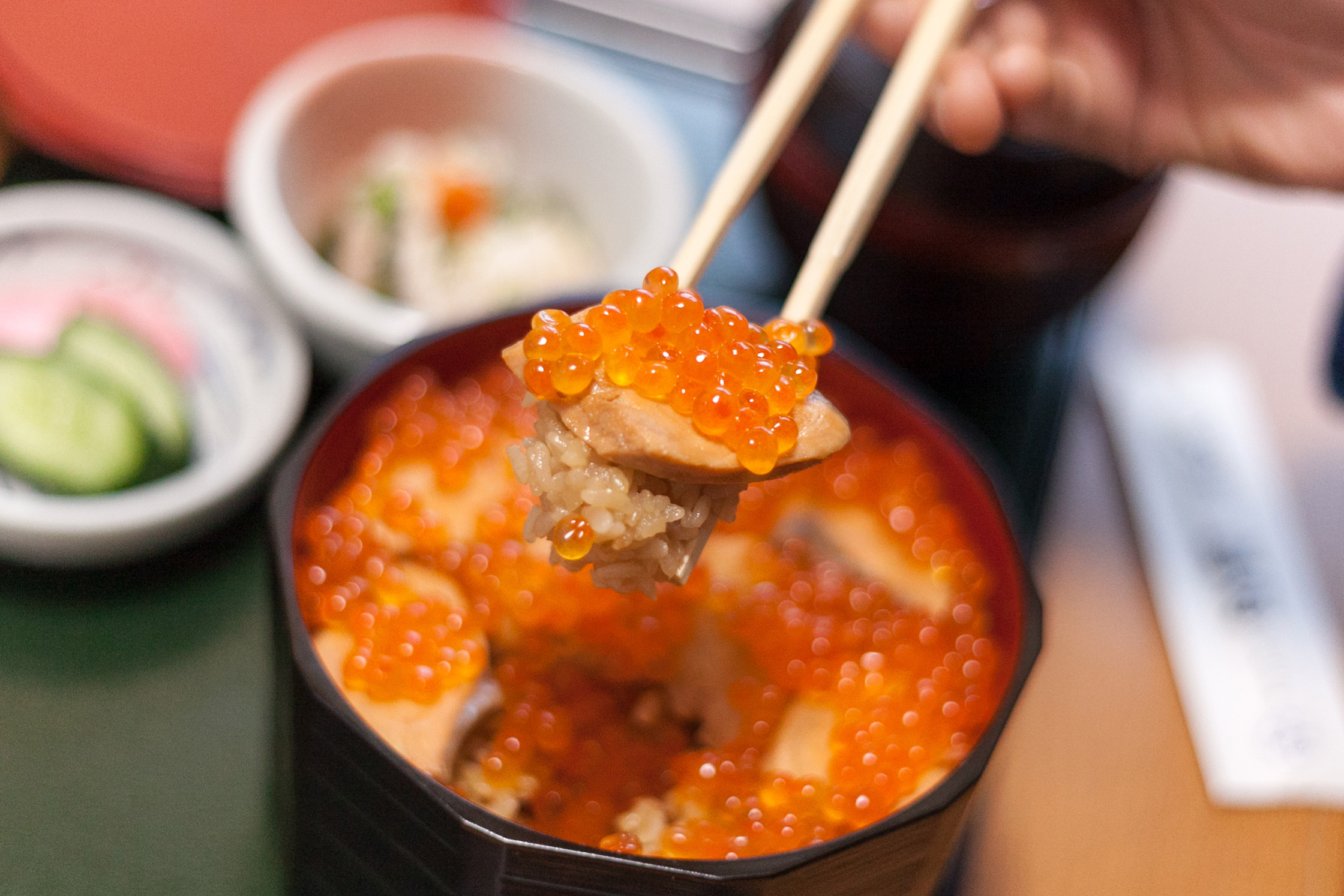 初めて食べるはらこ飯は、まず、見た目からとても豪華な料理だった。ホール主任の関口信義さんがサーブしてくれたはらこ飯には、これでもか、というくらいサケとイクラがたっぷりとのせられている。口に運んでみると、ふっくらしたサケとごはんが、ほんのりと温かい。関口さん曰く、秘伝のタレを使ってサケを煮ているのだそう。そして噛むと、イクラが口の中でプチプチとはじける音がする。とにかくおいしいので、箸がどんどん進む。