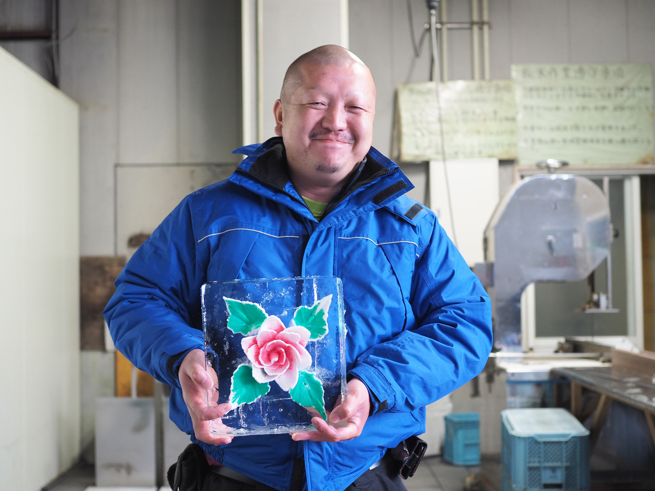 そう言われて見ると、失礼ながら、なかなか強面の男性たちが集まっていた。その中でも特別身体の大きい、宮崎勝也さんが氷の塊に何かを彫っていく。氷彫刻のパイオニア、清水三男氏に習ってからまだ1年だという宮崎さんが、私のために作ってくれたのは、きれいな氷の花の彫刻だった。