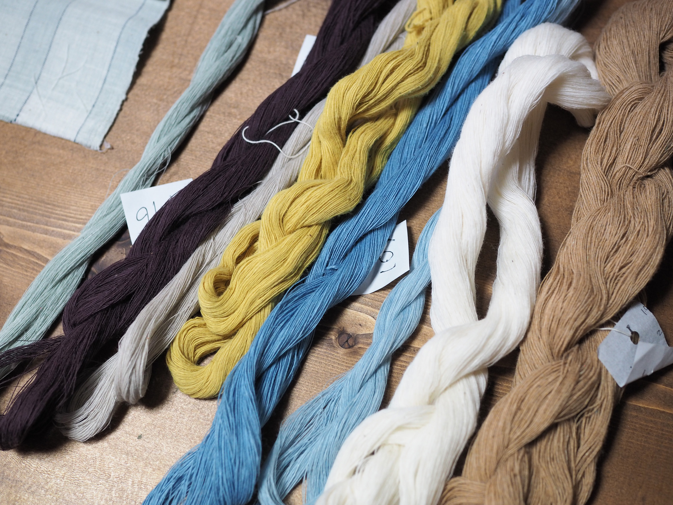 作業場とギャラリーも兼ねているというお部屋には、色とりどりの糸が置いてある。自然のものから染めると聞いて地味な色しかないのかと思っていたが、鮮やかな黄色や爽やかな青色、深い紫色まで、とてもカラフルだ。どんな材料で染めたのかを尋ねると、箱田さんはスラスラと植物の名前を挙げていく。草木染めの図鑑まで持ってきてくれ、まるで植物博士。染めた糸の色は、必ずしも元の植物の色になるわけではないというのがおもしろい。