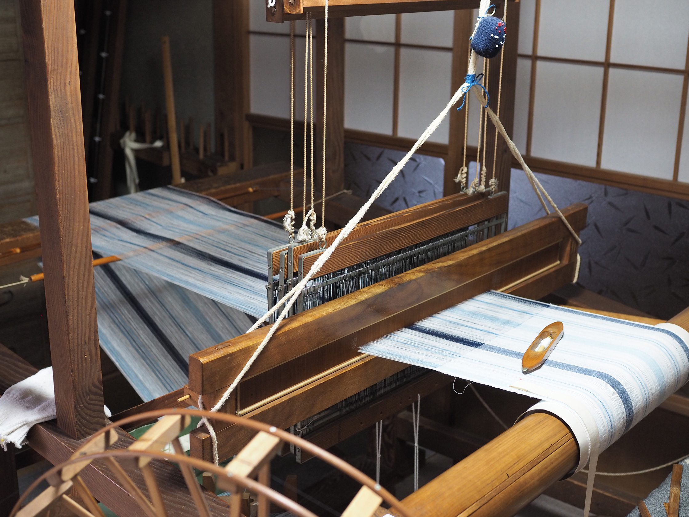 箱田さんの宝物、はたおり機を見せてもらった。小さな部屋の半分以上を占める織り機は、小柄な箱田さんの身体に合わせた特注品。独立するときに、日下田先生のものと京都の知り合いのものの良いところを合わせて作ってもらったそうだ。全身を使う織りの作業は肩や腰を痛めがちだが、箱田さんは身体に合ったはたおり機のおかげか痛いところがないという。
