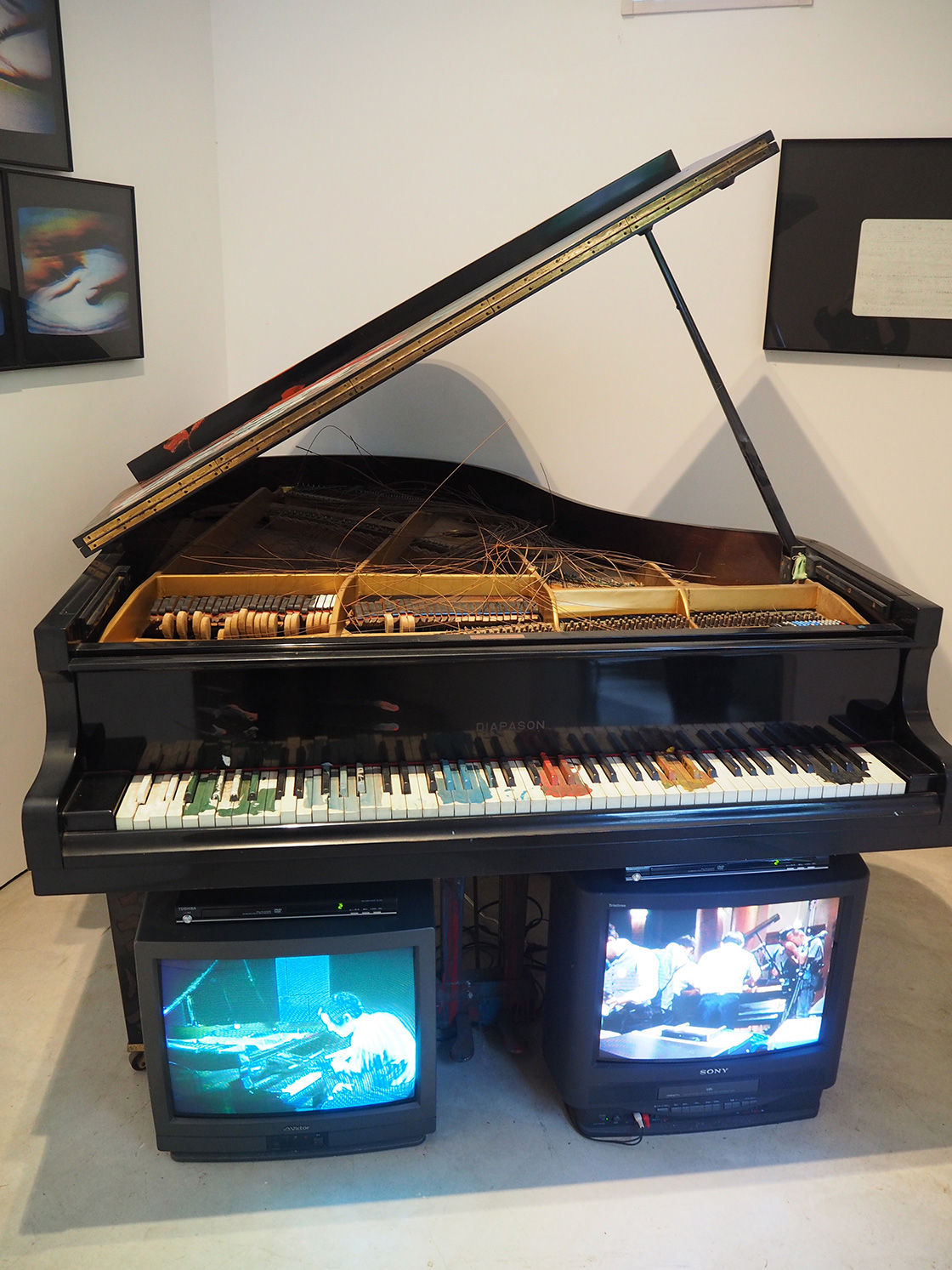 二台のモニターには、古い映像が写っている。一台にはピアノを弾く男が写り、もう一台にはピアノを壊す男が写っている。壊されているピアノは、実際に私たちの目の前にあるこのピアノだ。