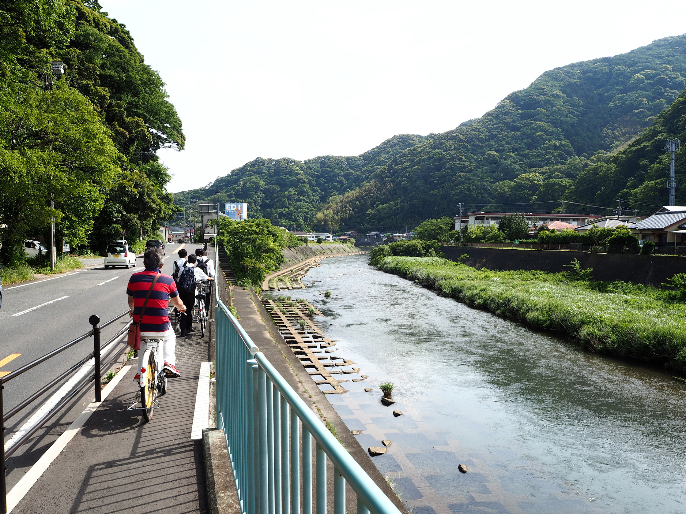 次は稲梓川沿いの道を南に下り、了仙寺へ。距離は4キロで、時間は15分程度。運動不足の身にとって、歩いたり、走ったりすると思うと4キロはハードルが高すぎるけど、電動自転車ならあっという間! 川と山を眺めながらのサイクリングはとても気分が良く、あっという間についた。
