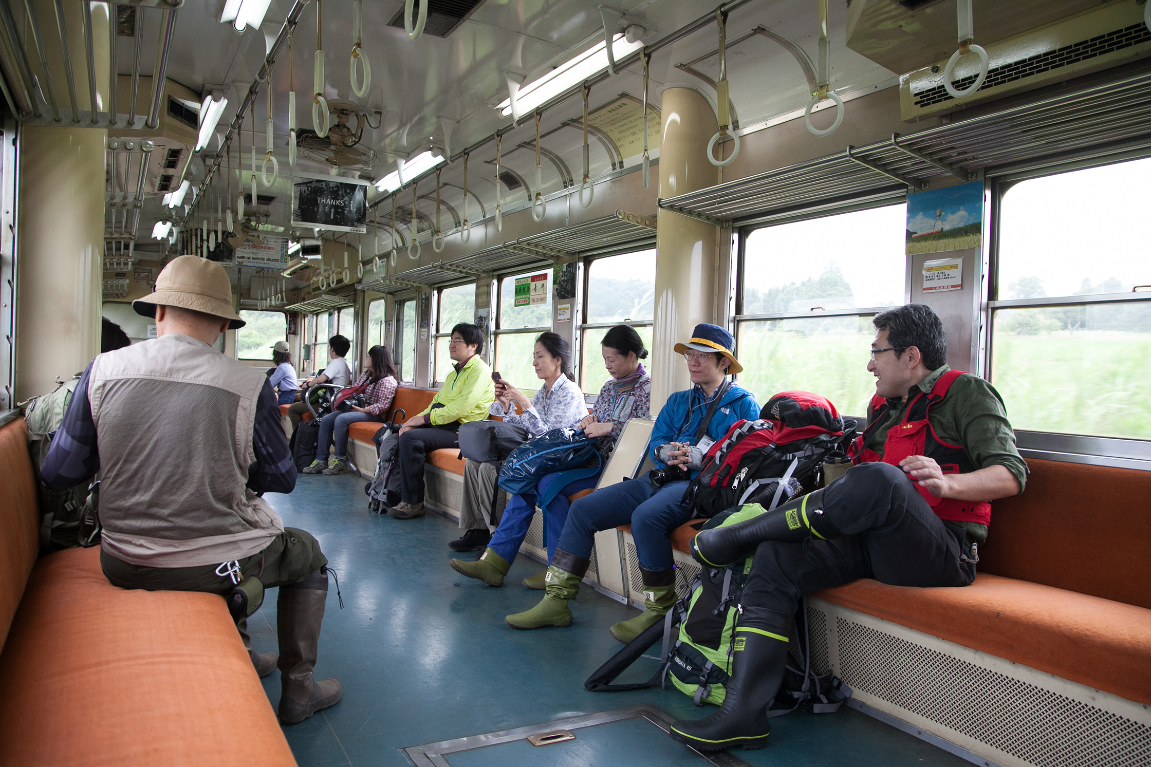 今回の旅は河川や地質の専門家たちが一緒だ。特に地質の専門家である大里さんと坂元さんは、数年前から「千葉セクション」を見学しているという。列車の中でハイキングの準備をしつつ、地層について、いろいろと教えてもらう。