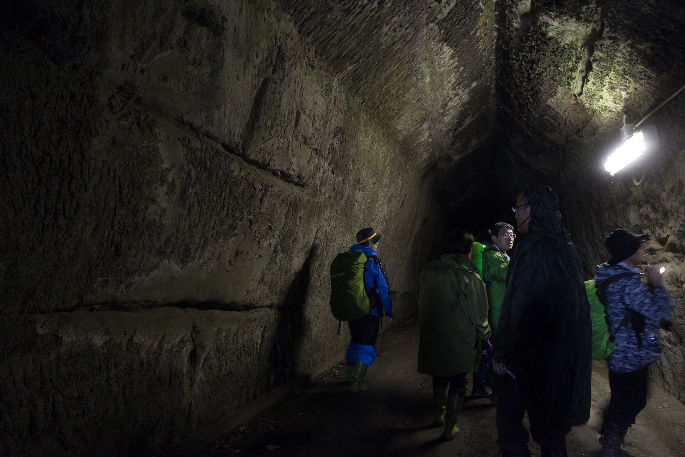 薄暗い永昌寺トンネルを進んでいく。トンネルの内部はまるで将棋の駒のような形をしており、これは観音堀と呼ばれる伝統的な掘り方だ。