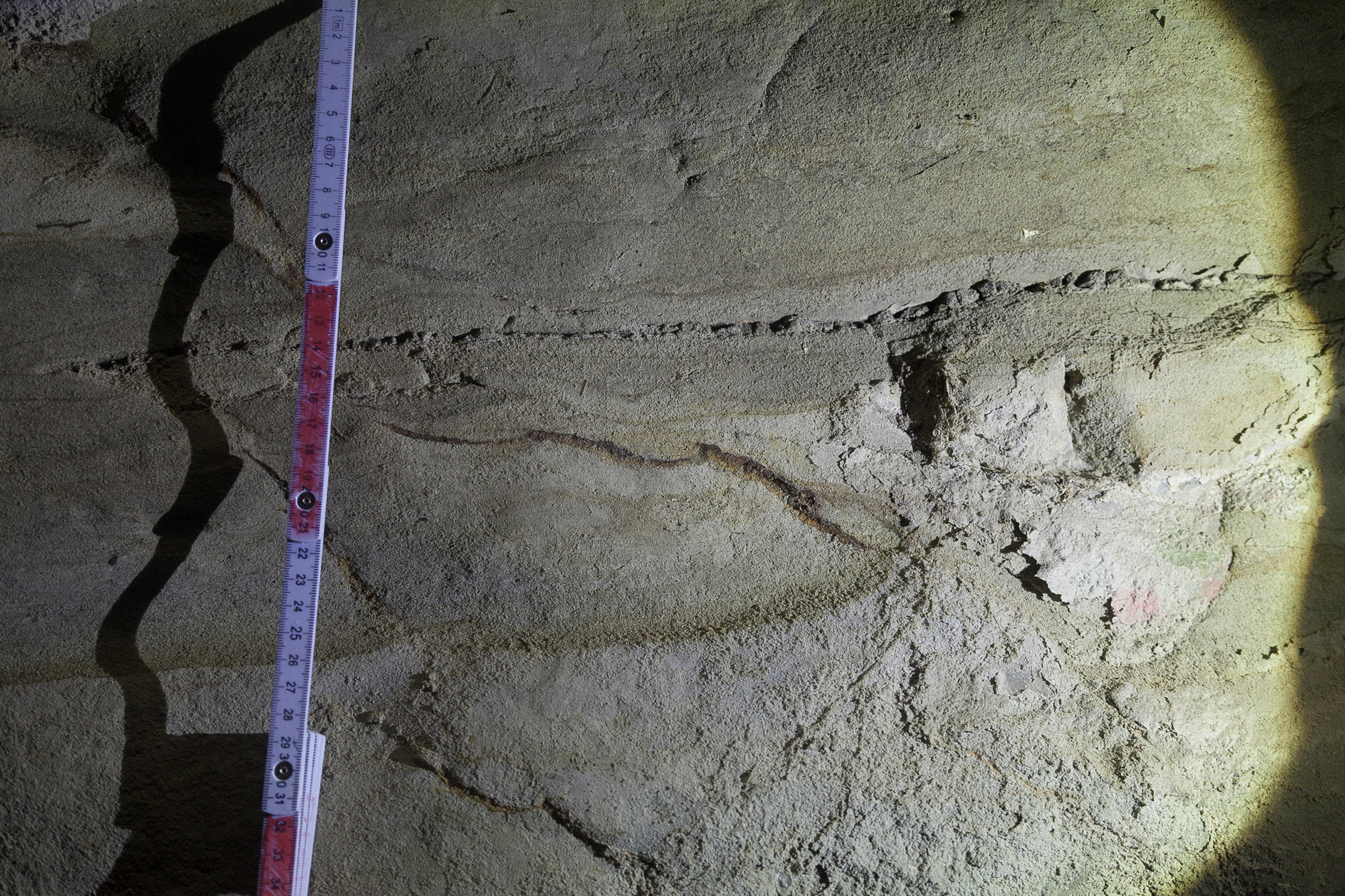 そして素掘りのトンネルのもう一つの魅力は、トンネルの内部の壁面が、全て地層として見られることだ。古いトンネルであるため壁面にモルタルなどを吹き付けておらず、岩盤が自然のままになっているからだ。