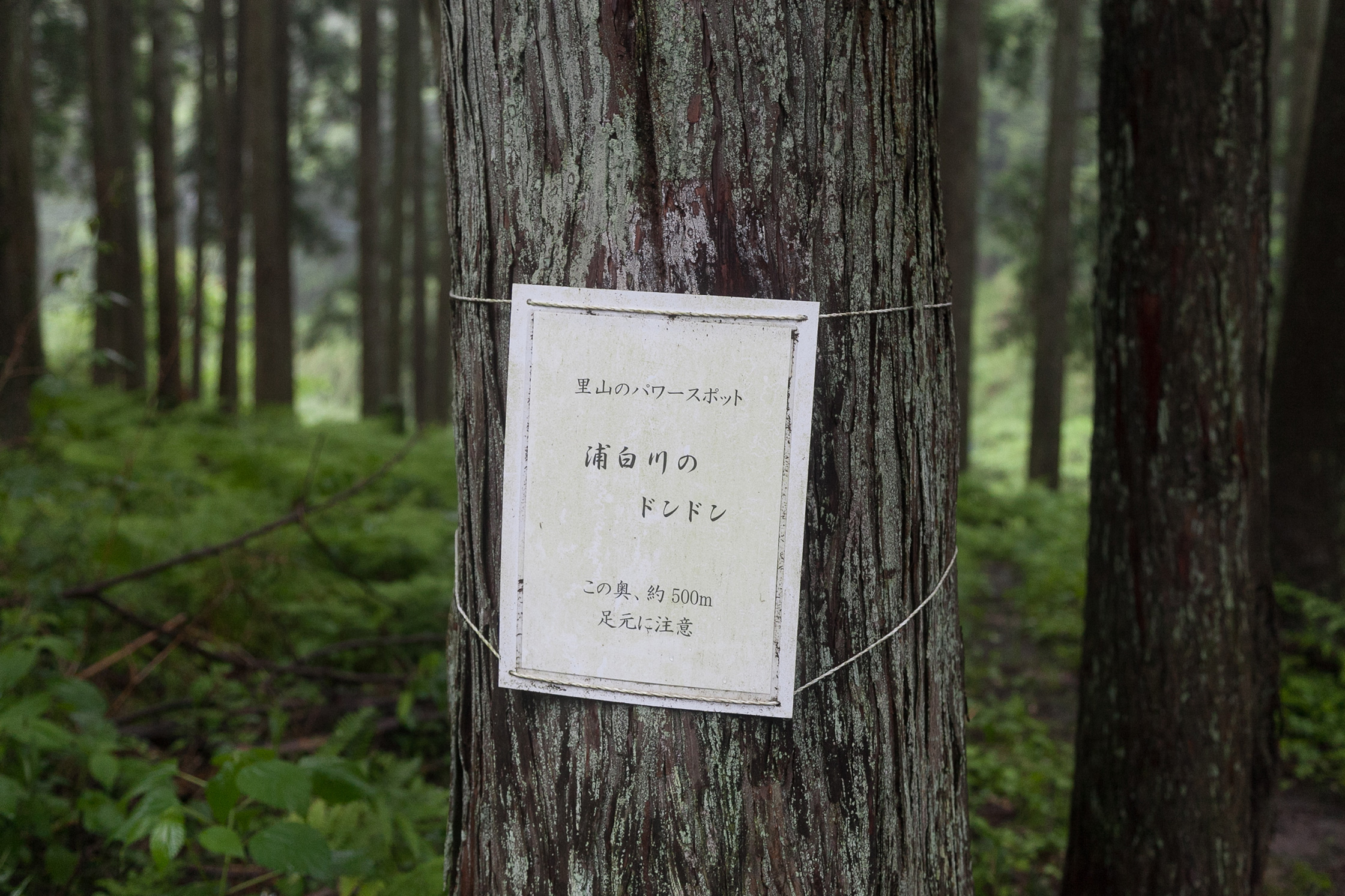 さて永勝寺トンネルを過ぎてしばらくすると、森の入り口に不思議な看板がかかっていた。「浦白川のドンドン」と書かれている。これはいったいなんだろう?