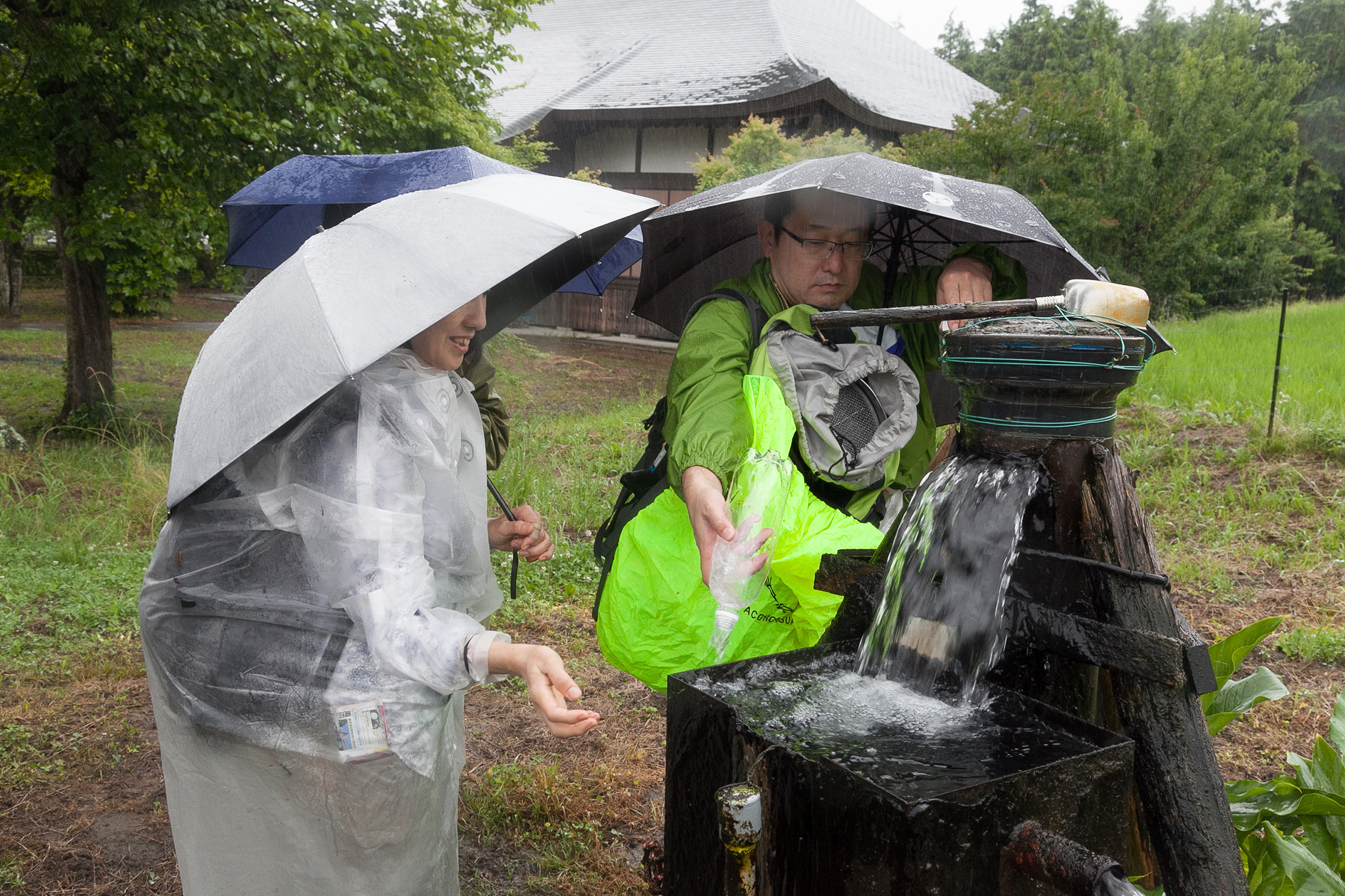 もう一つ、この近くに、地元の人が「ちゃ水」と呼んでいる水が湧き出る井戸があるという。ちゃ水とはこの地域に多い、ヨウ素が混じった湧き水のことで、主に田んぼや畑の水として使われている。皆で運泉寺の近くに広がる田んぼの傍にあるちゃ水の井戸を探した。近づいて観察すると、確かにヨウ素特有の茶色い水が出ている。さらに近づくと、その独特のにおいを感じることができた。
