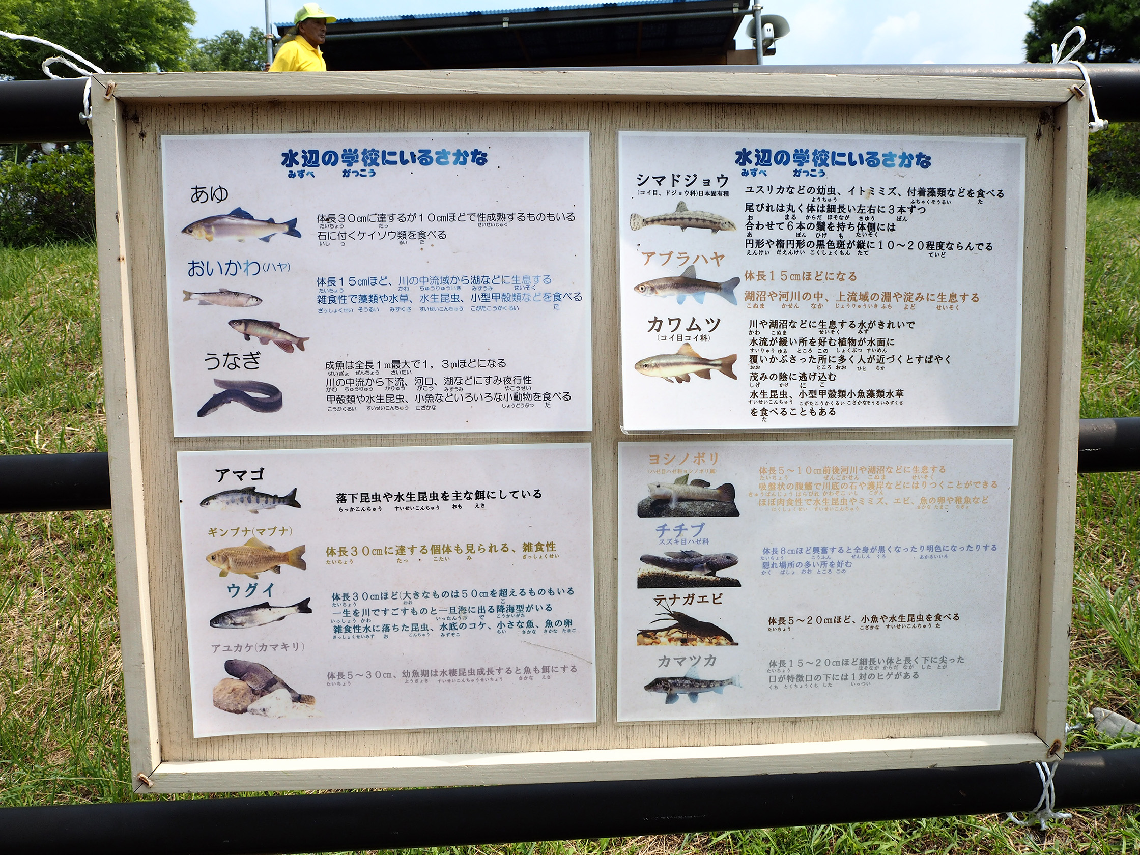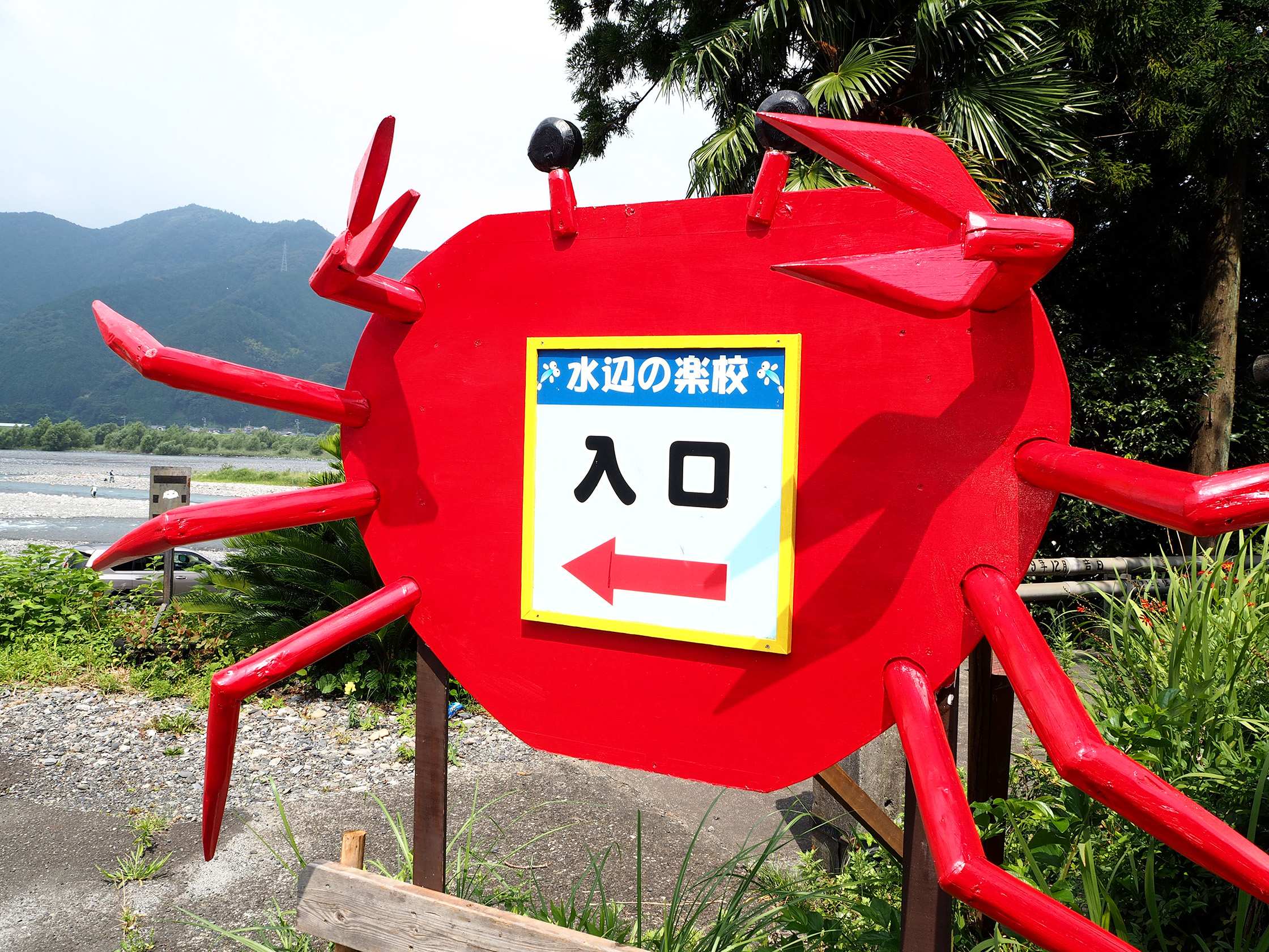 安部街道を進み、道路が分岐する直前に「水辺の楽校 入口」と書かれた大きなカニの看板がある。案内に従っていくと川沿いに広大な駐車場があった。午前10時から今年の開校式が始まることもあり、9時半過ぎにはすでにたくさんの車が止められていた。