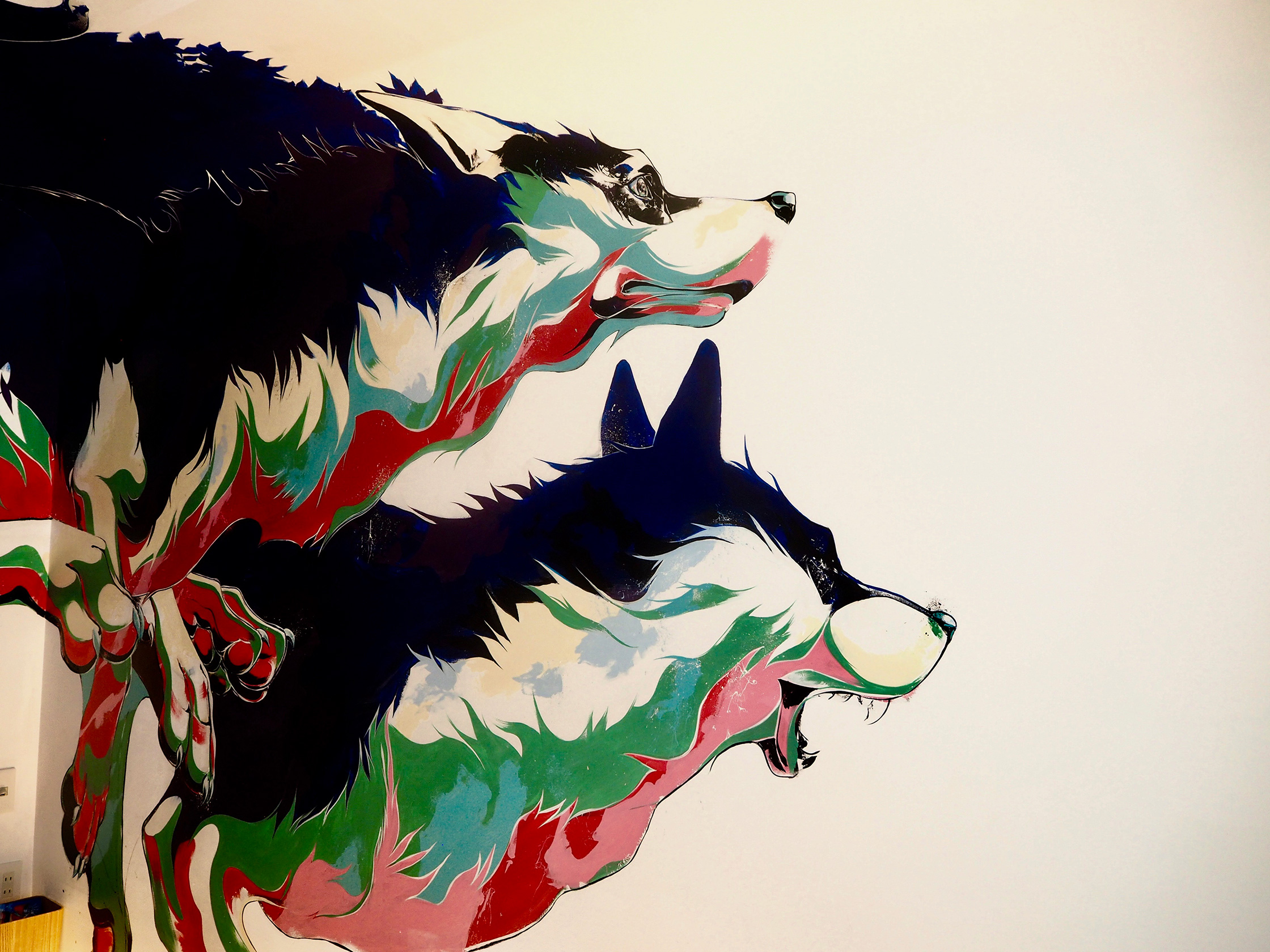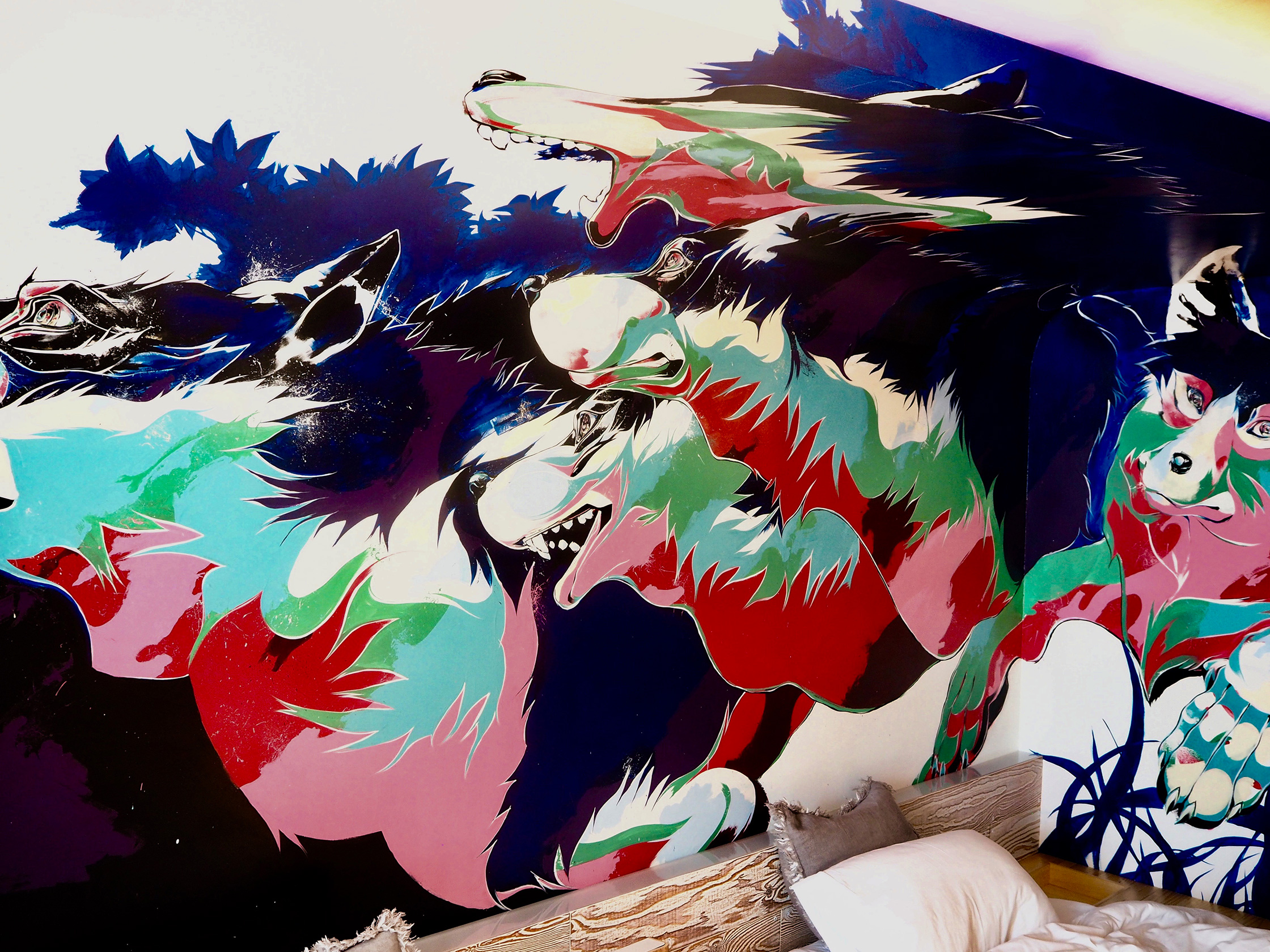 全面にカラフルな狼の群れが描かれ、あたかも何かに飛びかかっていくようにふわーっと浮かんでいるのである。