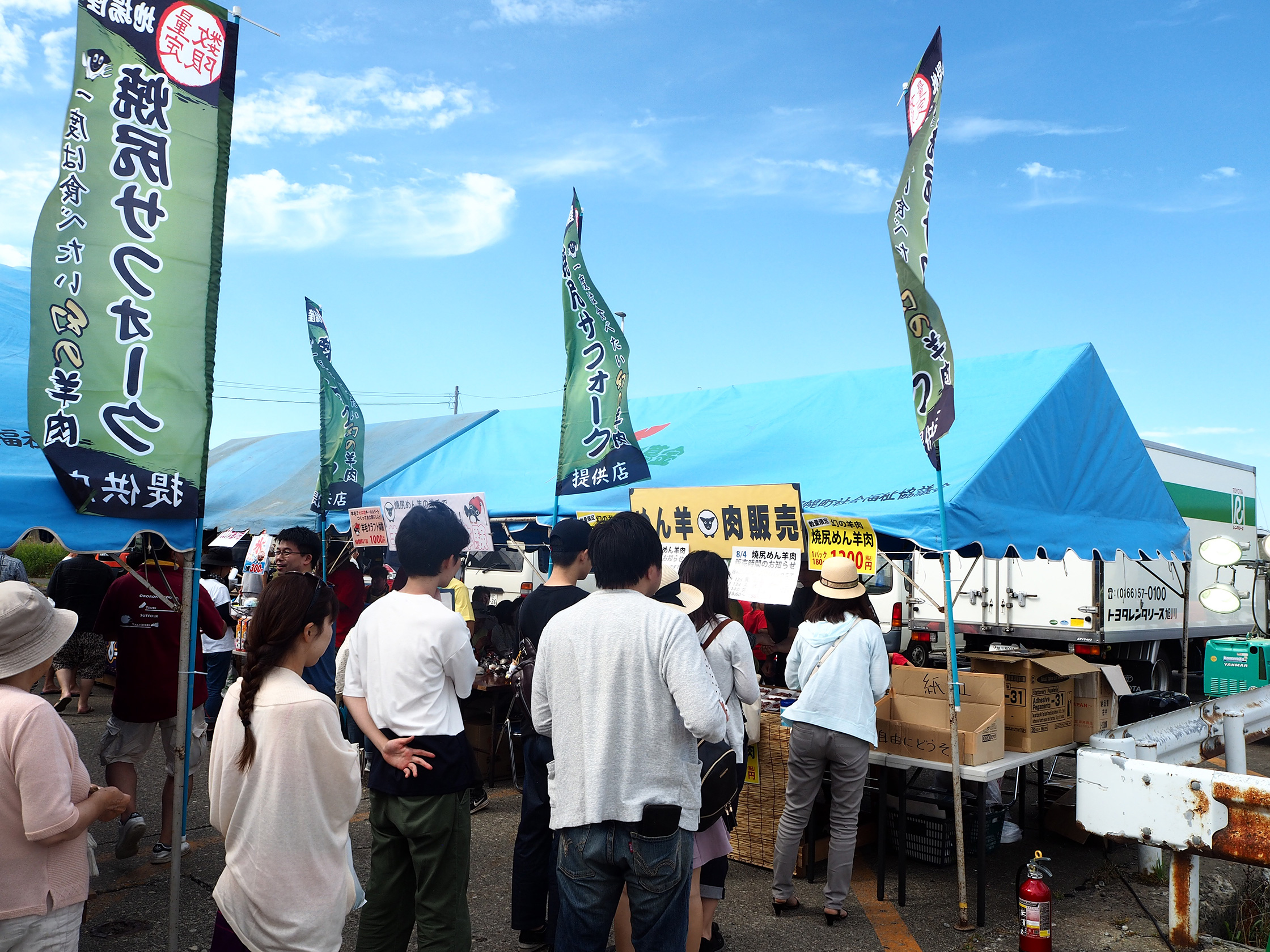羽幌港から40分ほどで焼尻港に到着すると、さらにテンションが上がった。なんと港に日よけテントが立ち並び、その下でお客さんがバーベキューをしている。船の上からでもジュージューと肉が焼ける音が聞こえてきそうな距離感だ。そして、船から見て港の右端には「一度は食べたい幻の羊肉 焼尻サフォーク」と書かれた幟がはためいている。