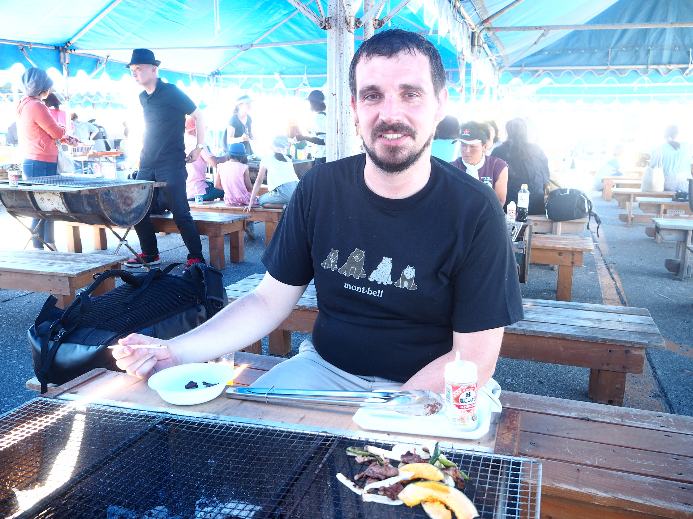 「オレゴン州のポートランド出身で、岡山で子どもたちに英語を教えてます。夏休みで暑いから北海道をレンタカーで回っています。偶然、この島で祭りをやっていると知ってきたんです。う~ん、美味しい! ラッキー!」