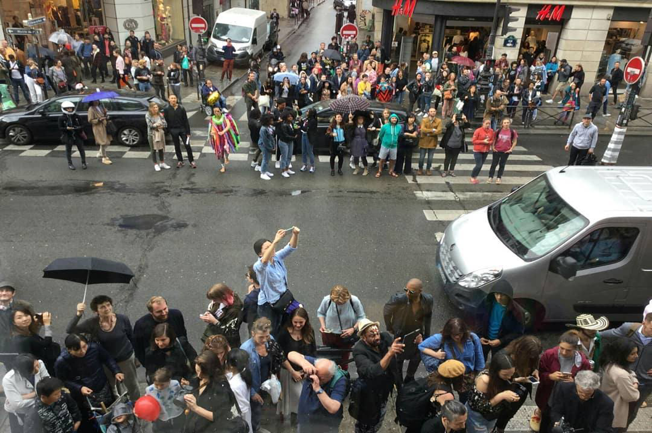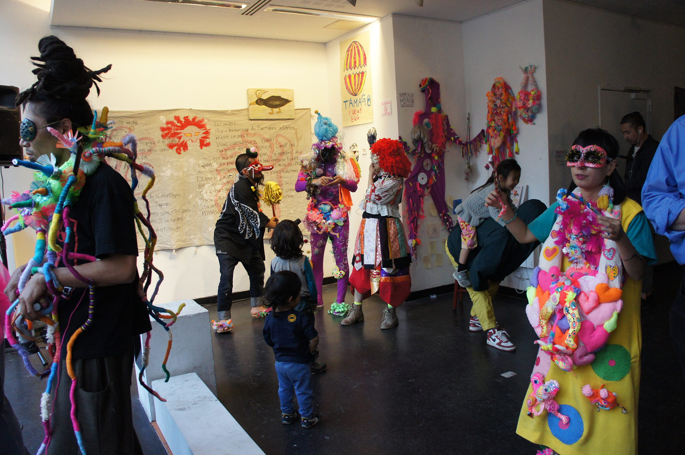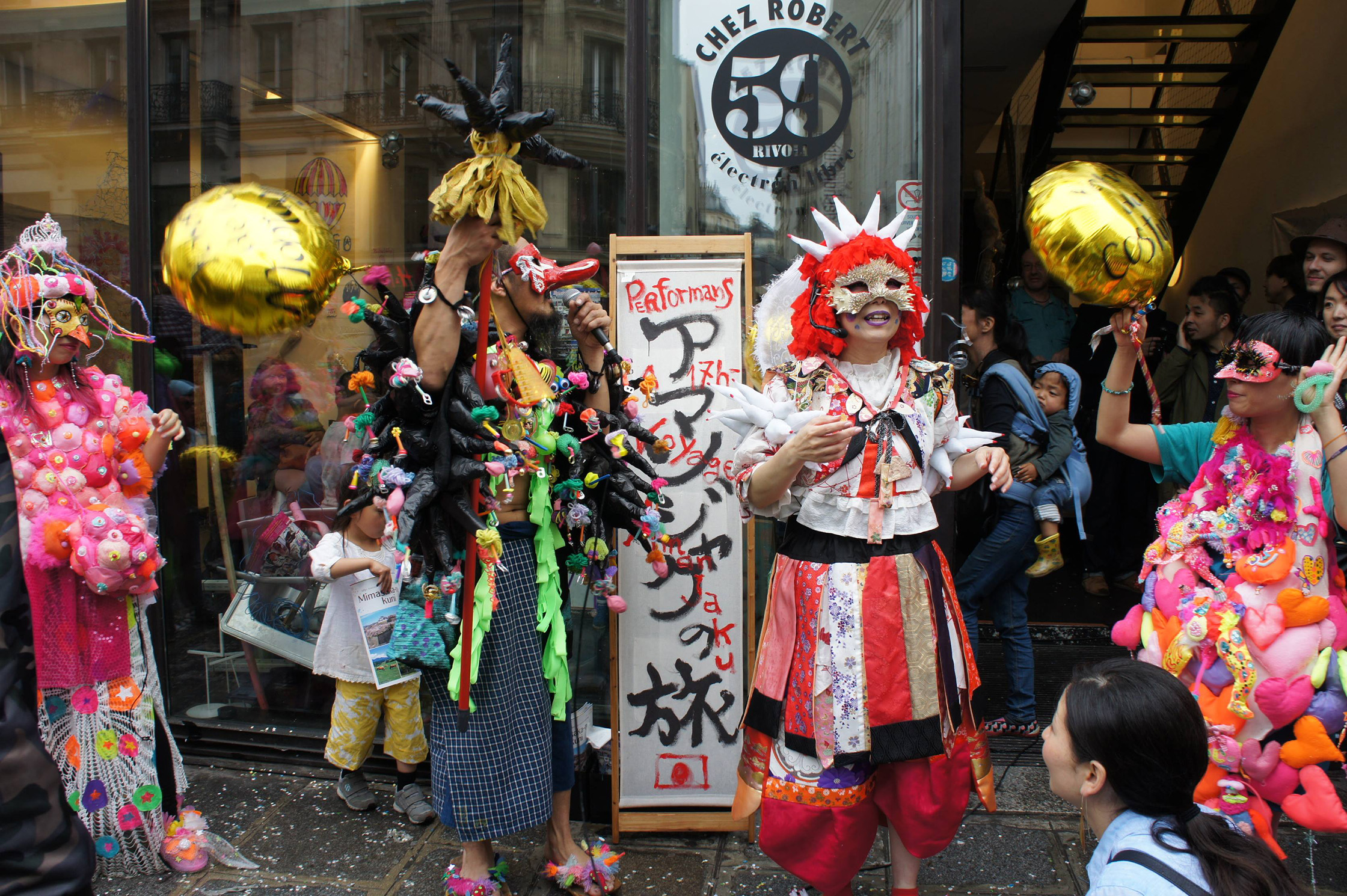 装飾を終えた、8人のメンバーは個性的な妖怪に扮し、路上でパフォーマンスを披露した。先にも書いたが、「リヴォリ59」は渋谷のスクランブル交差点のような場所にある。そこに、妖怪である。開始の時間、あいにくの雨模様だったが、「アマンジャクの旅」は、ハプニング好きのパリジャンには大ウケだったようで、徐々に見物客が路上に鈴なりになり、大いに盛り上がった。