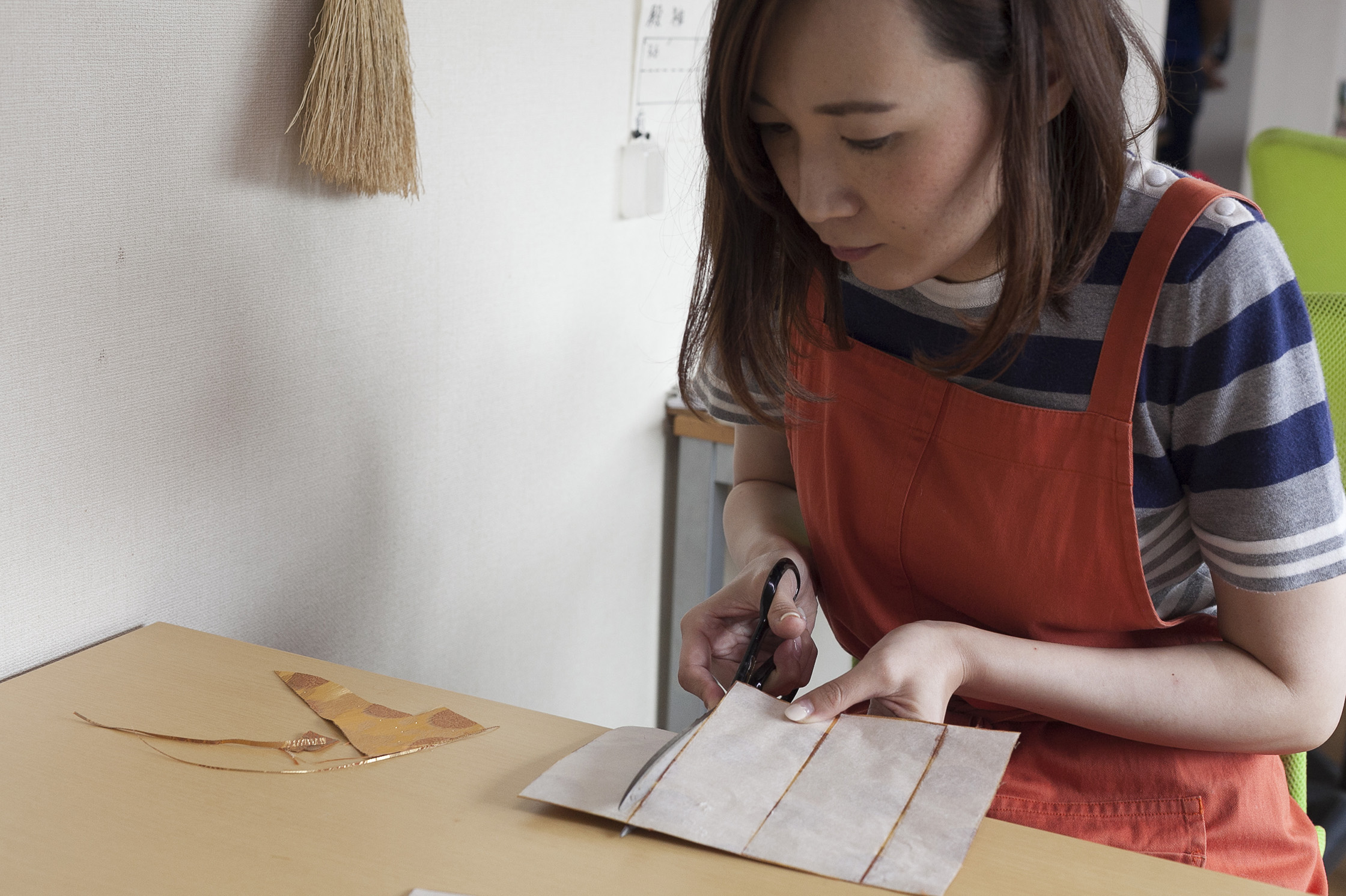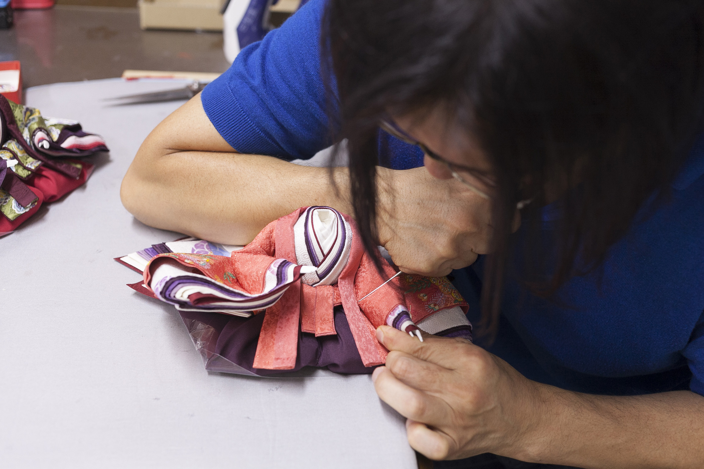 現代の雛人形の着物には、裏面全体に不織布を貼る方法が一般的だ。しかし小佐畑人形店では、地元の高級な和紙を生地に袋状に貼りつける、昔ながらの製法を続けている。これは非常に手間がかかる作業だ。だがこうすることで生地と和紙に隙間ができるため、防虫や除湿の効果があり、雛人形を美しく保つためには必要な作業なのだ。何世代先にも美しい姿のまま、持ち主のそばにいられるように、桂雛には見えないところにも、幾重にも工夫が施されているのである。