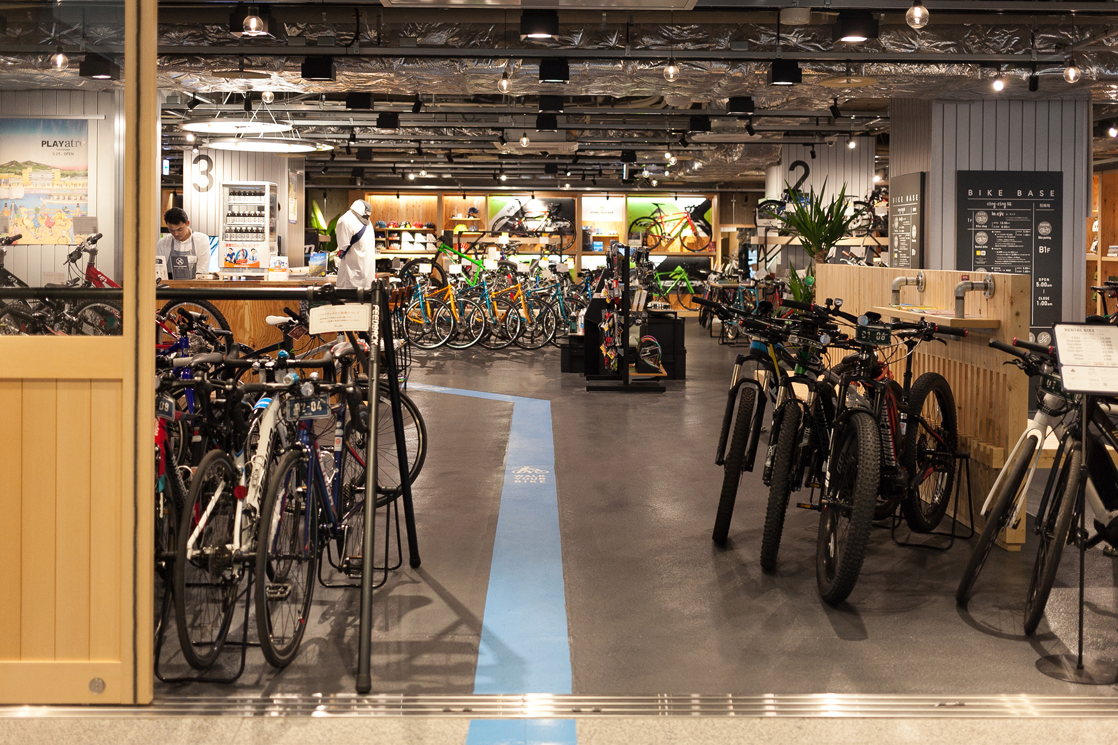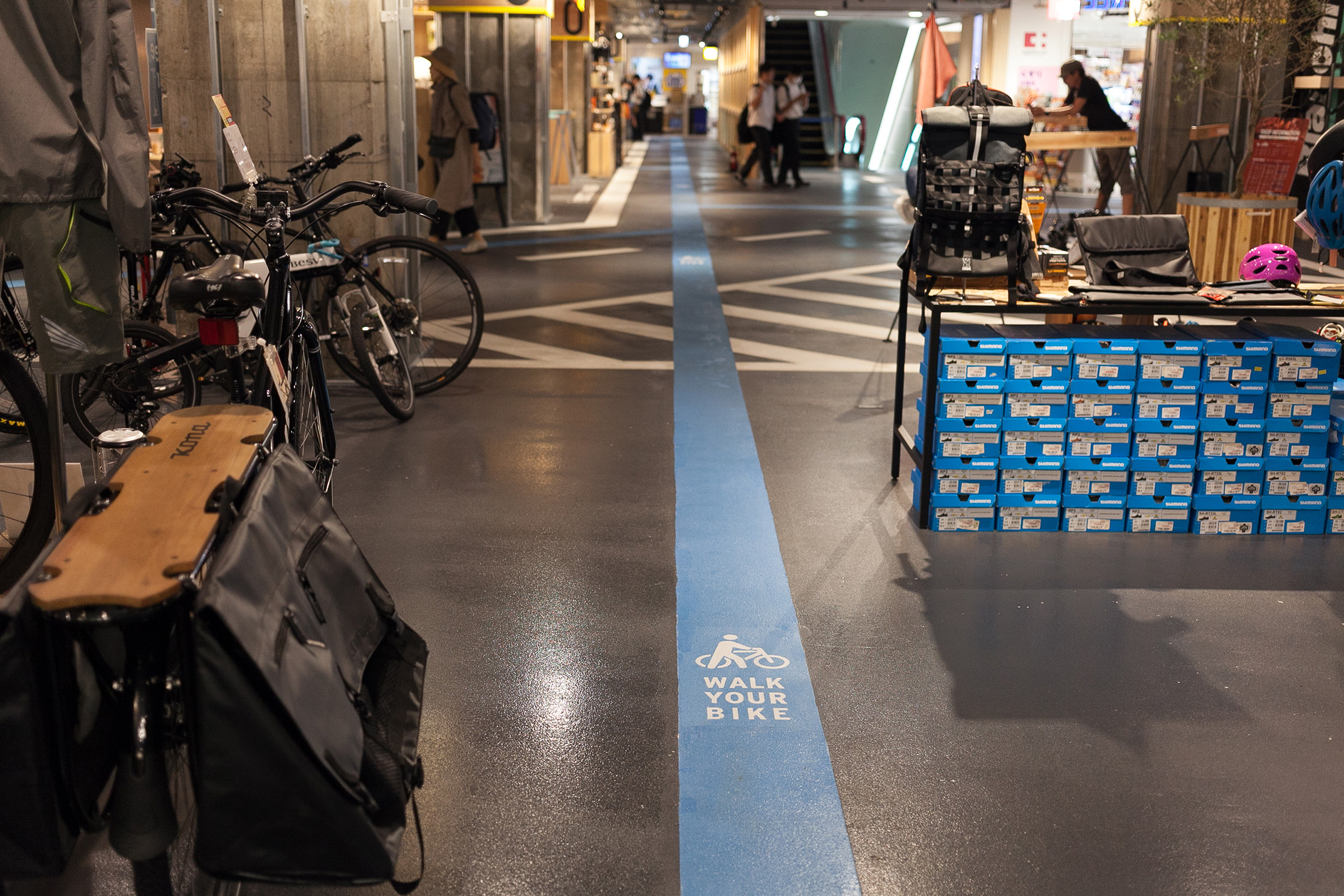 そして特筆すべきは、なんとこの施設内はすべて自転車を押しながら移動できるということ。常に愛車とともに動けるのは、サイクリストにとっては嬉しいだろう。地下1階には荷物を預けるコインロッカーやシャワールームや女性用のパウダールームまで完備されていた。事前に登録すれば、朝5時から深夜1時まで使えるレンタサイクルも並んでいる。地下と1階を結ぶ階段には自転車搬送コンベアもあった。