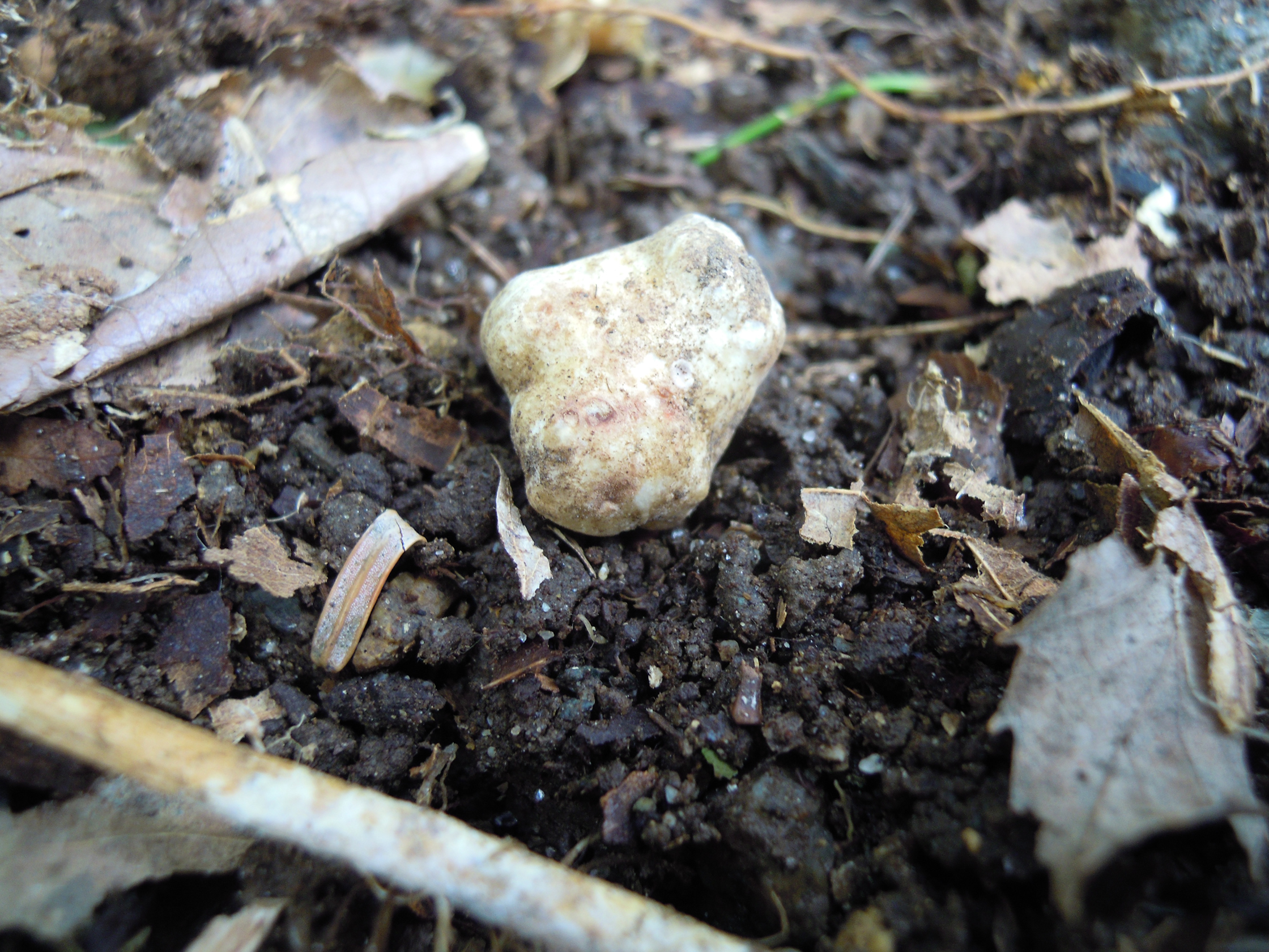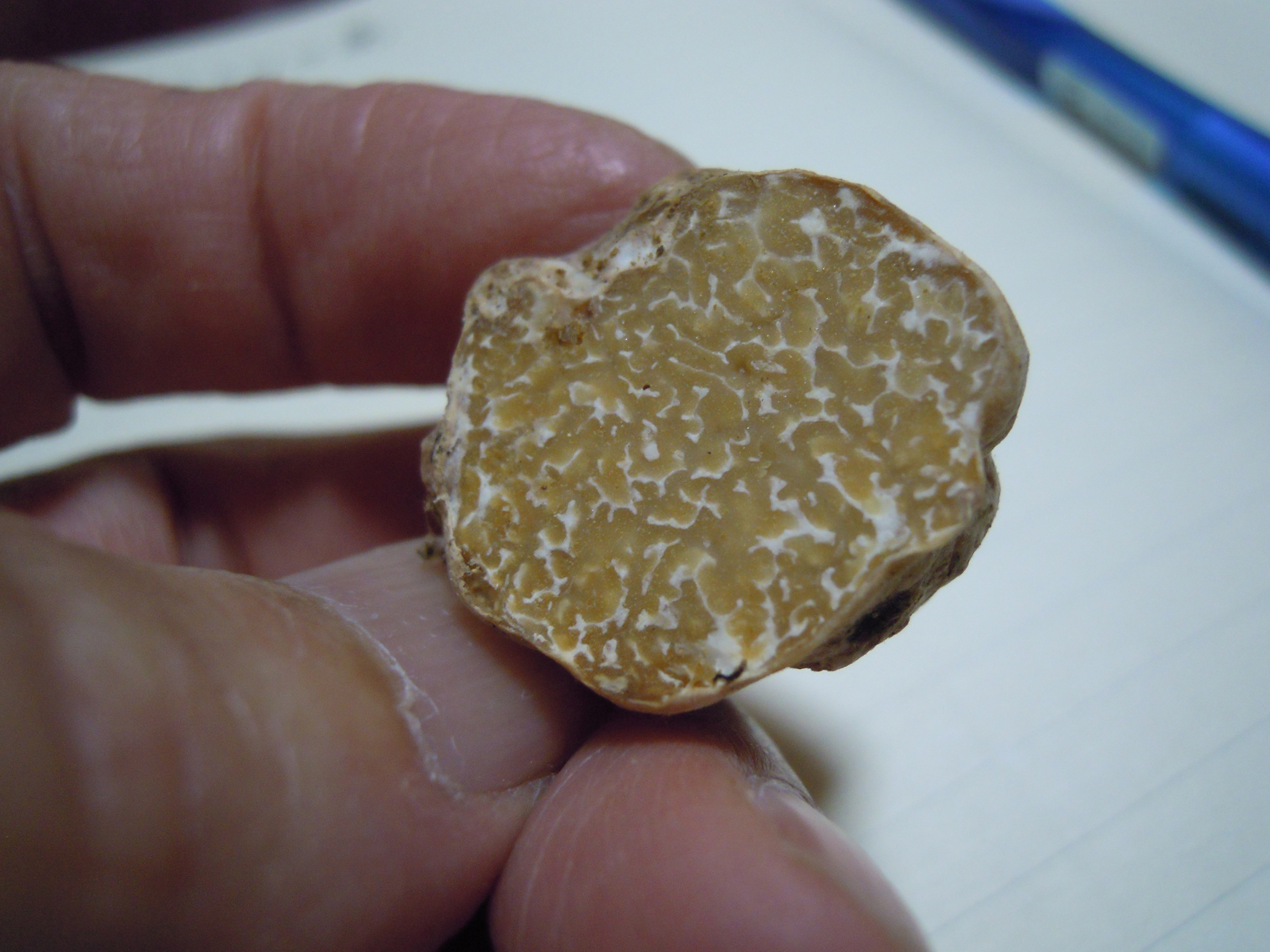 「初めて見つけたのは、会員の人なんですよ。いわきキノコ同好会の採集会前日の10月6日、イノシシが地中のミミズを探して掘り起こされた土地で、何の気なしに地面を見ていたら、石みたいなものが転がっていたと。周りは全部砂利ですよ。でもその人は目がいい人だったもんで、手に取ってみたら、ん? これは石じゃなしにどうもキノコのようだということでふたつに切ってみた。すると大理石模様が見えた。それで、もしかしてこれはトリュフじゃないかということで、7日に行われた採集会の時に持ってきたんです」