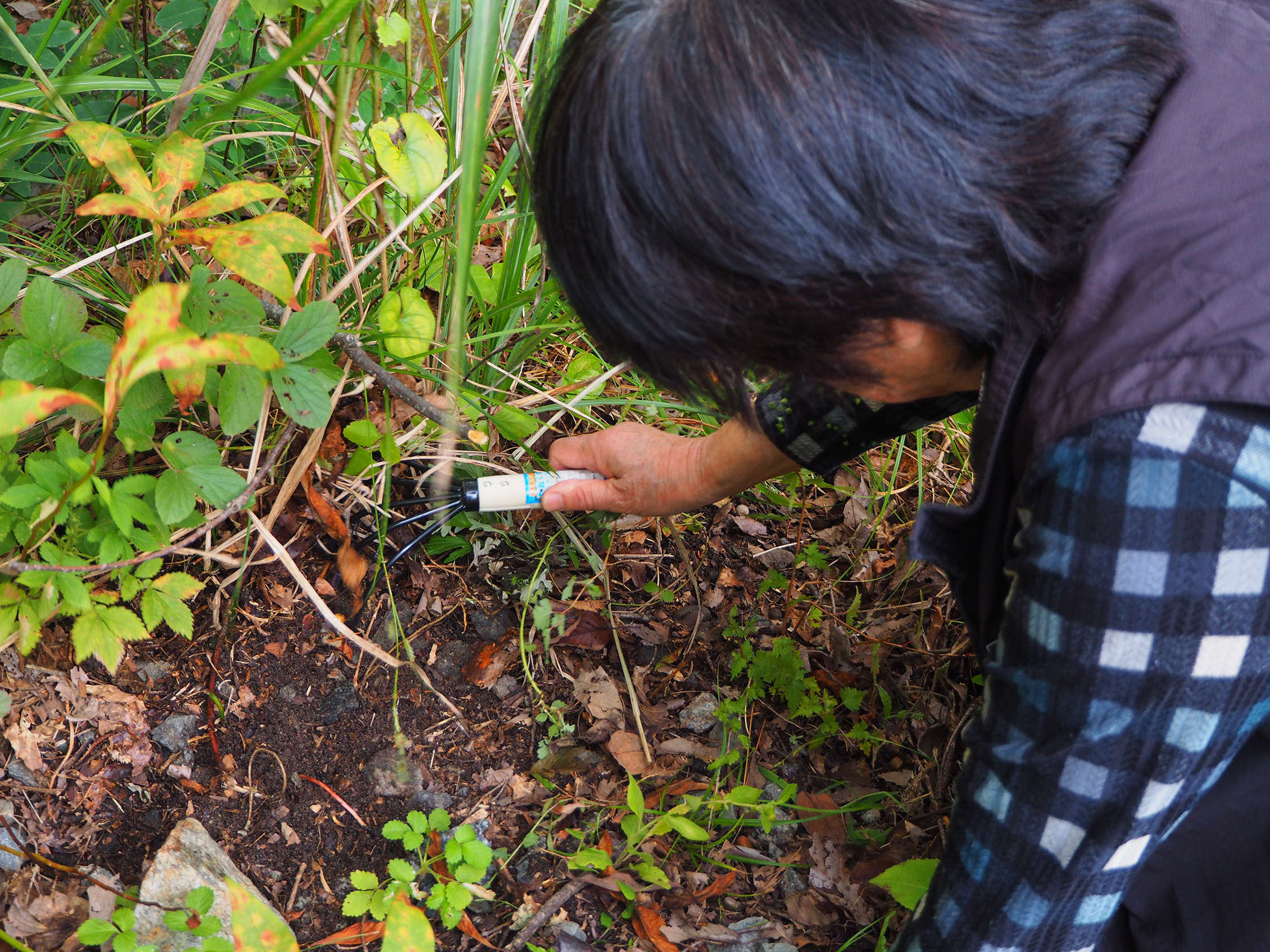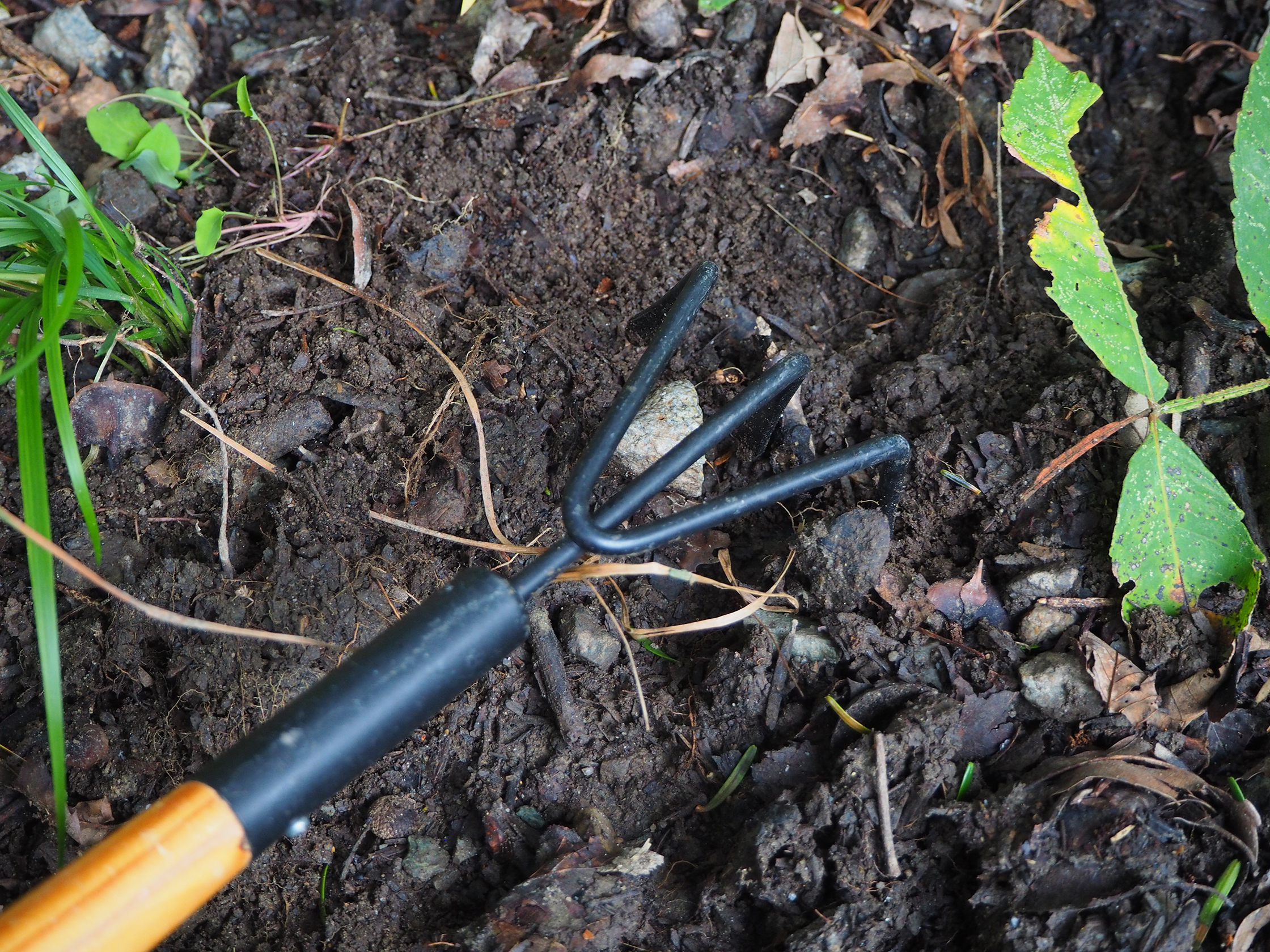 「落ち葉をそおっとどければいい」という武子さんの指示通りに、熊手で土をかく。