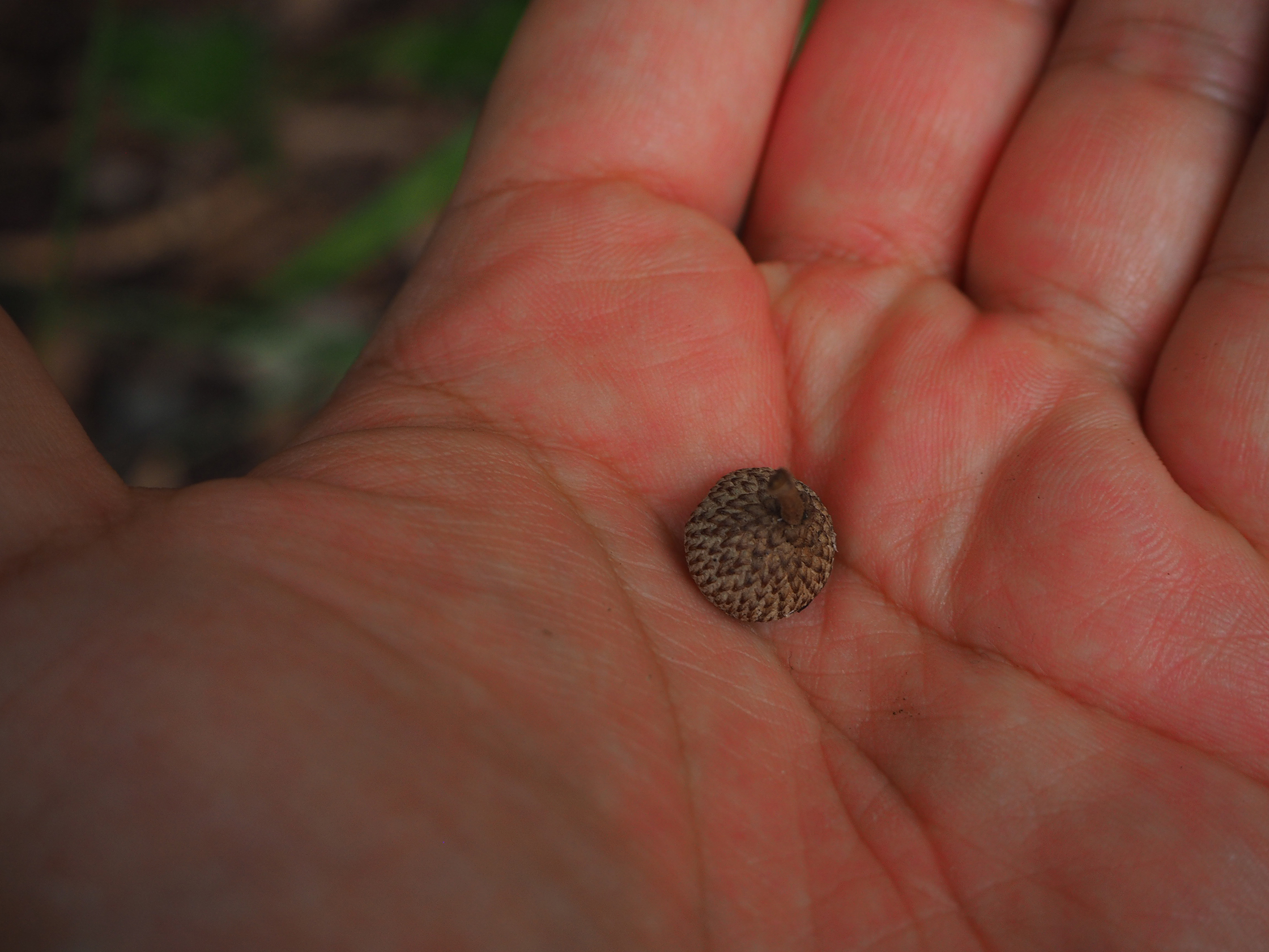 いやいや、まだまだ! 気合いを入れ直してしゃがみ込む。作業はまったく地味そのものだけど、これほどドキドキしながら熊手を振るったことがあるだろうか? いやない! 呪文のように「白い石ころ」「固まったおもち」「コロリと出てくる」と繰り返していたら、また怪しき物体が落ち葉の下から顔を出した! ムム!! これは僕が知っているトリュフの見た目にそっくり……もしや!!! と思って指でほじくりだしたら、ドングリの殻斗、いわゆるドングリ帽子だった。なんて紛らわしい!
