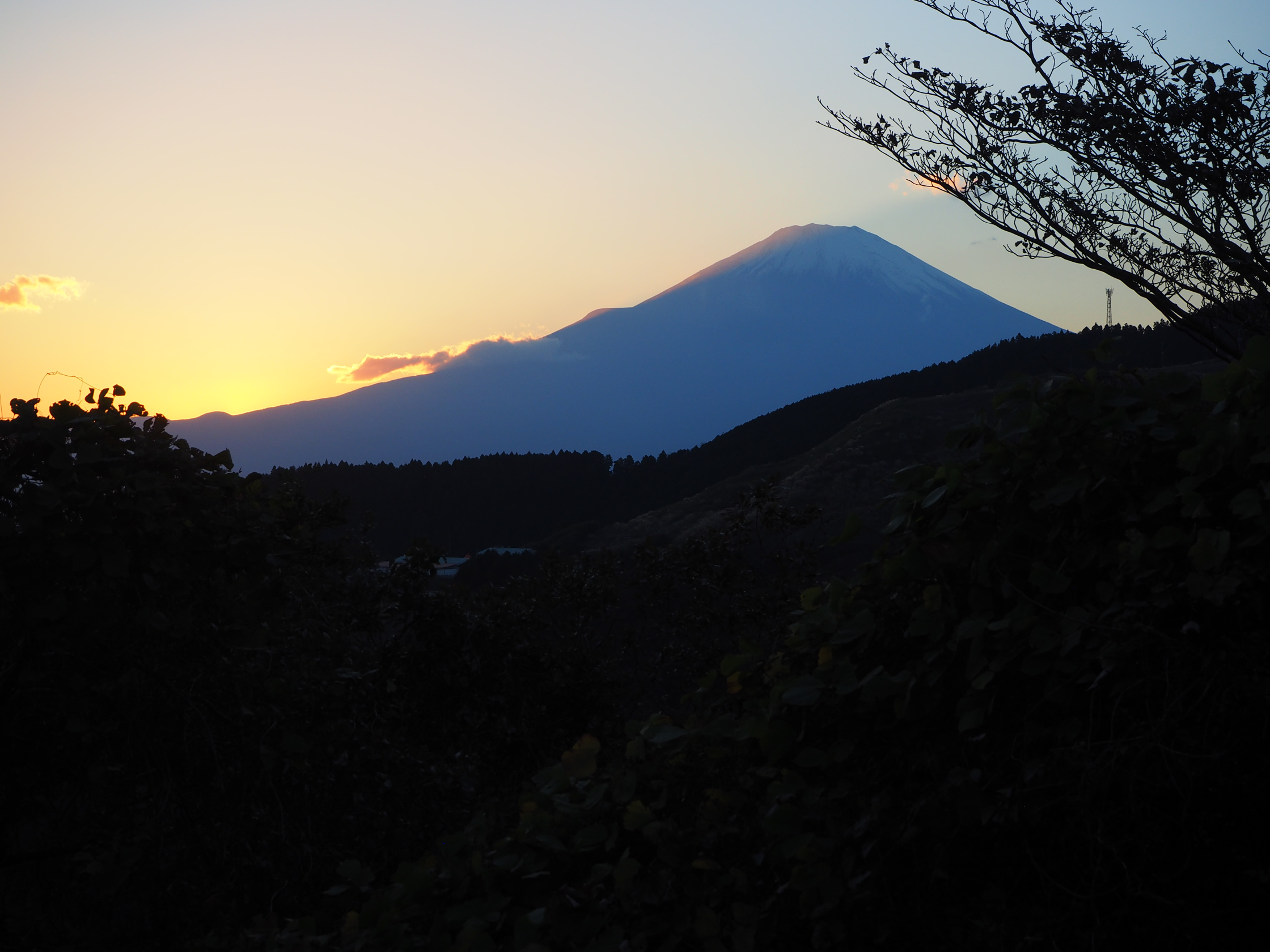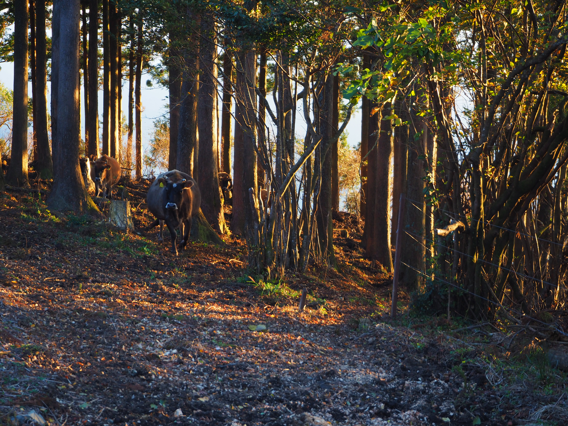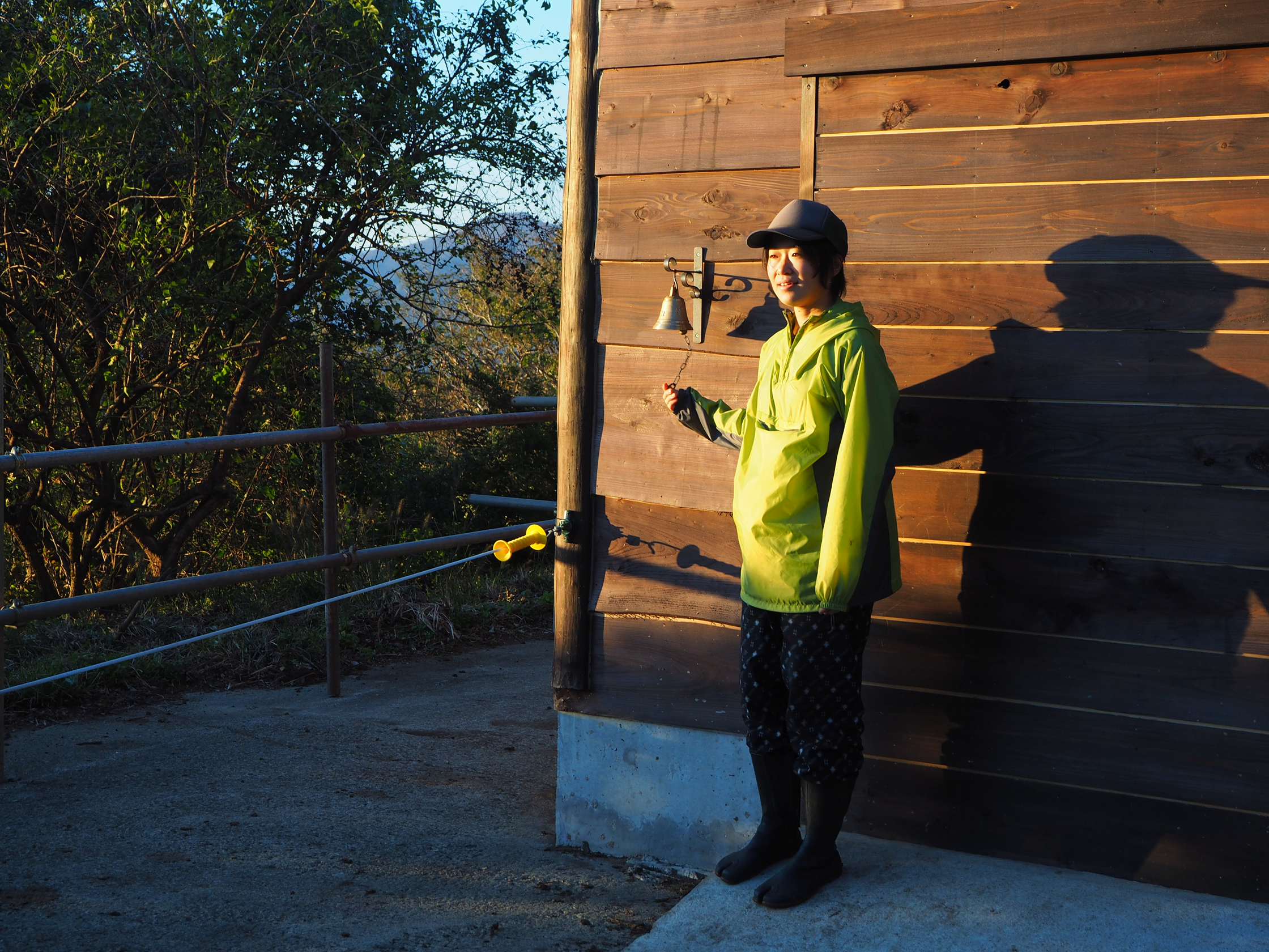 10月末の16時過ぎ。標高723メートルの大野山の山頂付近にはひんやりとした風が吹き、牧場からドカーンと見える富士山が茜色に染まり始めた。島崎さんは搾乳室の外側につけられた鐘を鳴らしながら、「こー、こー」と声を上げると間もなく、林のなかから5頭の牛がぞろぞろと現れた。