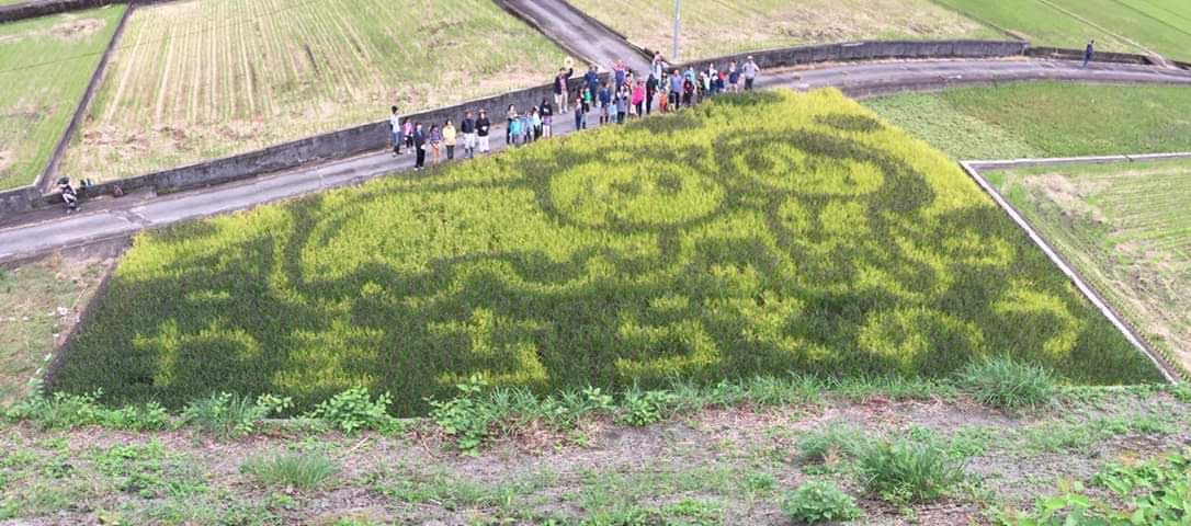 ソフトクリームを販売しているやまきたさくらカフェのご主人、山田さんと同じように「薫ちゃんを応援したい」という人の輪がどんどん広がっているのだろう。それがよくわかるのが、大野山の麓の田んぼで一昨年から始まった田んぼアート。なんと今年は田んぼに島崎さんと牛の絵が描かれ、ひらがなで「やまちらくのう」と記されたのだ。