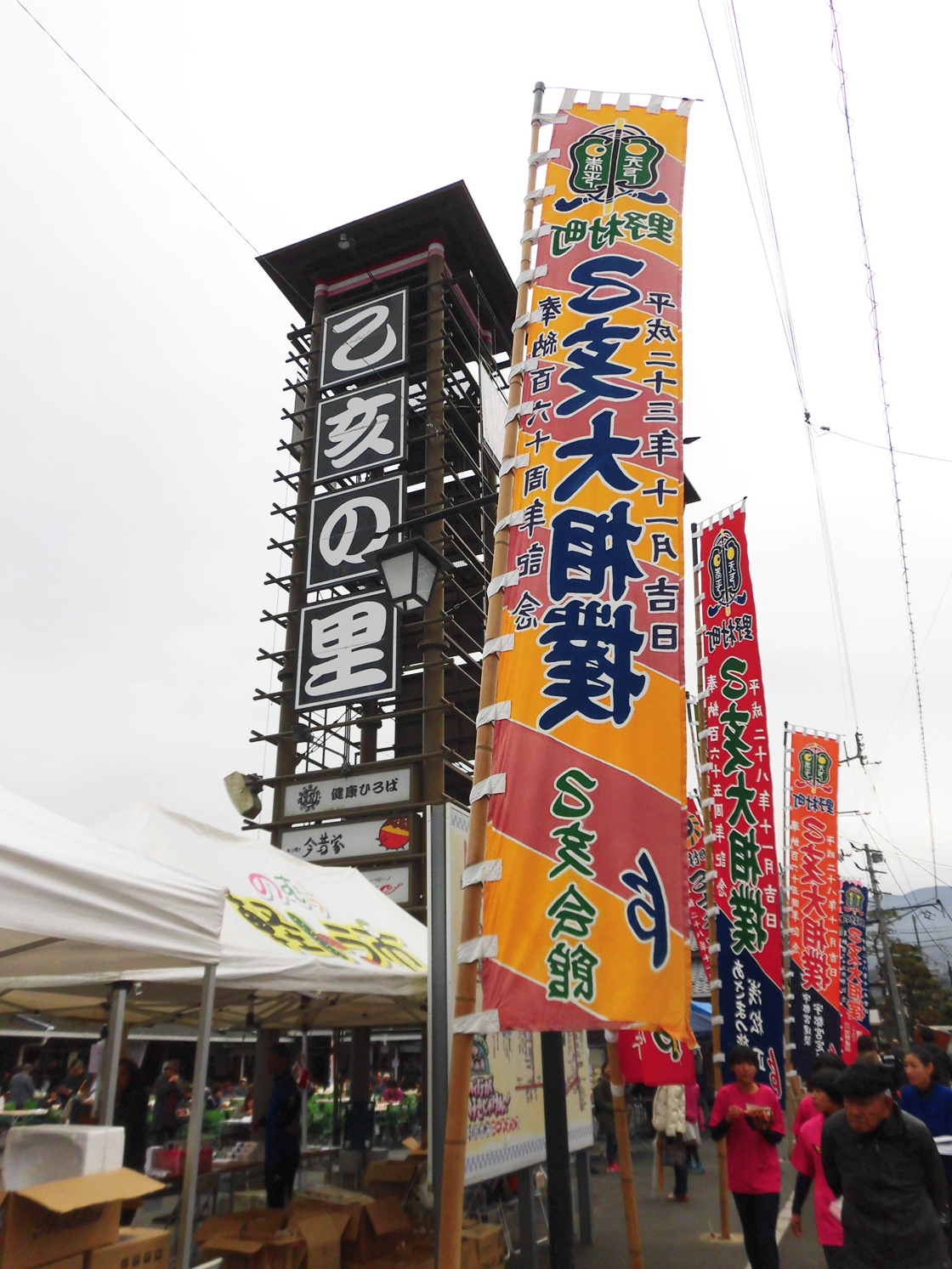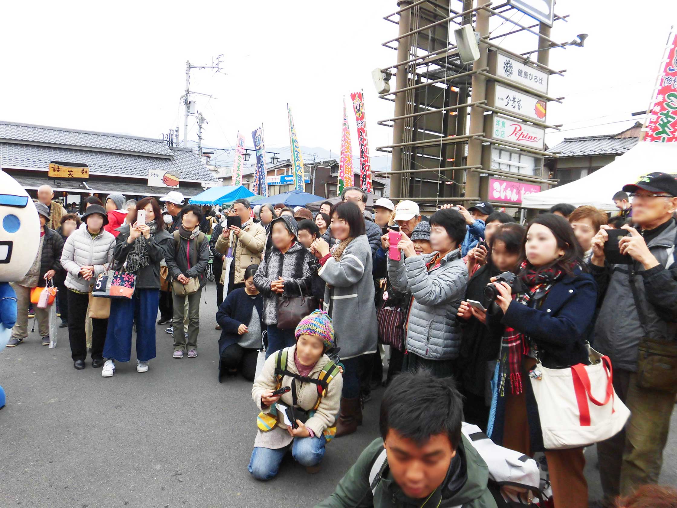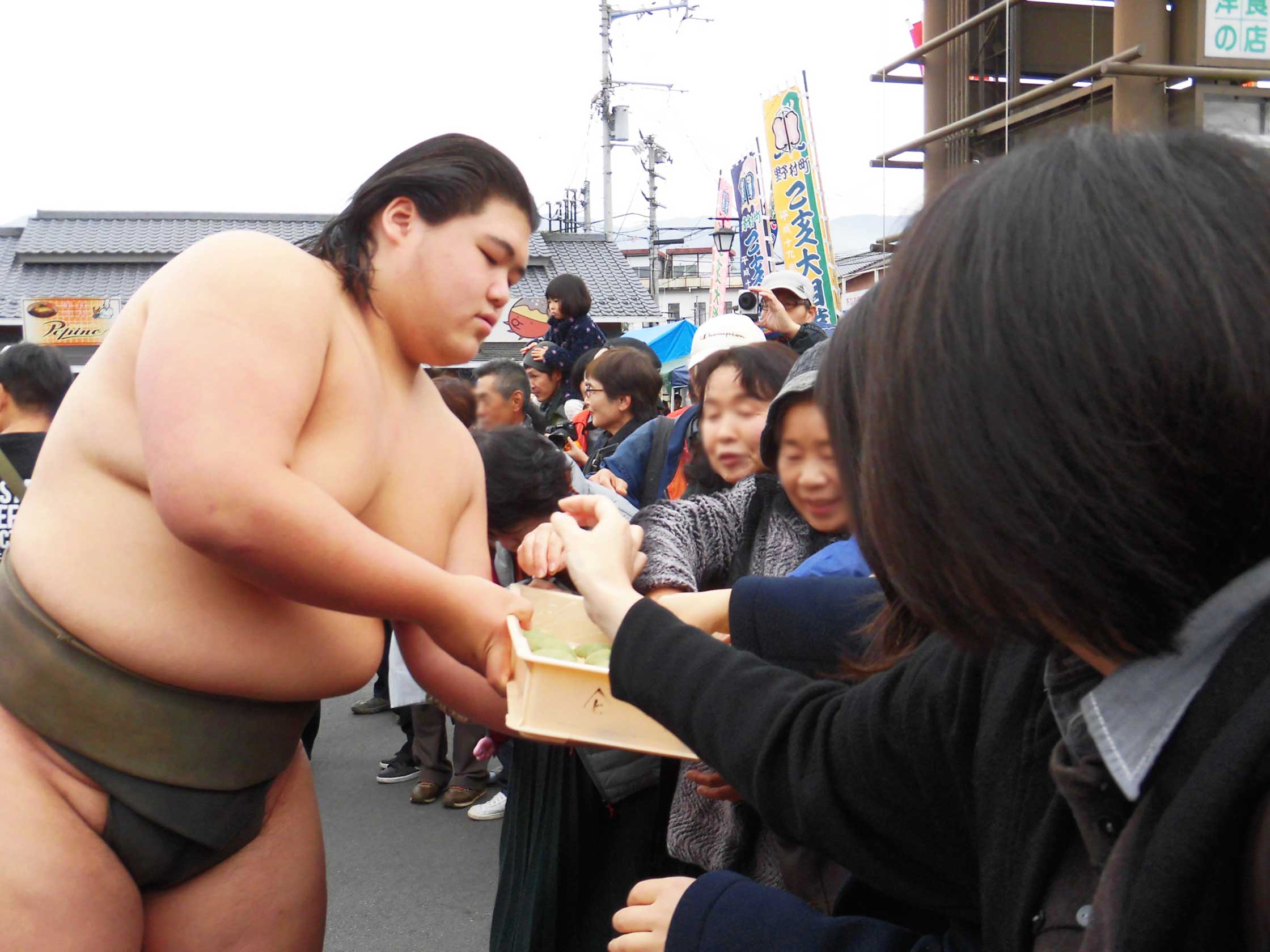 会場の「乙亥会館」に到着すると、すでに会館前の広場には大きな人だかりが。慌ててその輪に加わると、この2日前まで九州場所を沸かせていた大相撲の力士たちが餅つきをしているではないか! なんと、昭和の大横綱・大鵬の孫の納谷(なや)が餅をつき、朝青龍の甥っ子の豊昇龍(ほうしょうりゅう)が「ヨイショヨイショ」とかけ声をして沸かせている。二人は未来の横綱候補! スー女のテンションはいきなりマックスに上り、町の人たちもスマホをかざして大騒ぎだ。つきあがった餅を二人が配り始めると、ダダッと駈け寄る町の人たち! さすが相撲の町、立ち上がりが速い! 一瞬で餅はなくなった。