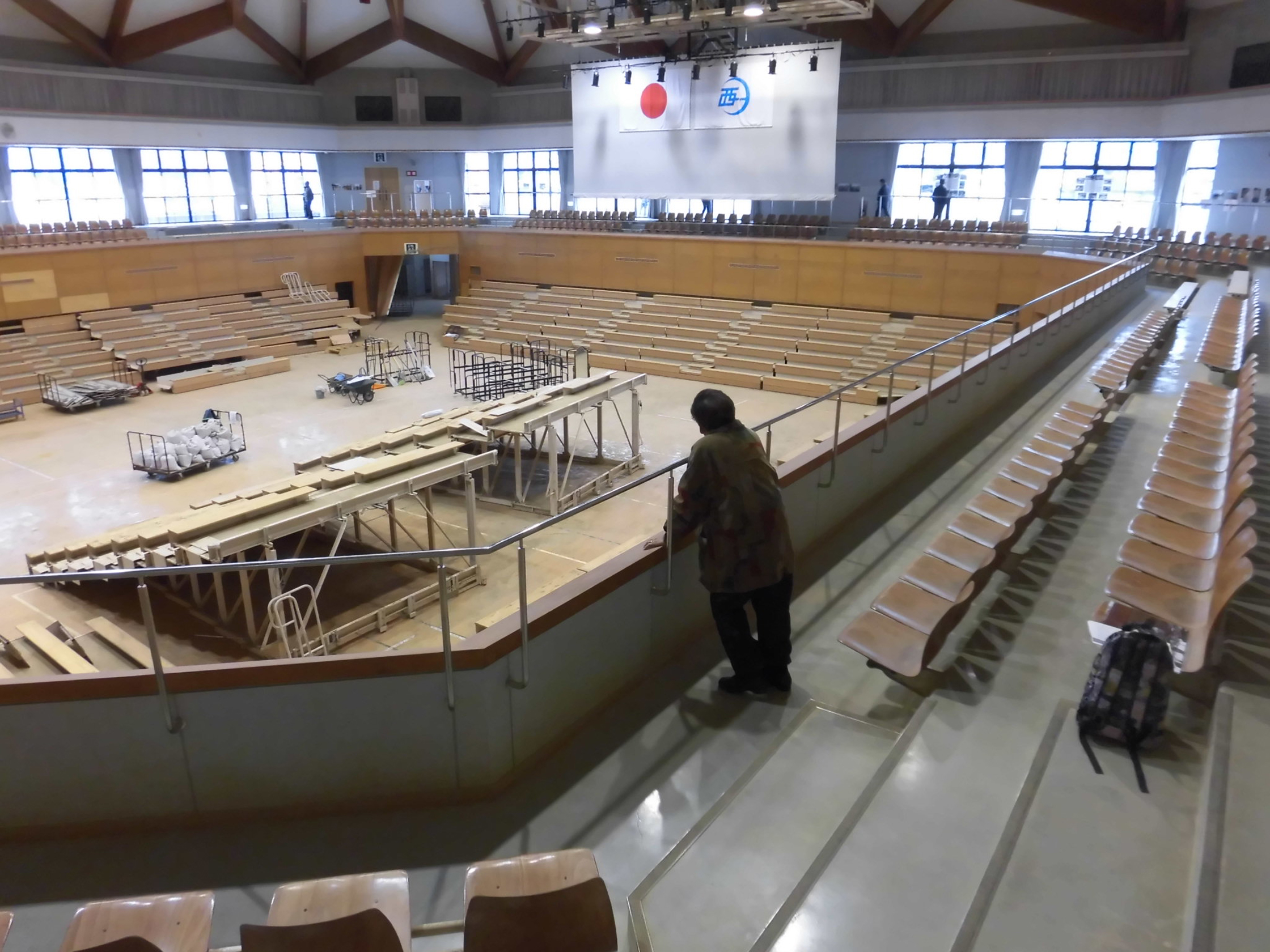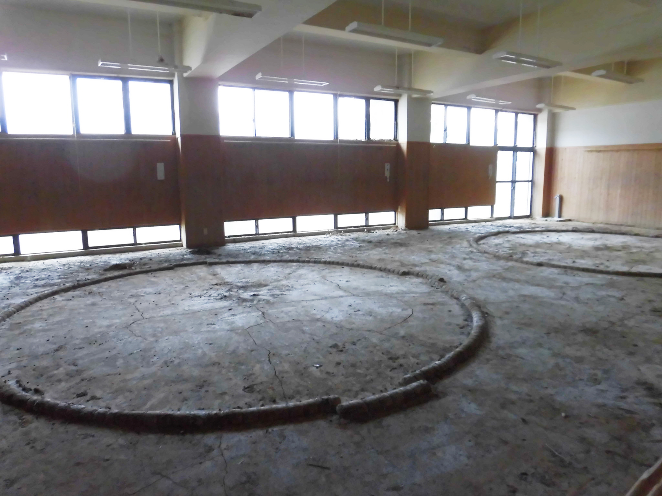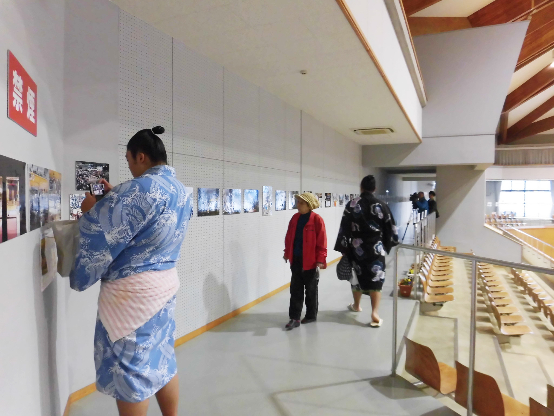 餅の争奪戦に敗れて乙亥会館に入った。ここは2005年に建てられた、立派な土俵と桟敷席、さらには相撲の稽古場もある町のシンボル的建物。近年の乙亥大相撲はここで大々的に開かれてきたが、中に入って7月の豪雨の爪痕をまざまざと見せつけられることになる。1階にあった土俵は跡形もなく、地下にあった相撲稽古場は泥だらけ。壁は破れ、天井まで泥水が残した跡が付いている。今年の乙亥大相撲はここでの開催はならず、代わりに水害と復興の様子を撮った写真展「コノ夏ノ野村ノコト」が開かれていた。さっきまで明るく餅つきをしていた若い力士も、神妙な面持ちで写真を見つめいている。ここは7月から時間が止まったかのようだ。