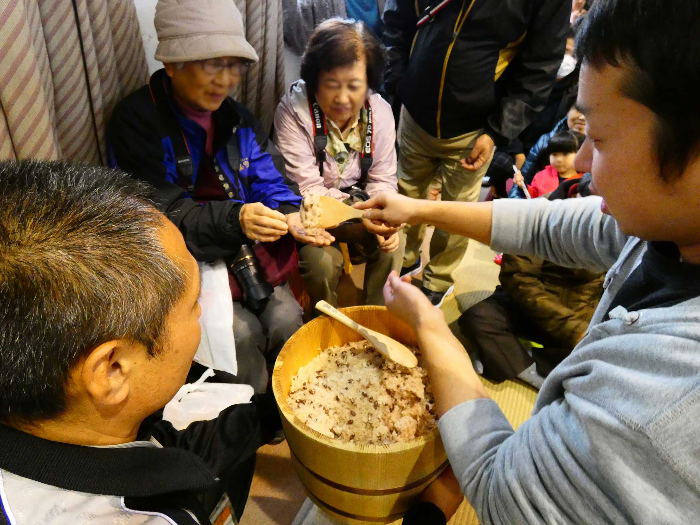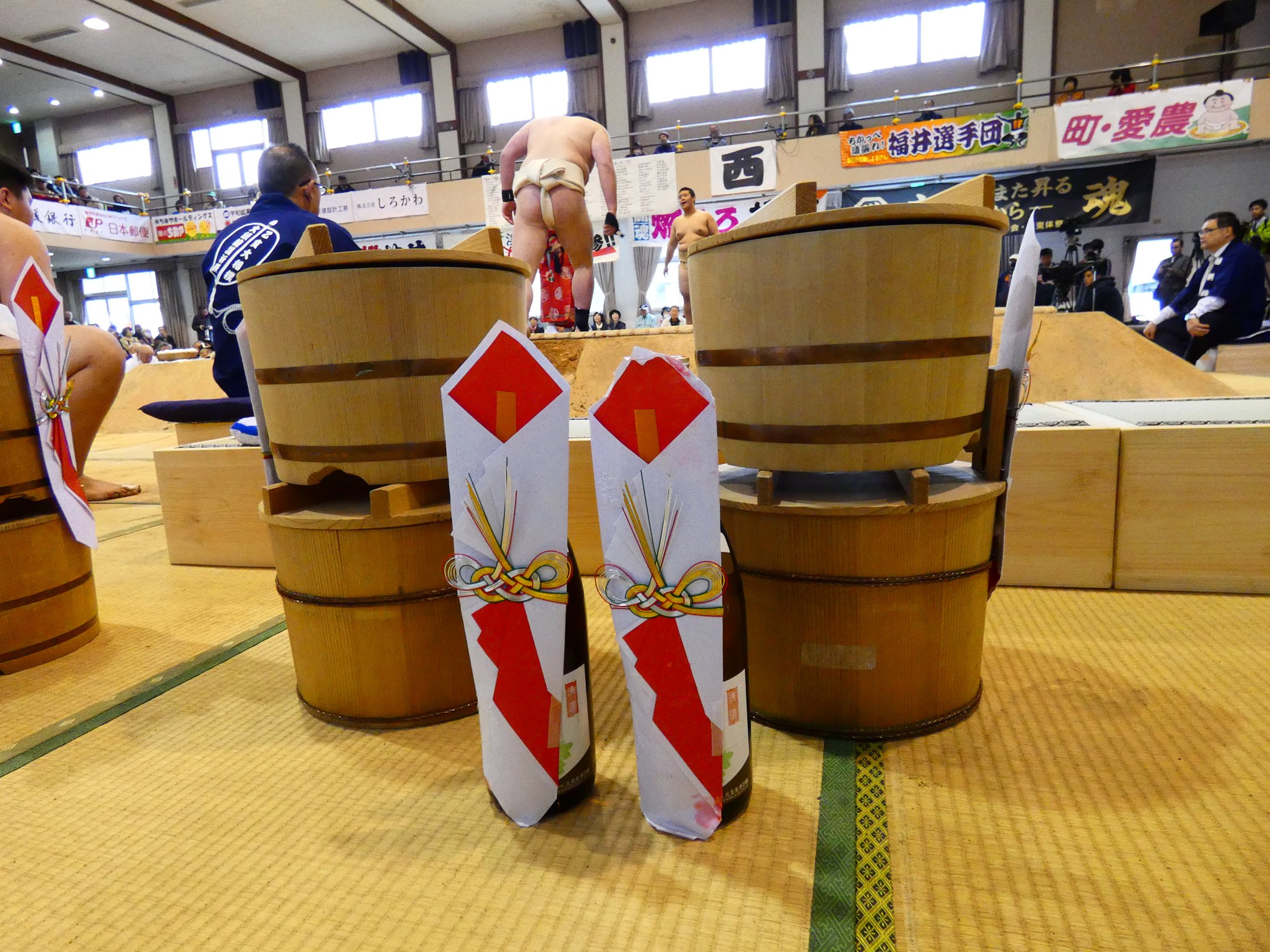 取組の合間には「力飯(ちからめし)」と「御樽(おんたる)」がお客さんにふるまわれる。それを頂くと、これから一年元気で暮らせる縁起物だというから私も手を伸ばした。お赤飯と日本酒。おいしー!