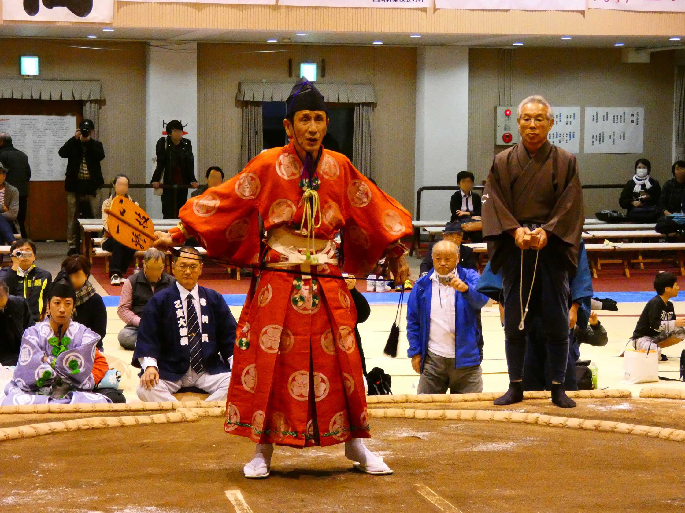 そうこうするうち、椅子に座って一休みする行司さんを見つけた。大相撲と同じ行司の装束を着て、伸びやかな声で堂々と務める。実は乙亥のドンじゃないのか?と思って声を掛けると、