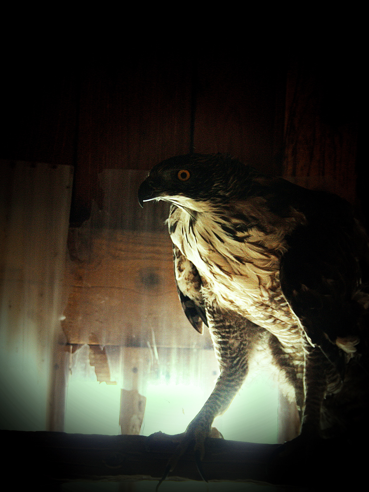 鷹はすごく神経質なので明るいと小屋の中を飛んだり、人間を警戒するわけですけど、暗いと目が見えないから、おとなしくなる。