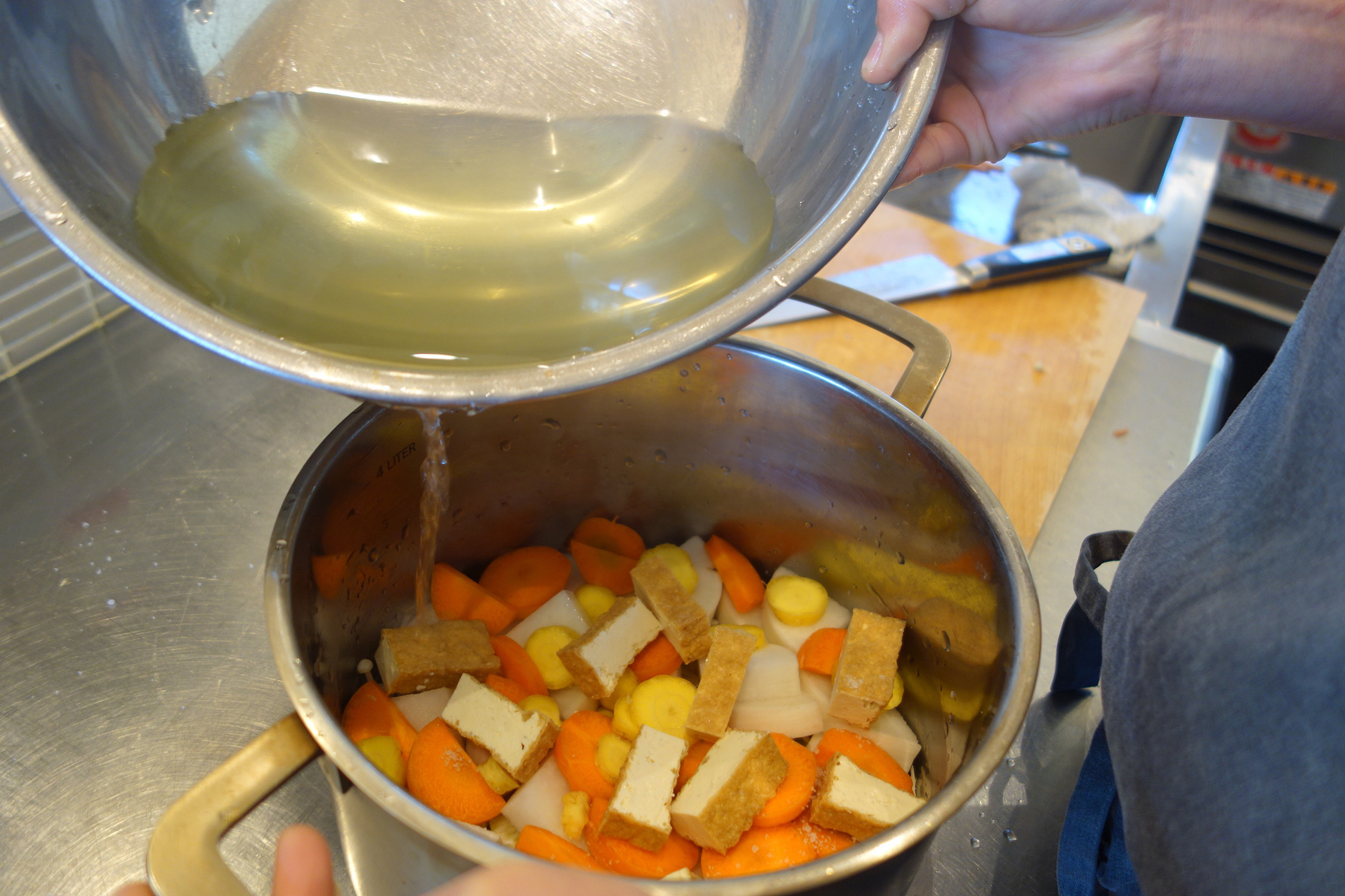配られたプリントには、「大切にしたいこと」として「一物全体(まるごと使う)」「身土不二(地産地消)」「引き算の調理、調和の調理」と挙げられている。たとえば、この日の最初の体験は、ほんの数cmの湯を沸かして茹でる青菜の味の違い。