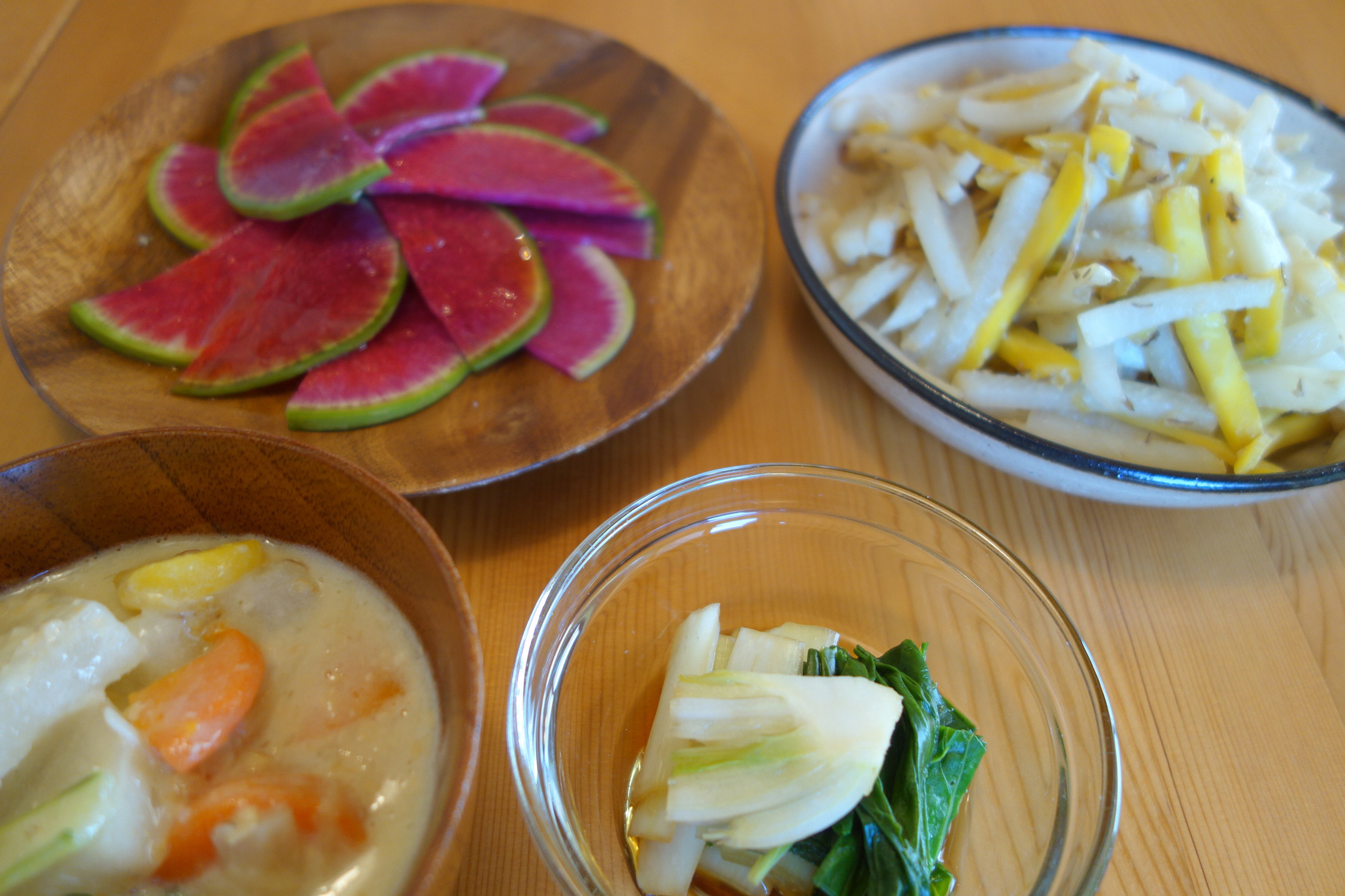 「まるふのお宿や食堂の料理は、農家だからこそ育てた野菜をなるべく無駄なく、おいしく。だから料理教室といっても、伝えたいのはコツや考え方なんです。とくに流儀があるわけではないのですが、こちらに来てからマクロビオティックを習ったらすごく合理的で。その考え方をベースにしたり、重ね煮という手法を取り入れたりしています」(藤巻さん)