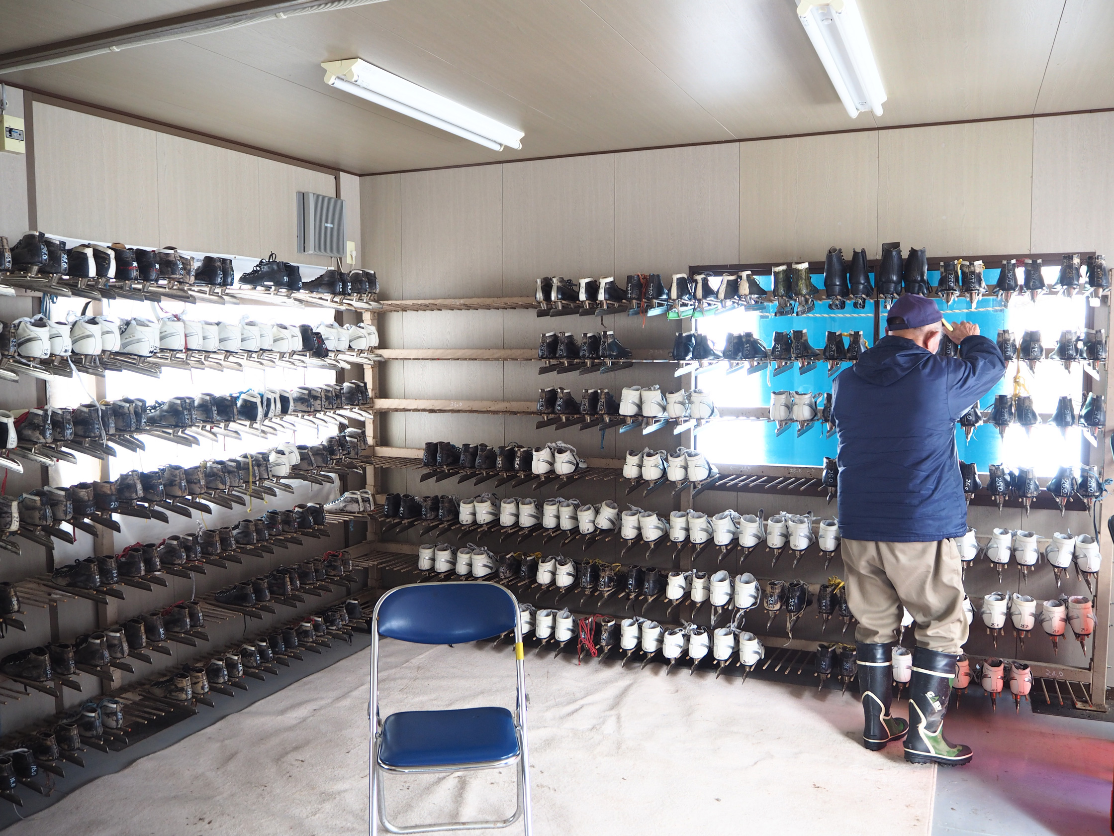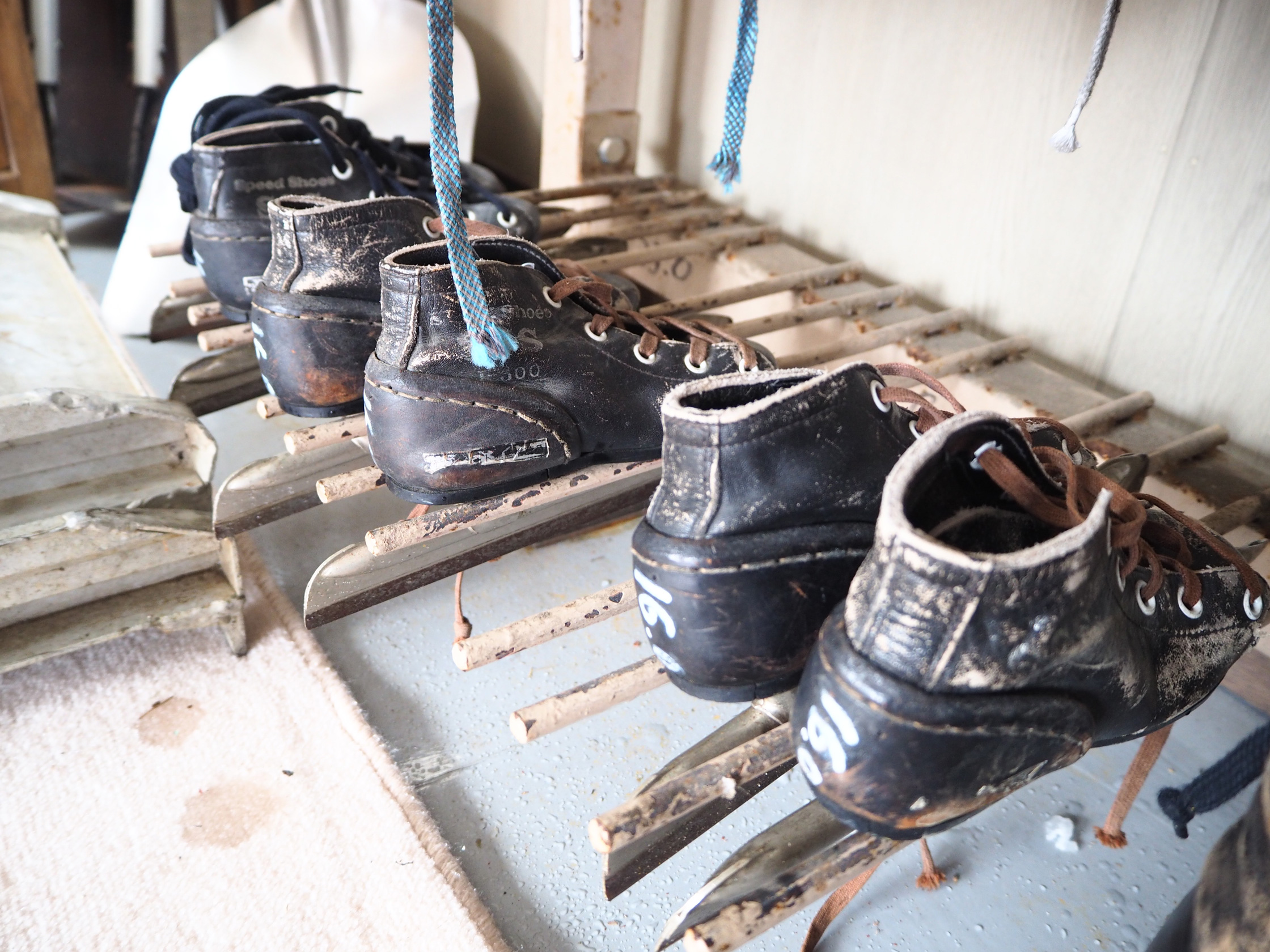 「僕がかかわるようになったのは1991年から。自分の子どもを連れてきたのがきっかけでね。ここに16センチの靴があるでしょ。この小さなやつを履かせたんだ。ここにあるスケート靴は、36年前から使っているものもあるんだよ。今はもう売ってない形だね。山木屋の子どもたちはみんなここでスケートの授業を受けているから、もうパパ、ママになっているのもみんなちゃんと滑れるんだよ」