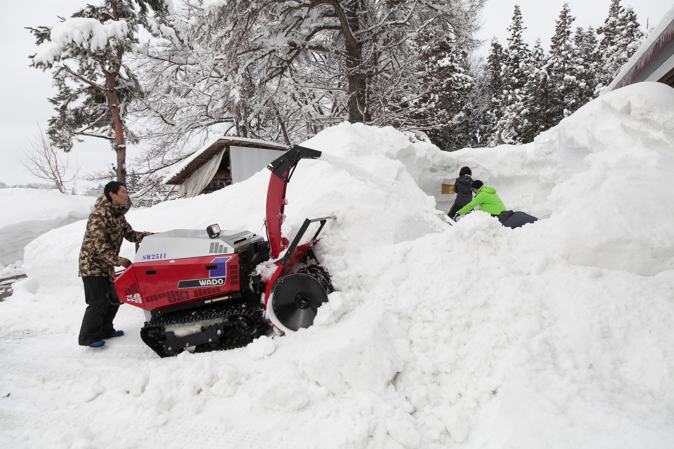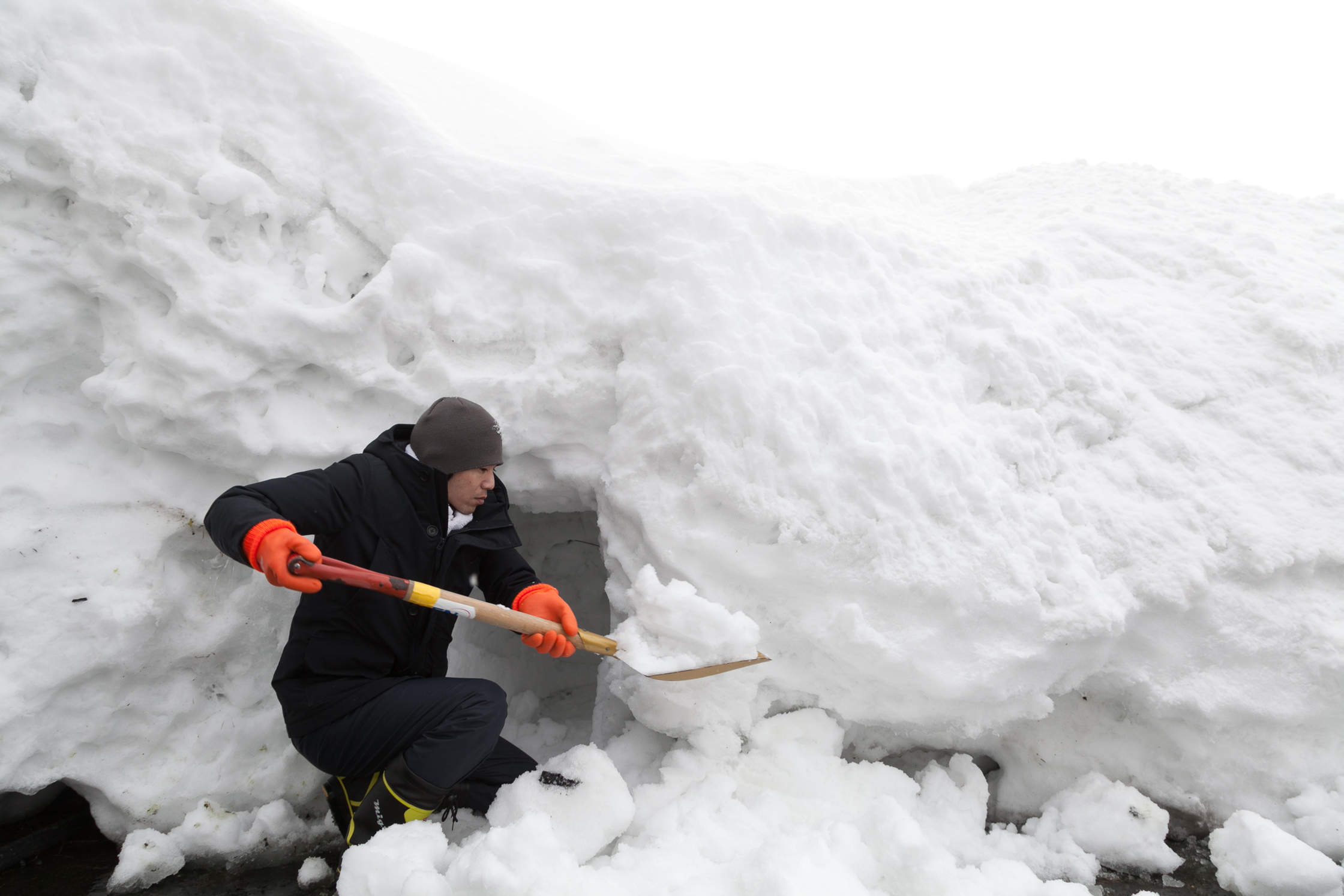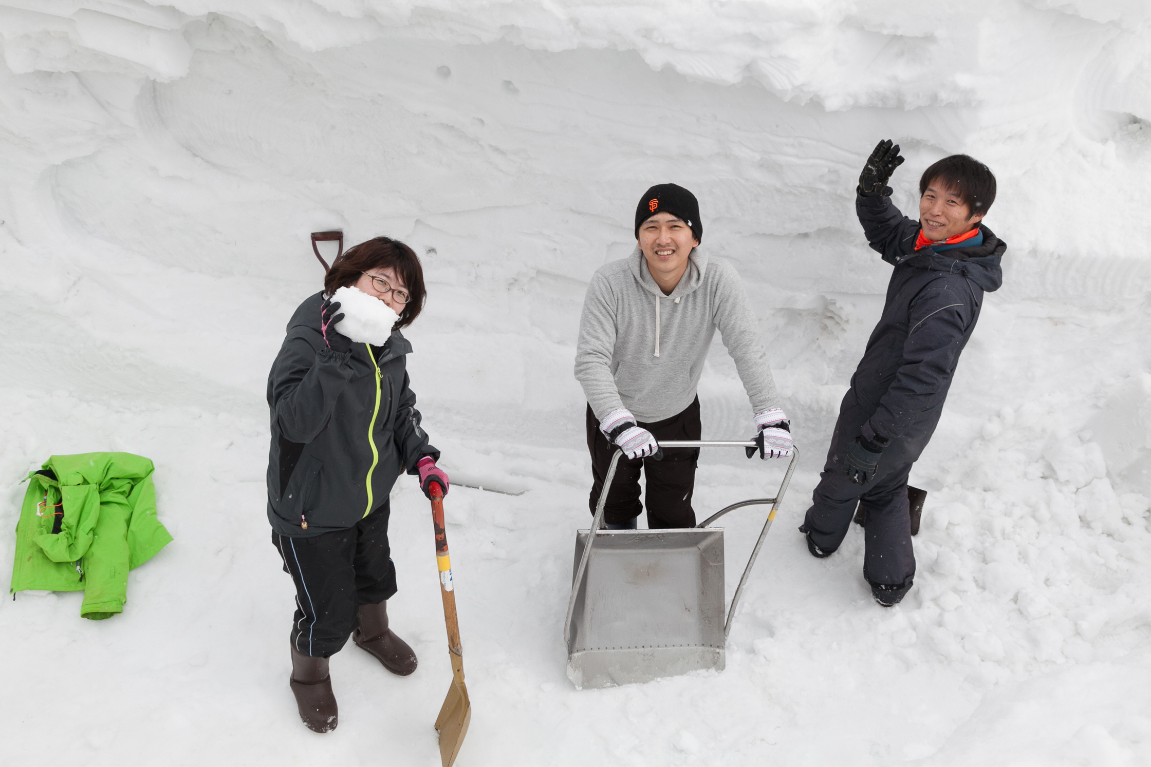 ほんやら洞はまず降り積もった雪を割るようにして雪かきし、できた空間の手前に、投雪機で雪を投入して壁を作る。中に残った人たちがさらに雪を掘って、空間をおし広げていく。