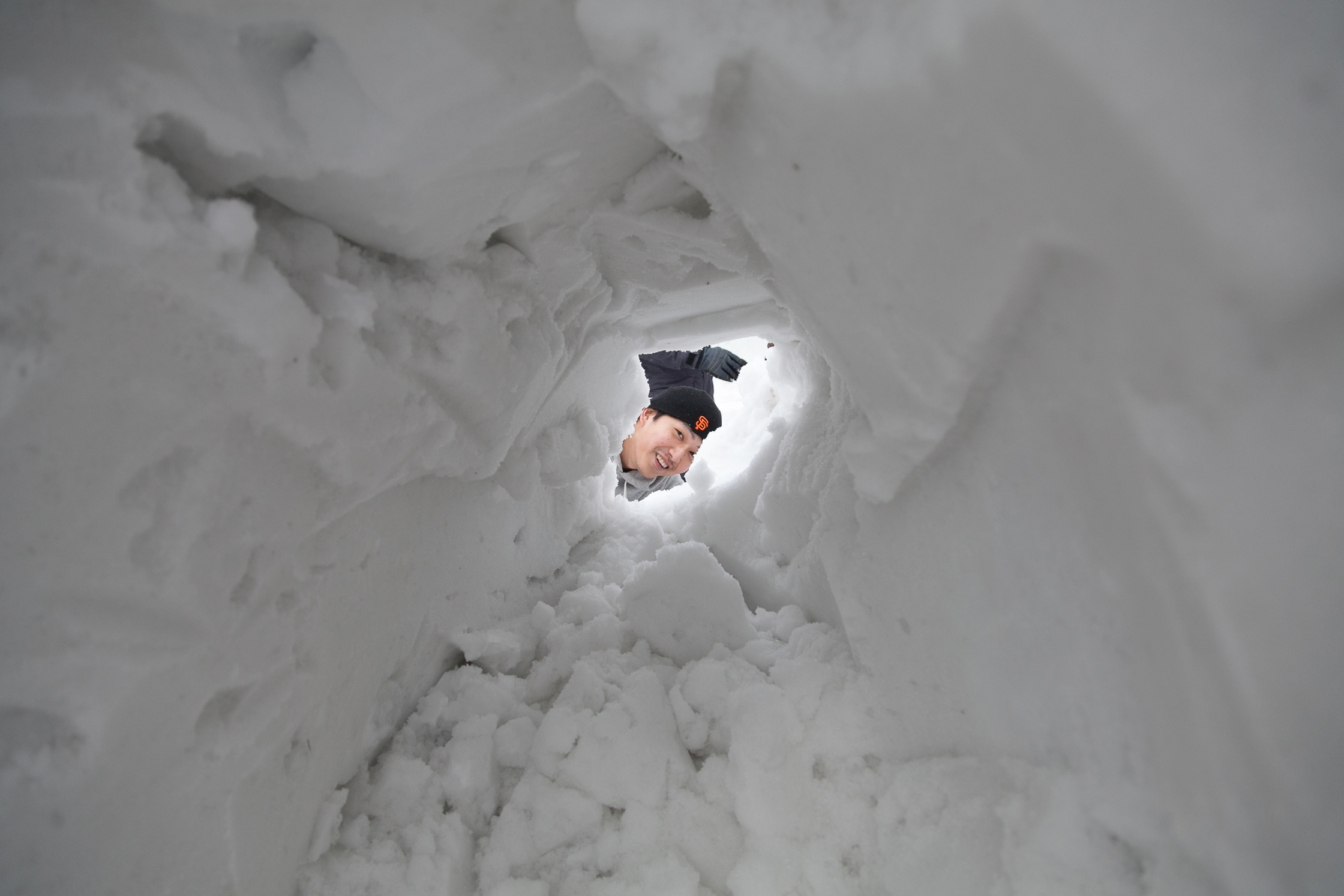 そして手前に作った壁に、今度は外側から入り口を開けていく。杉崎さんが雪をかいていくと雪の壁がうっすらと明るくなった。最後にひとかきすると中で作業していた、池谷集落の地域おこし協力隊員、安藤さんの笑顔が見えたのであった!
