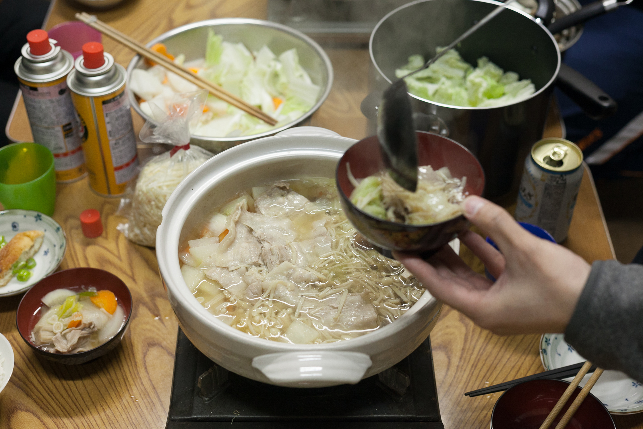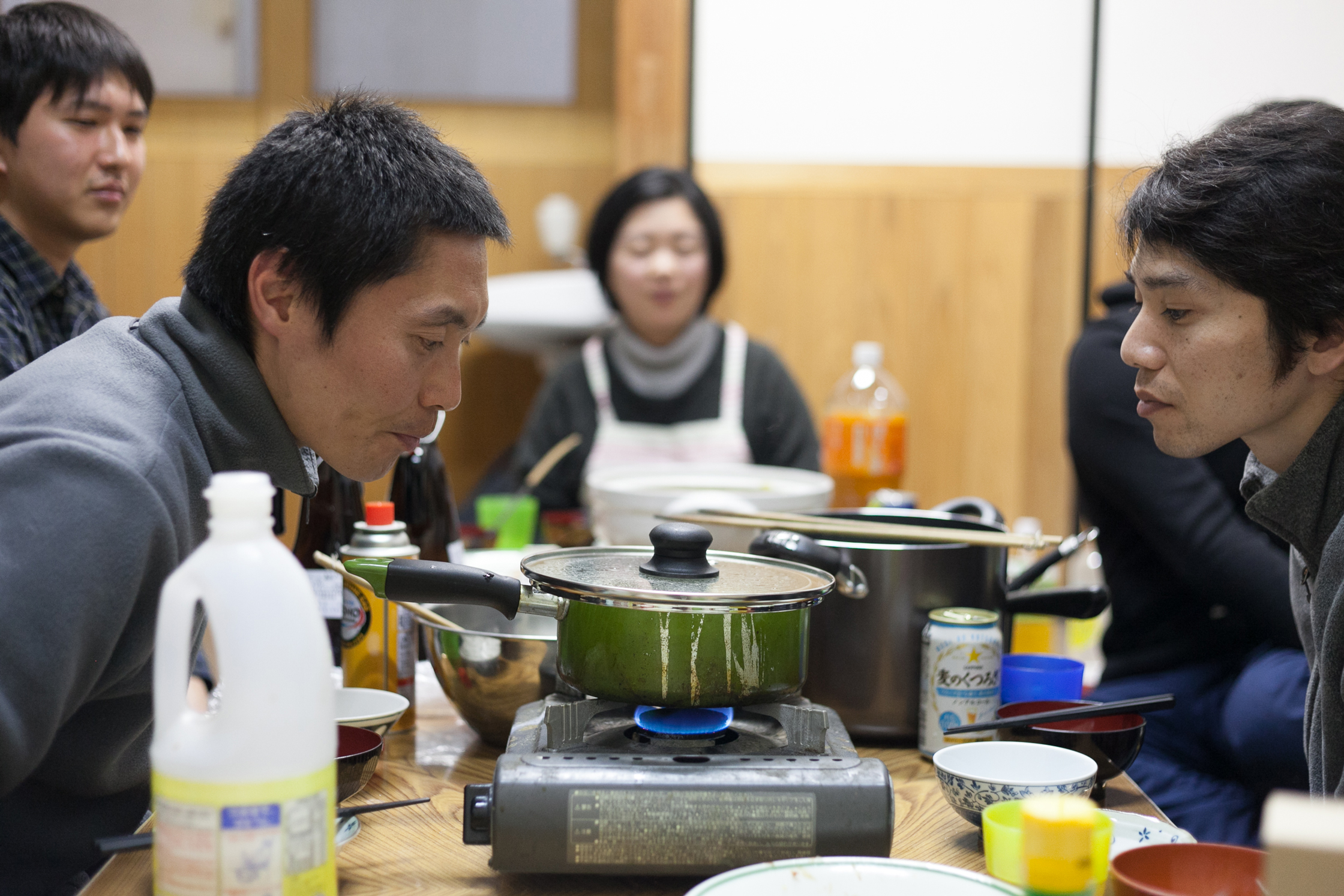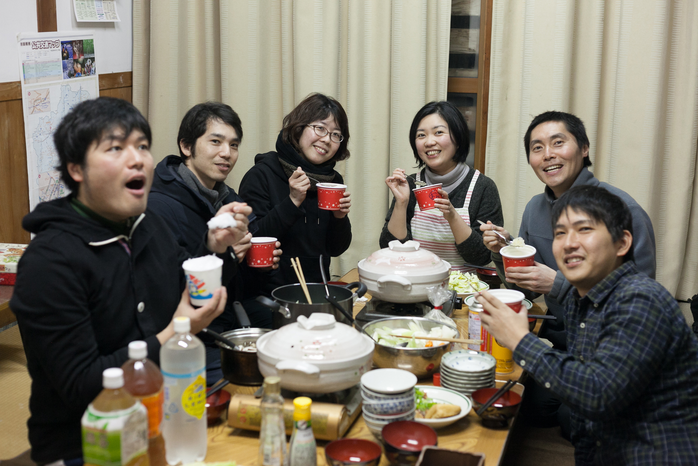 そして体が冷えた頃に、美佳さんが用意してくれた鍋をみんなでいただいた。 地元産の野菜や豚肉、地ビール……と新潟の美味しいものが、これでもかと並んだおいしい晩御飯だ。なによりお米が美味しい。このお米は「山清水米」と名付けて、池谷集落に元々住む農家と 多田さんや安藤さん、NPOのインターンがきっかけで移住し、 農業を学んでいる森さんたちがこの集落で作っているブランド米なのだ。今は分厚い雪の下だが、雪が解けて春になれば、この集落には美しい棚田の風景が広がるのだという。