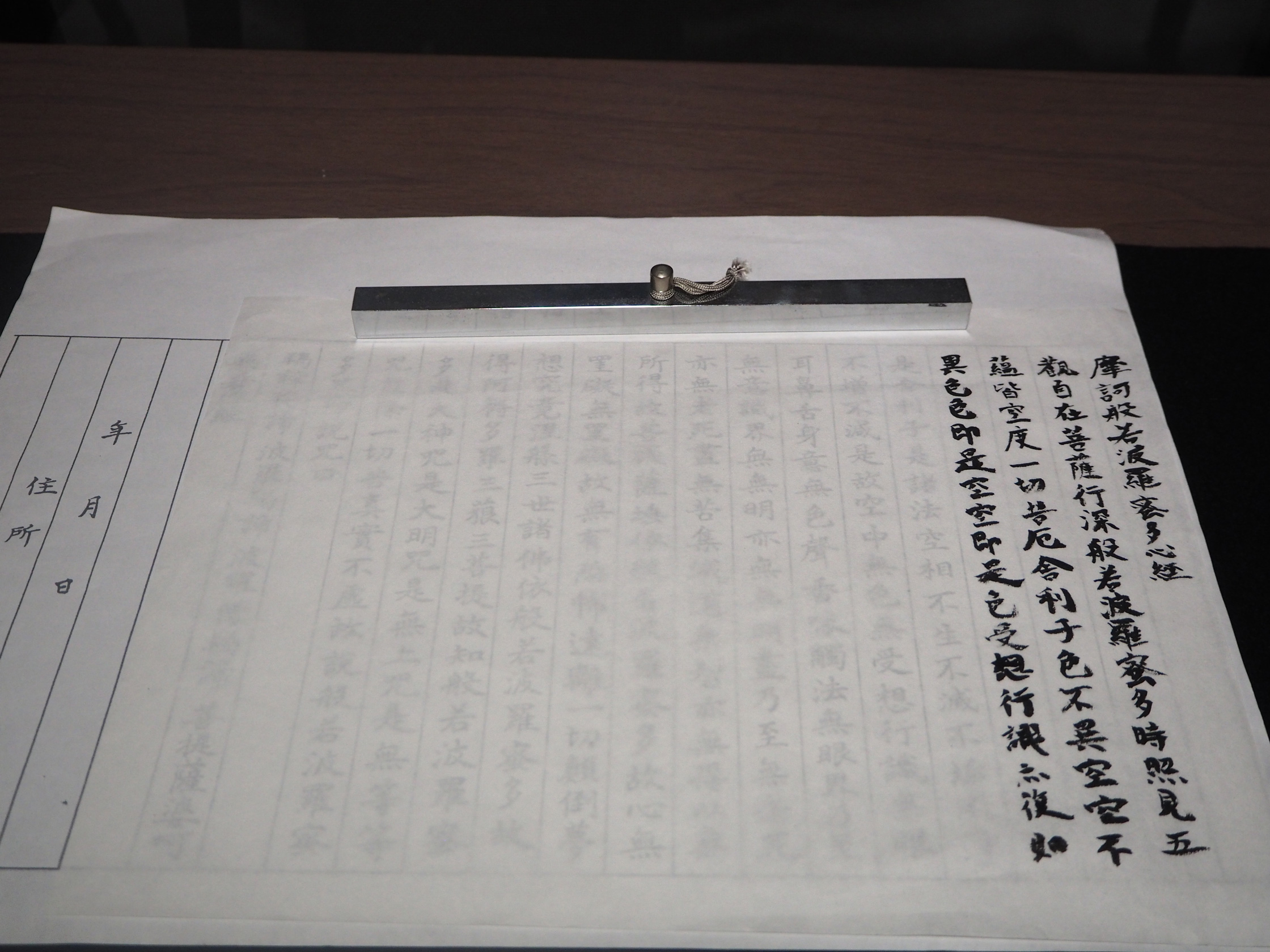 この部屋では、写経や写仏も無料で体験できる。僕はなんでもやりたがりなので、初めての写経、写仏に挑んだ。やり方は簡単。お手本の上に薄い紙を敷いて、筆でなぞるだけだから誰でもできる。でも、感想を一言でいえば、意外なほどに難しい。集中していないとすぐに筆がぶれて、無様な字やラインになってしまう。