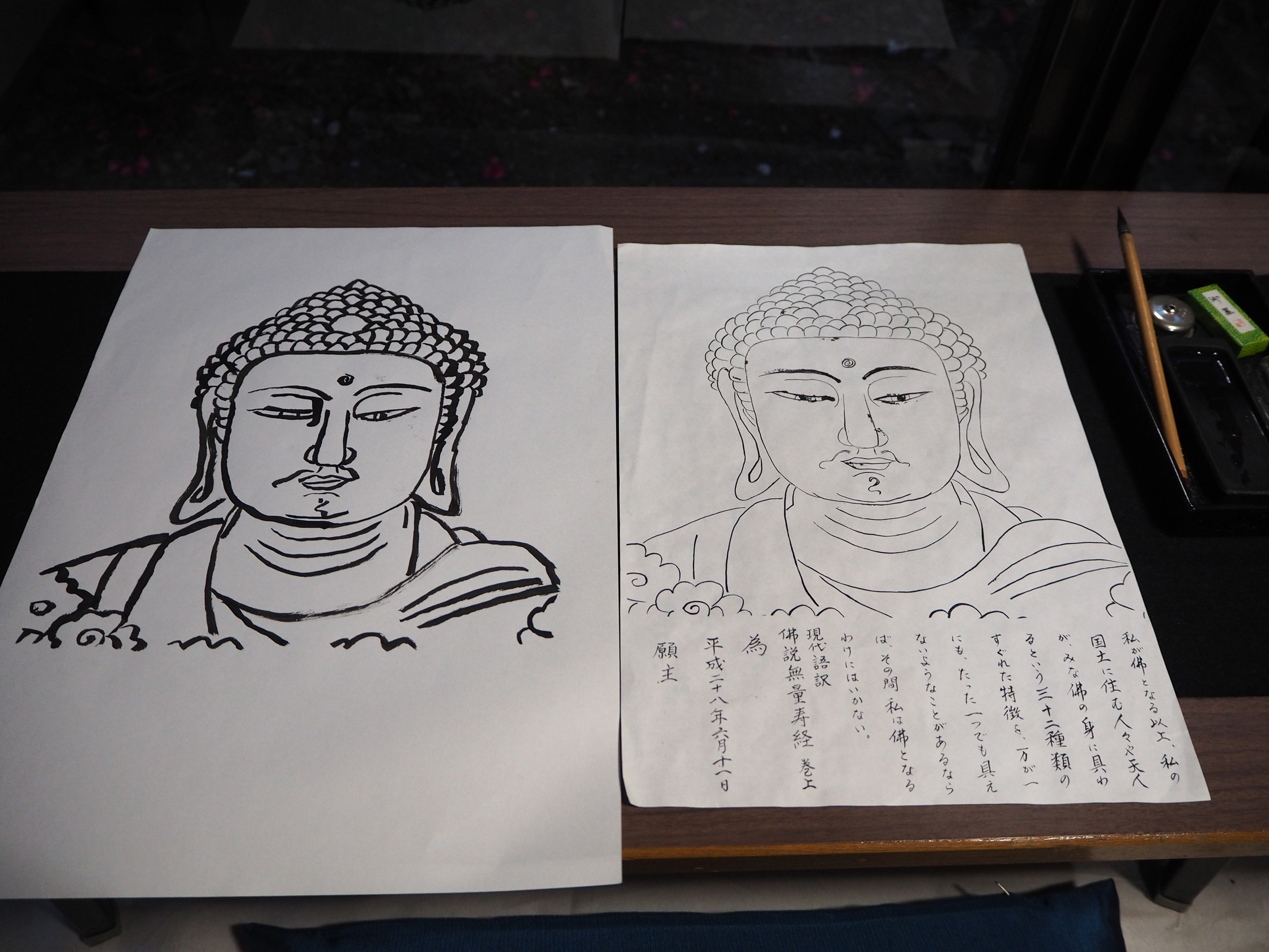 仕事とは関係のない場所、行為でこれほど集中することがあっただろうか? いや、ない。写経、写仏ともに最後まで終えると、はっきりとした達成感があり、頭がすっきりした。妙に線が太い僕の写仏を見た安さんは「力強い感じがします。個性的ですね」とにっこり笑って褒めてくれた。劣等生が先生に褒められようで、恥ずかしいけど嬉しかった。