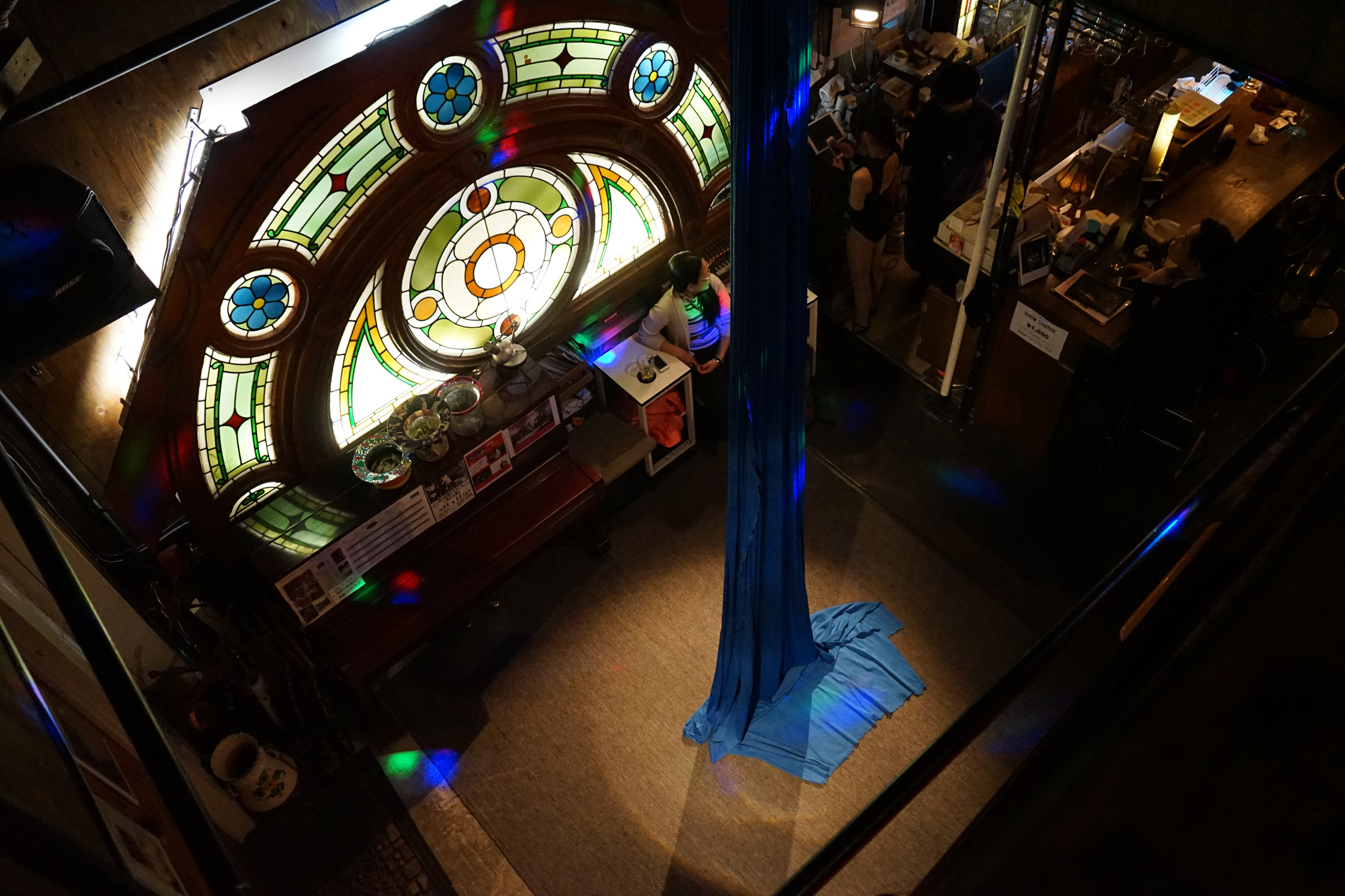 町並みにそぐわないヨーロッパ風の重厚なドアを開けると、そこには天井高6メートルの吹き抜けが現れた。高い天井から垂れ下がっているのは、長さが数メートルもある一枚の布である。