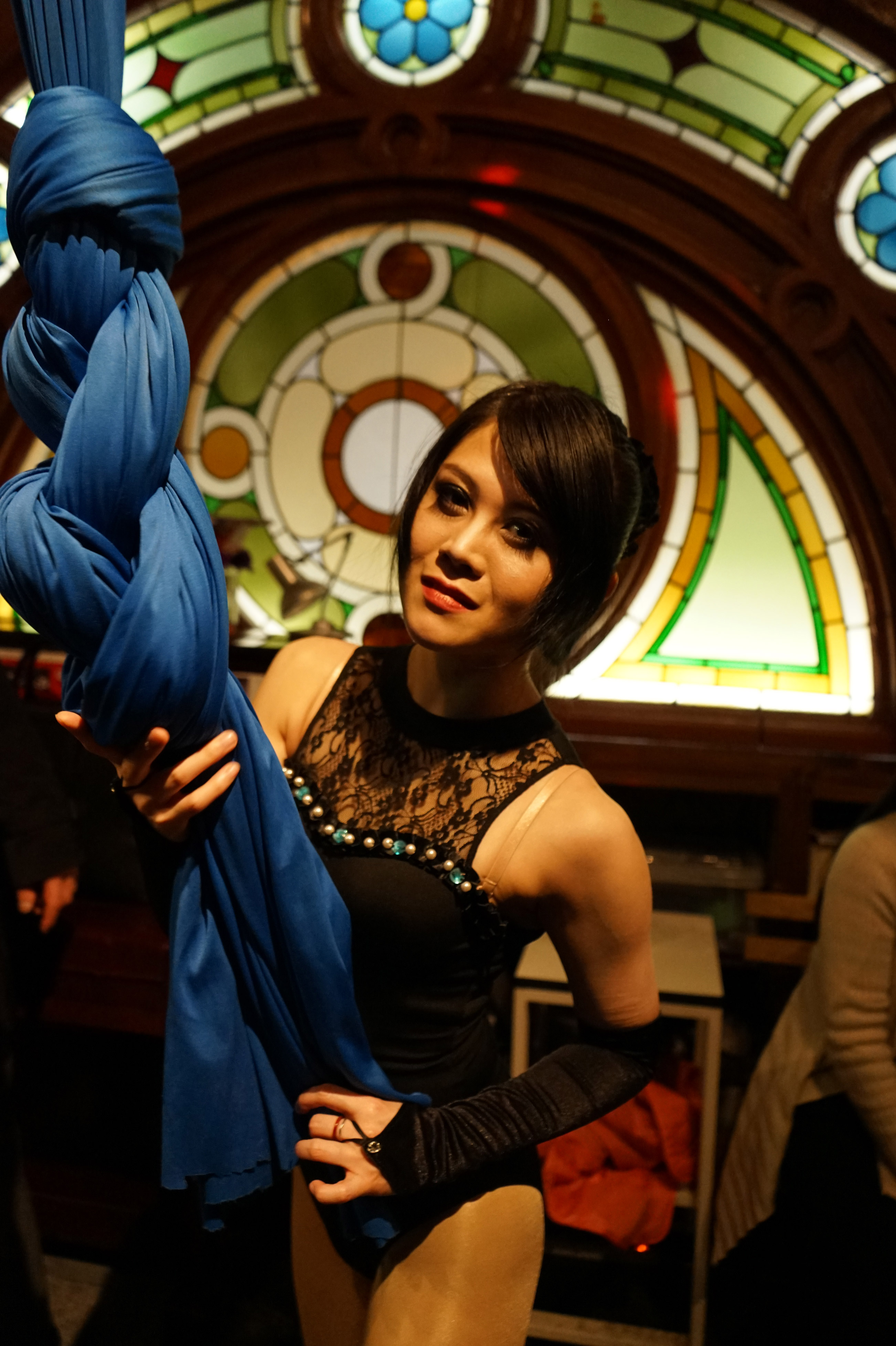 今日のパフォーマーは、エアリアル・シルク(空中芸)のチェルシーさん。とても小柄な女性だ。