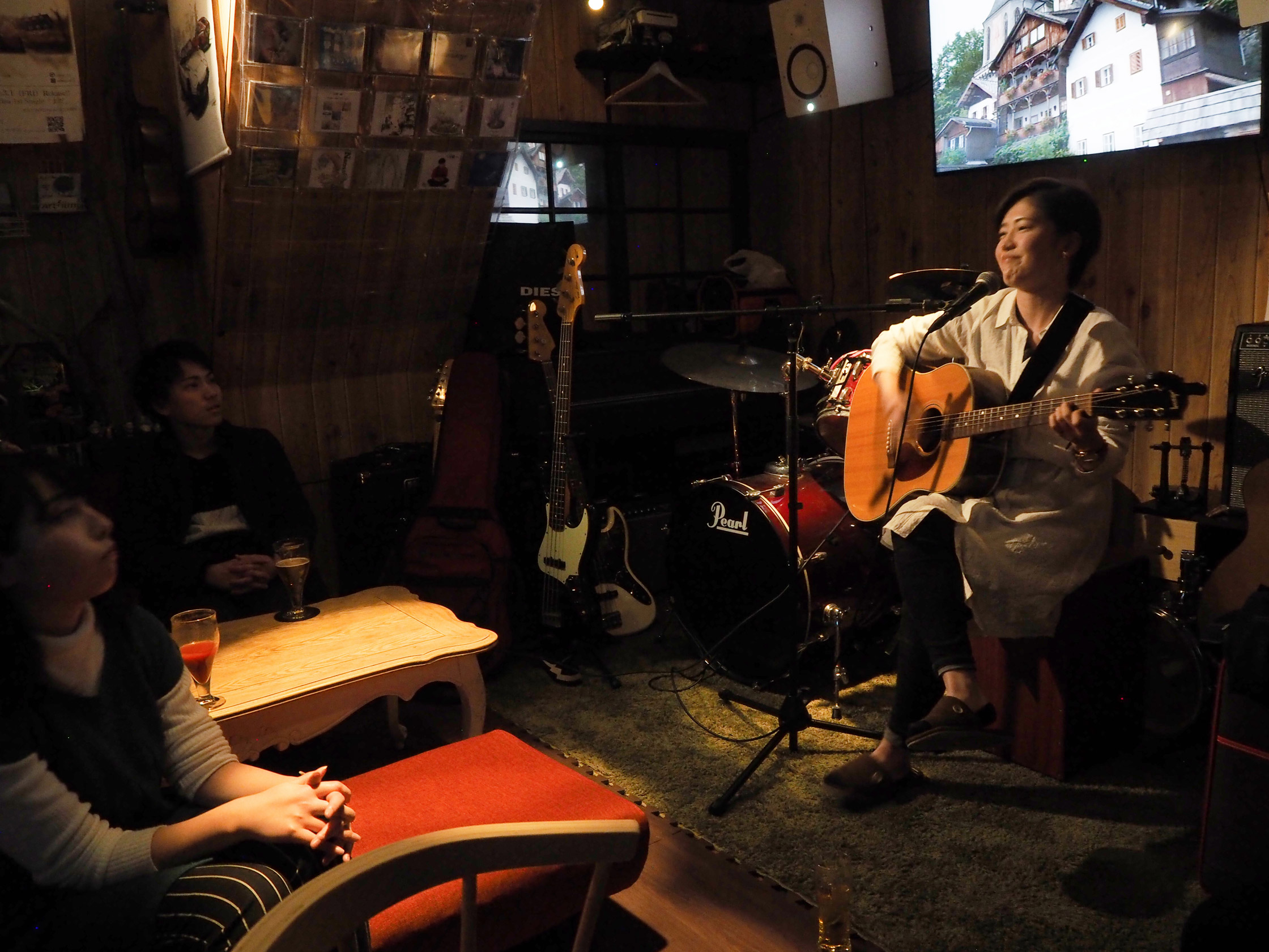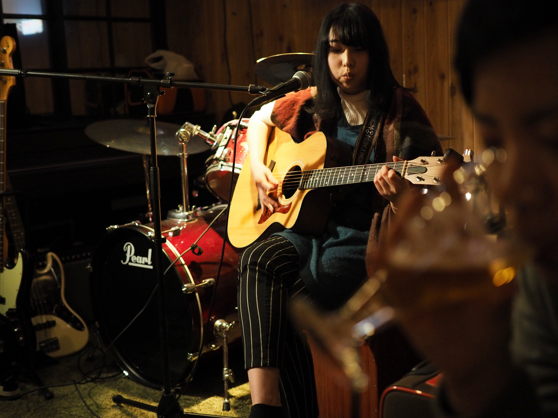 私の後ろでお酒を飲んでいた女の子が、ギターを片手に演奏スペースへ移動した。そう、ライブの出演者が店内で一緒にお酒を飲んでいるのだ。「演奏する人と聴く人の間に壁を作らない」という小野寺さんの思いをそのまま形にした、仰々しいステージではなくフラットな床の先、すぐ目の前の空間でライブは始まった。