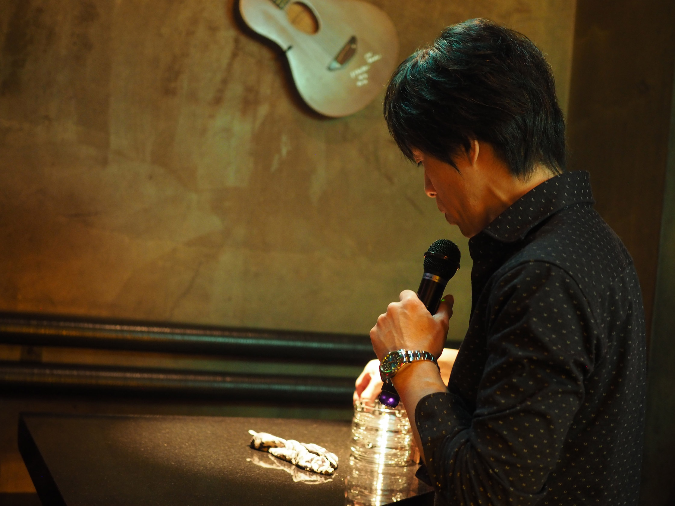 静かなピアノのイントロ、お客さんたちは静かにこちらを見ている。「実力を見てやろうじゃないか」と思われているような気がして、勝手に緊張が増してくる。Aメロ、Bメロと進んでも、なかなか声が出てこないのは一気に飲んだビールのせいか。