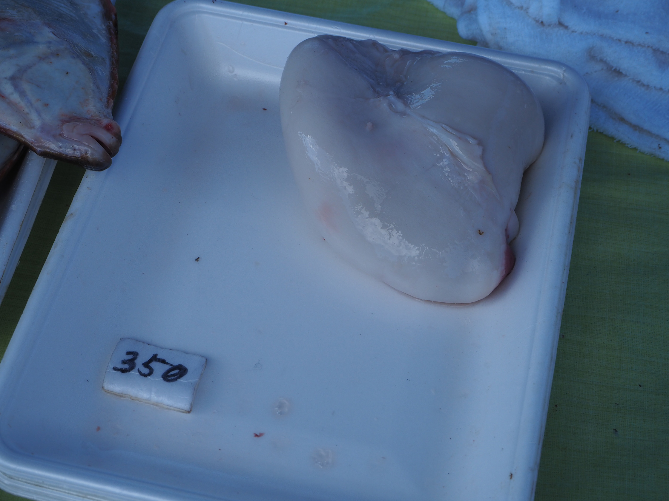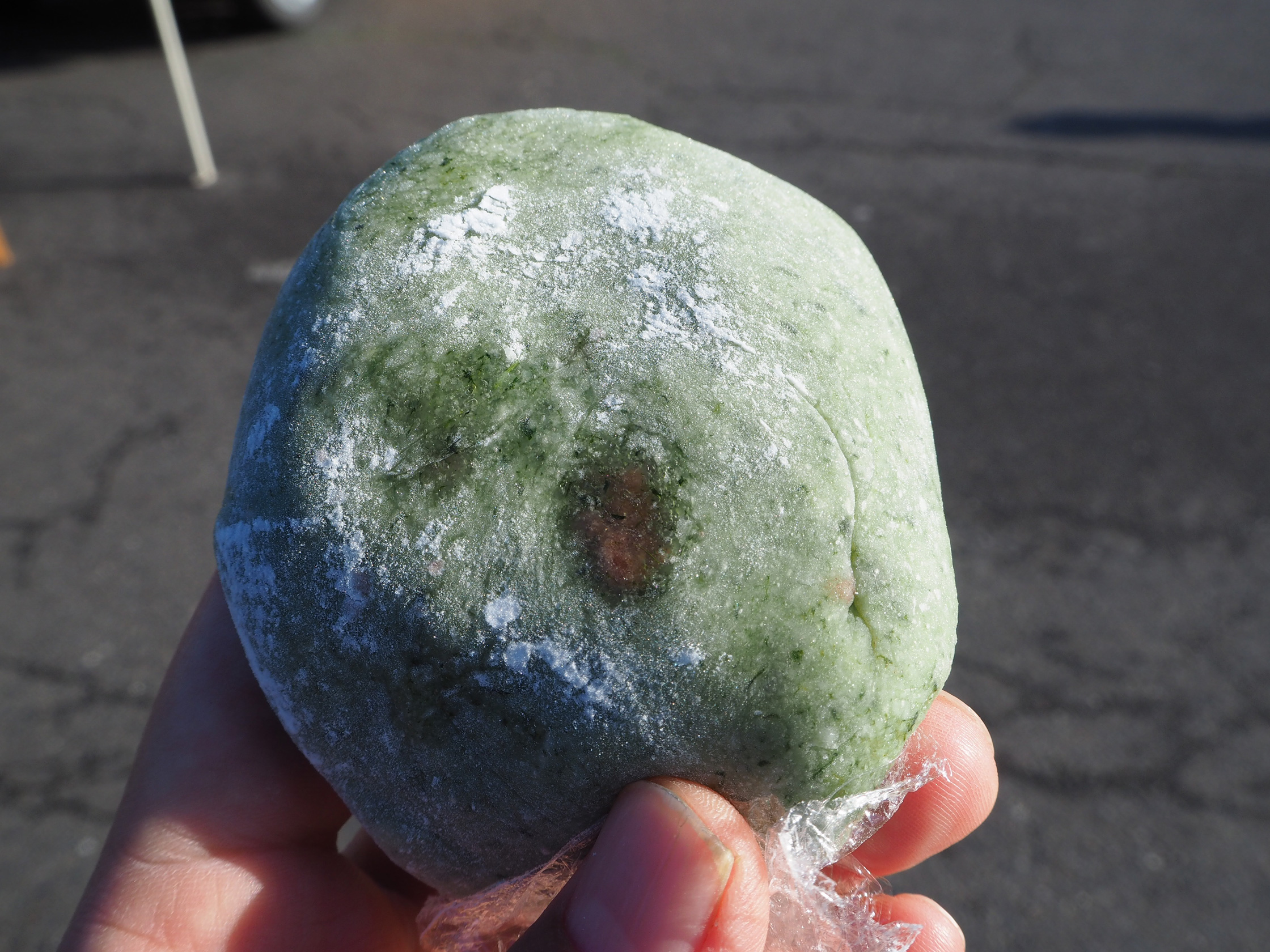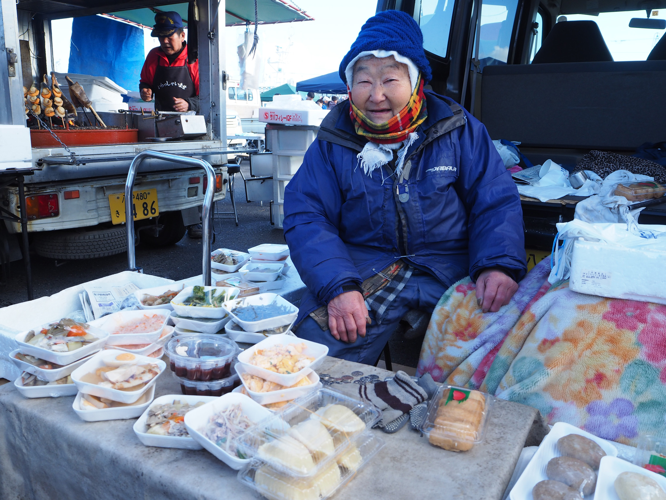 心(と空腹)を落ち着かせるために、ひとりでパックに詰めた料理を売っているおばあちゃんのところへ。稲荷ずしから煮物、揚げ物まで「ぜんぶ手作りよ」。僕はなんだかホッとして、草餅をひとつ買った。100円也。柔らかくてポニョポニョの草餅を頬張りながら、探索続行。館鼻岸壁朝市は、良い意味でツッコミどころ満載だ。