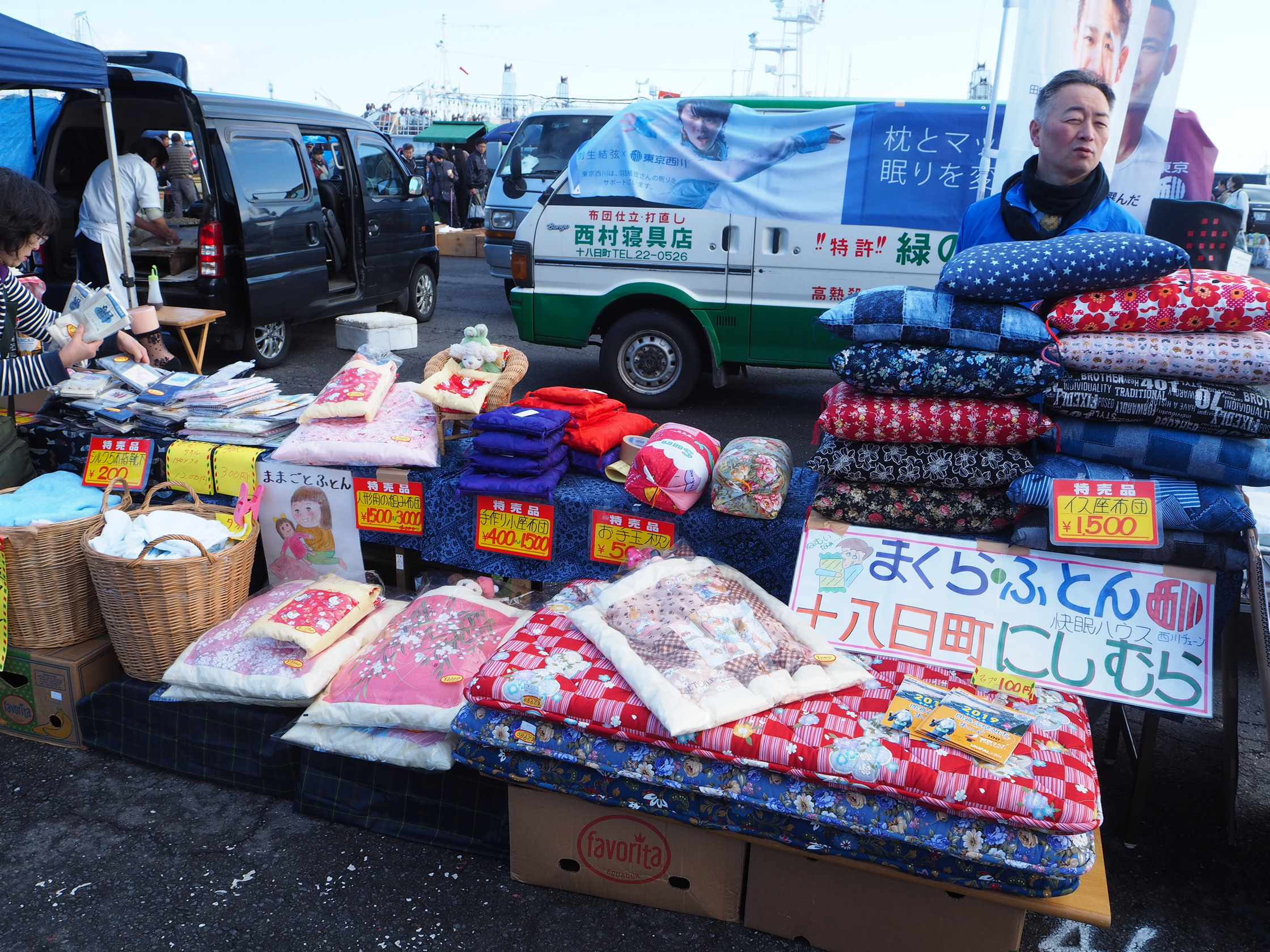 枕と布団を売っている人がいる。どこから発掘してきたのかわからない、レトロなプラモデルを売っている人もいる。不思議な形の木工細工もあれば、野菜と布草履を一緒に売っている人もいる。季節外れのかき氷も売ってるし、金魚も売っている。その日の夜に獲れたばかりというタコの頭は、なぜか裏返しにされて売られていた。いまさっき採ってきたばかりのような泥だらけのごぼうが地面に置かれていて、踏みそうになった。