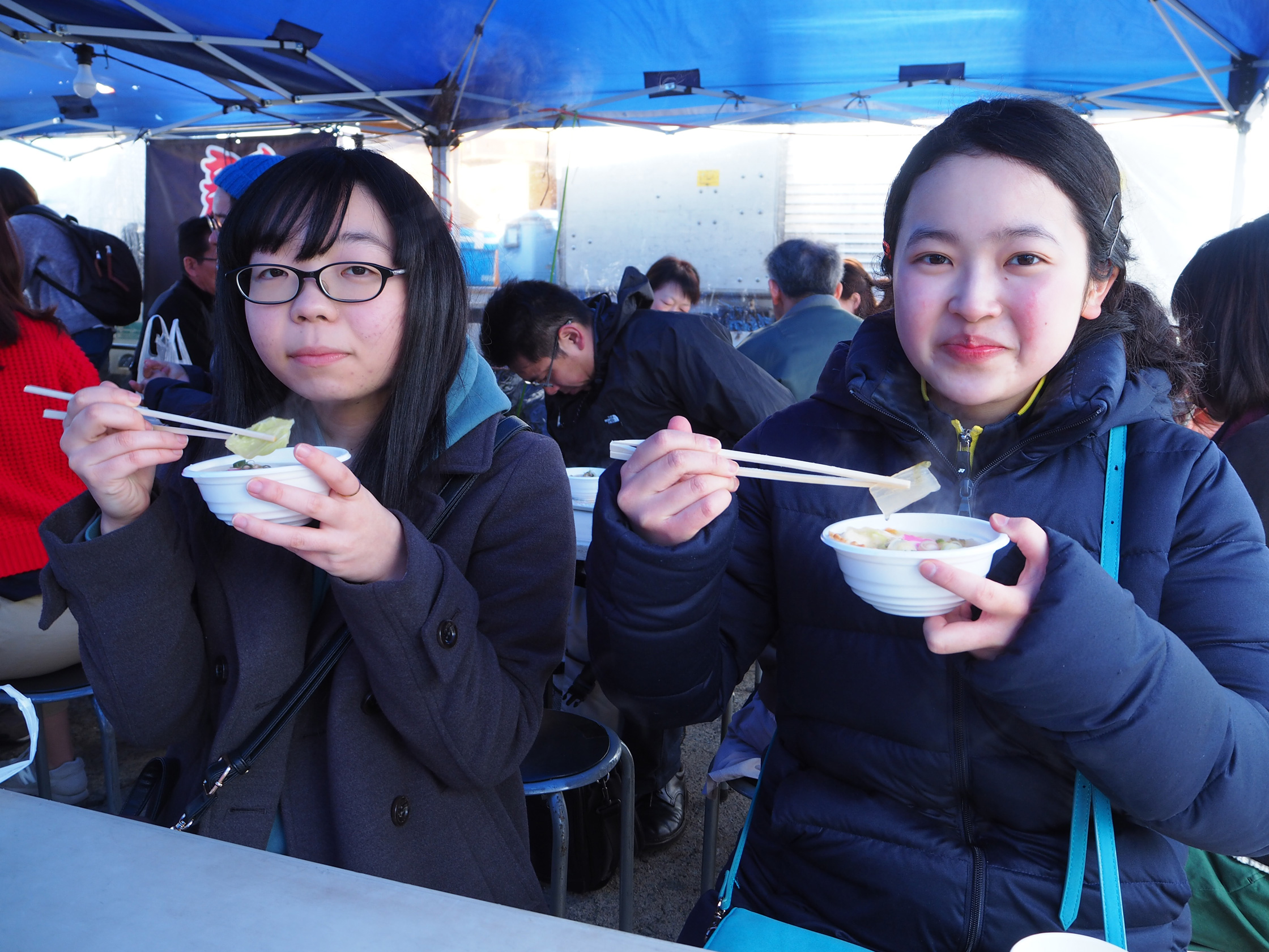 「店がありすぎ! ご飯の種類もすごくてびっくりしました!」と言っていたのは、青森を旅行中の神奈川県から来た女の子ふたり。朝6時に来てから小籠包、せんべい汁、焼き鳥、豚の軟骨、お餅を食べたそうで、「惜しみなく、後悔なく食べないと!」と力強い。