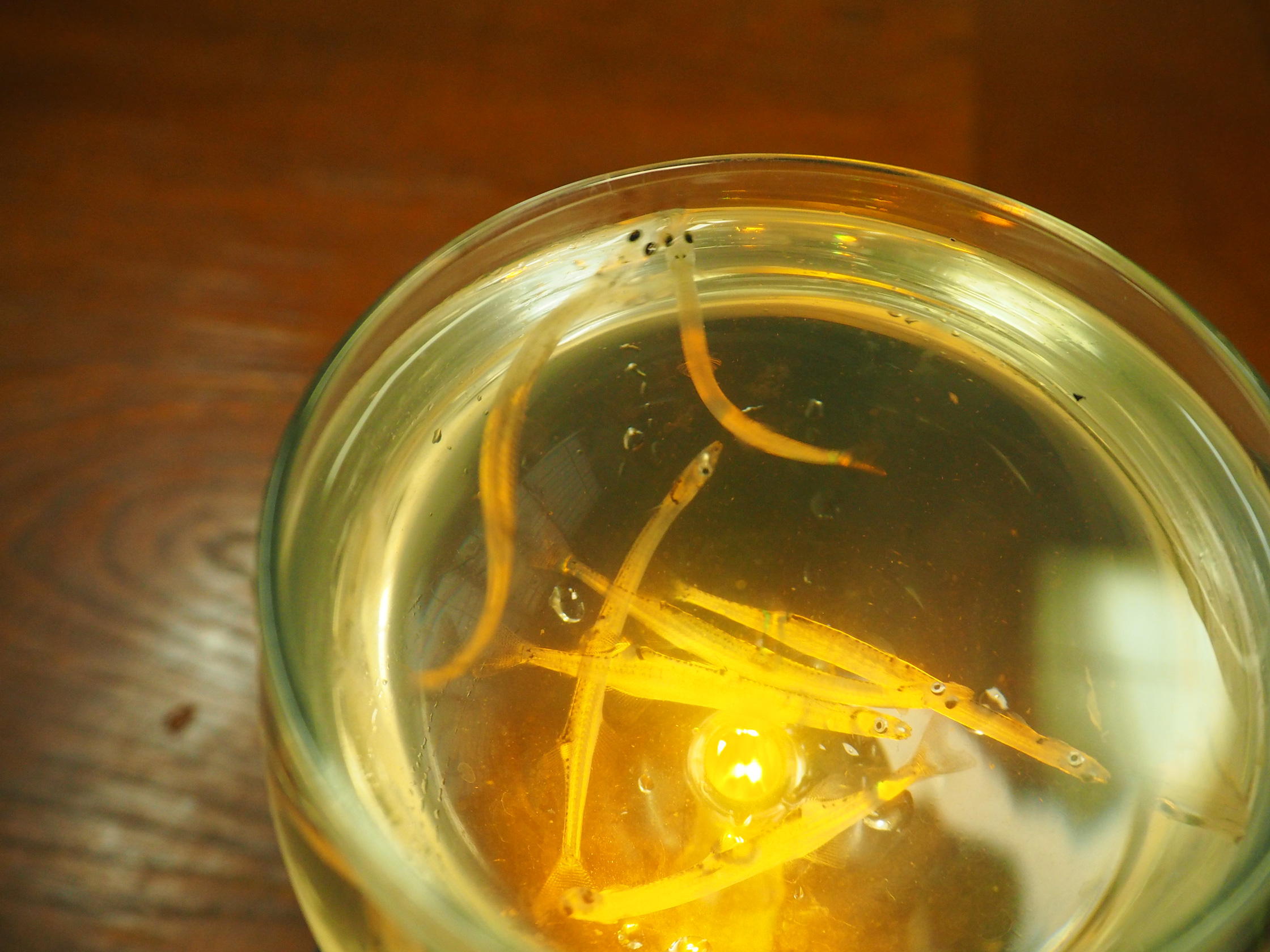 蛯名さんは取材の当日、漁師さんに話を通して白魚を仕入れてくれたのだけど、グラスの底にはすでに数匹がぐったりと体を横たえていた。漁師から蛯名さんのもとに運ばれ、水槽に放されている間に亡くなったそう。本当に繊細すぎる魚なのである。