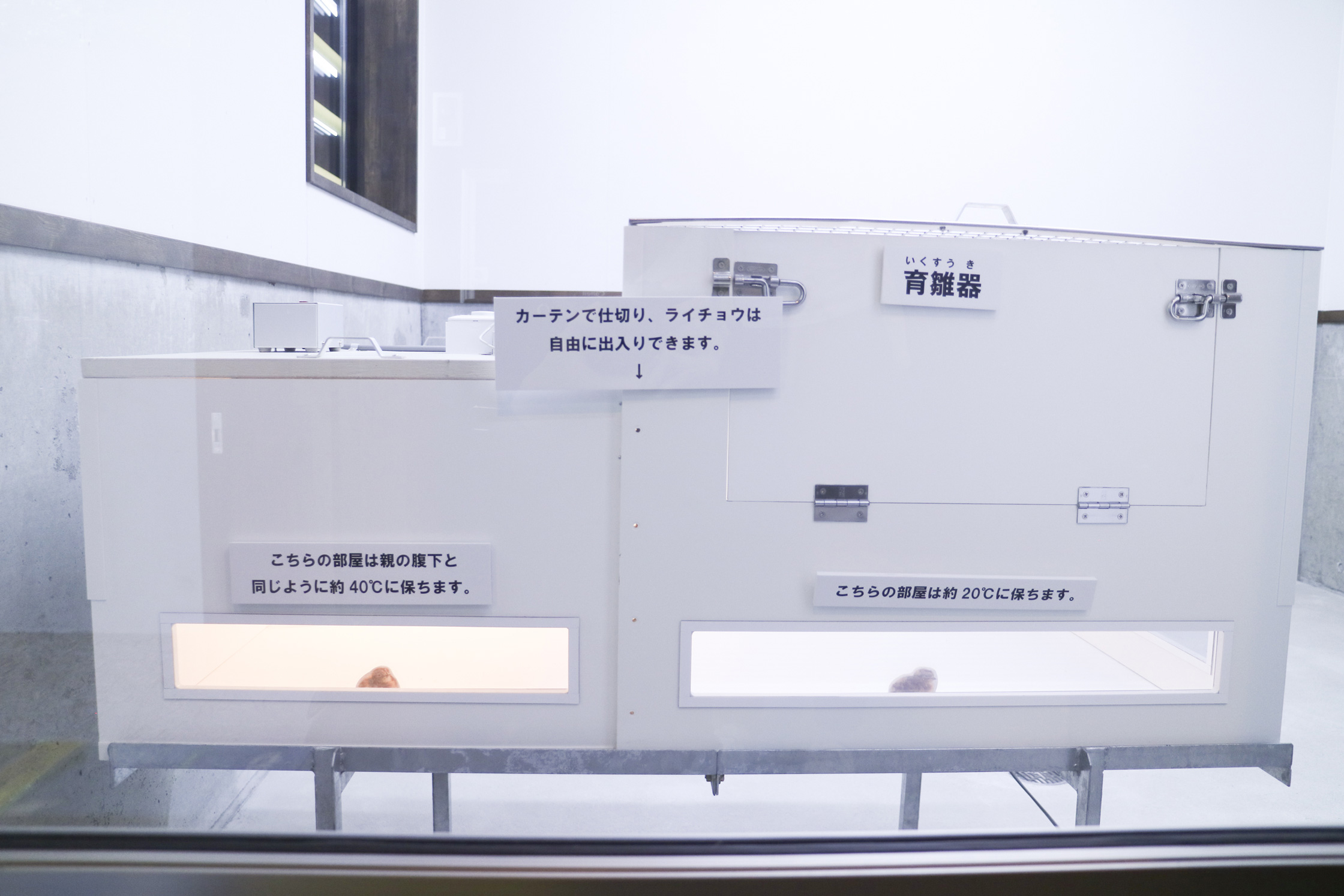 ライチョウは卵から孵すことはできても、育てるのが難しい。またライチョウが、なぜ厳しい高山の上で生きていけるのか、その生態もまだよくわかっていない。そんなライチョウをどのように人工飼育ができるか、山博では高山での生態を常に考えながら、オス2羽とメス4羽を育てている。特に繁殖には、山の中の温度や光を再現することも重要だ。飼育の黎明期には鶏に卵を抱かせて孵化させたこともあったそうだが、現在は温度管理が徹底された孵卵器と育雛器の中で育てている。成長してからもライチョウ舎につないでいる19台のカメラで、24時間体制で生態を観察している。