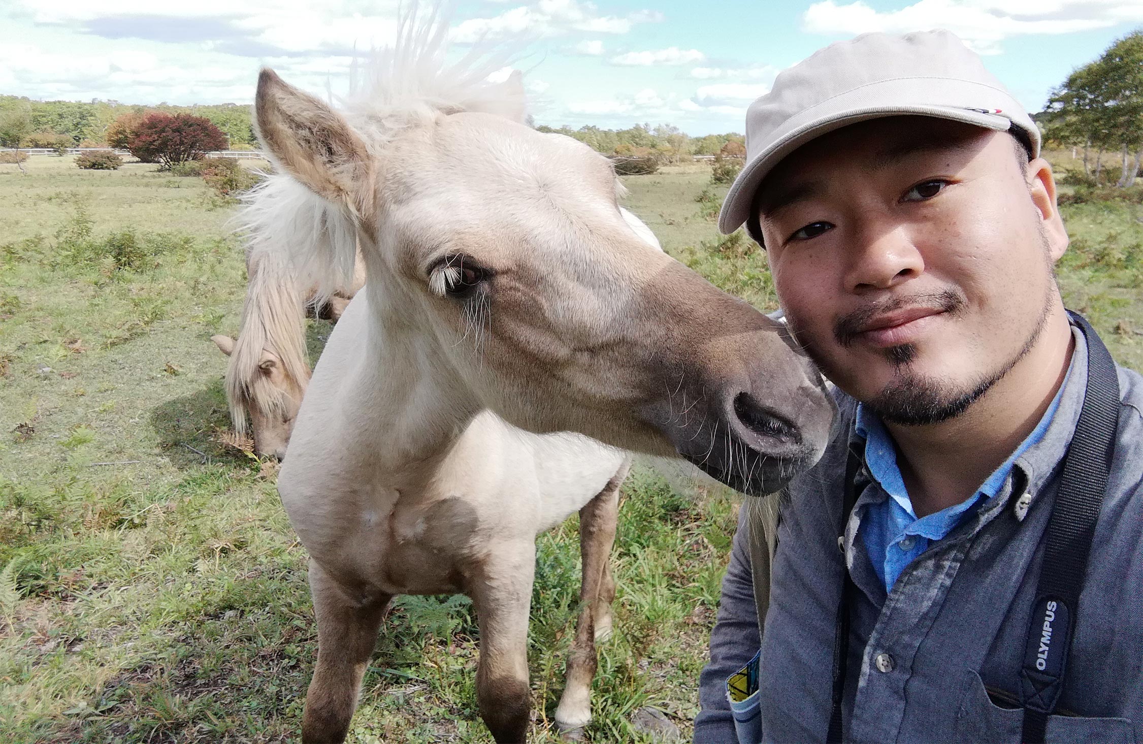 馬たちは阿部さんを完全に信頼していて、呼びかければ阿部さんのもとに戻ってくる。僕も柵のなかに入れてもらった。馬たちはこの広々とした草原で、日々心地よく過ごしているのだろう。初対面の僕が身体を触ったり、撫でたりしてもリラックスした様子。今年5月に生まれたばかりの子馬と自撮りをしたら、ギュッと顔を寄せてくれた。サービス精神も旺盛!