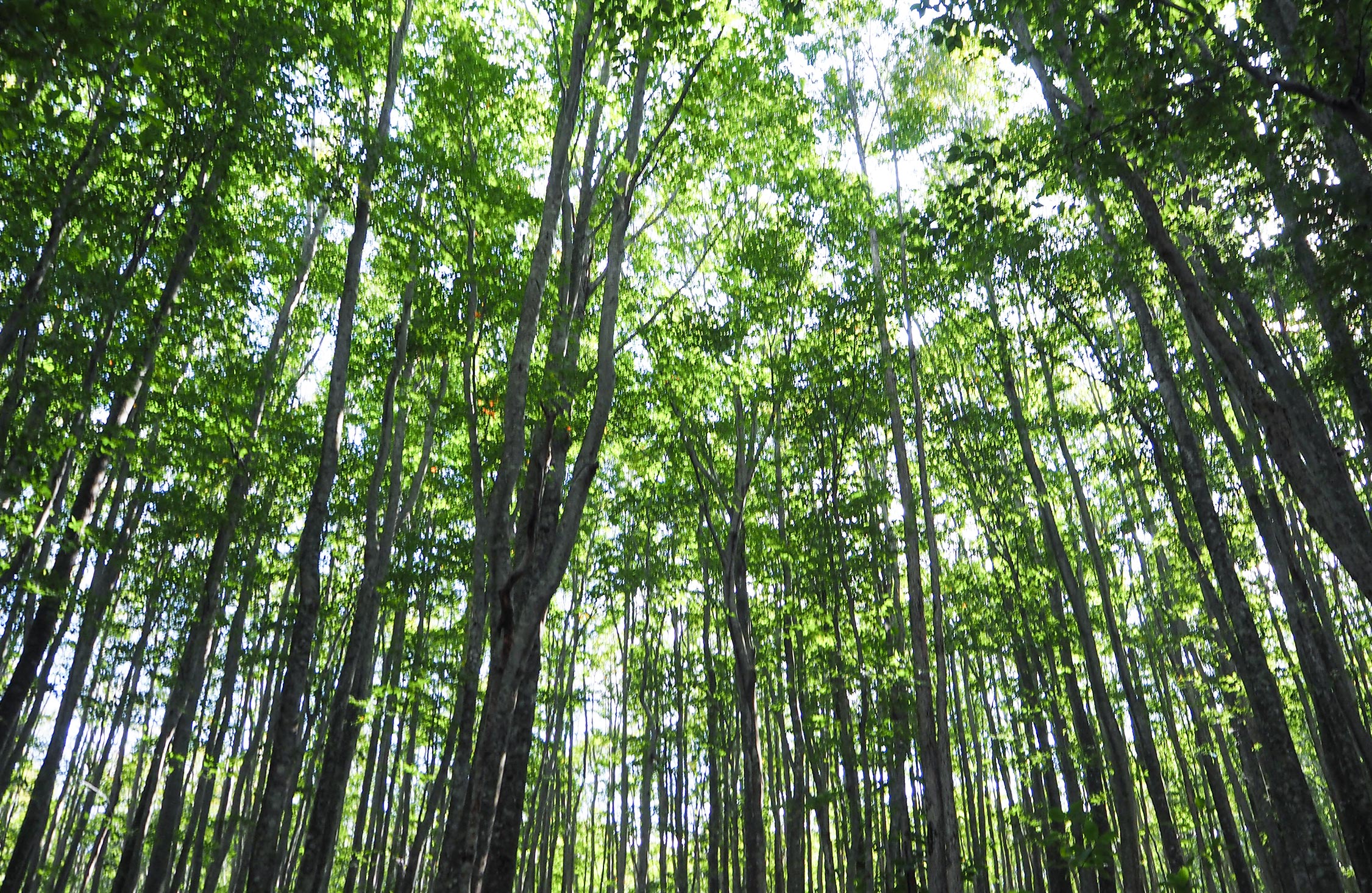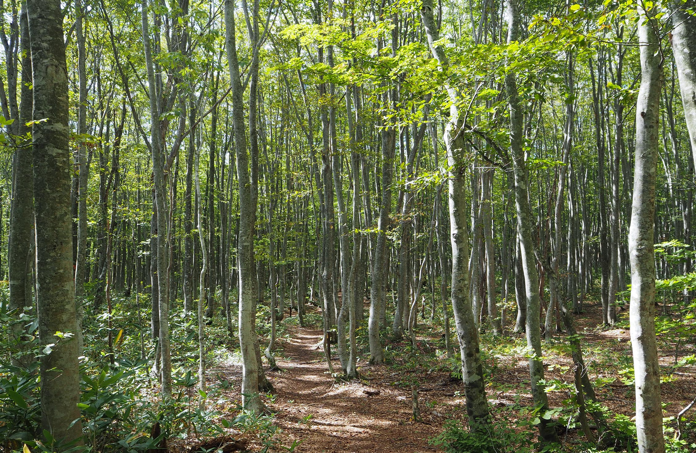木漏れ日がまぶしい木立ちを抜けると、見事なブナ林が広がる。このあたりに生えている樹木は、昭和の初期、木炭や漆器などの資材として皆伐されていた。しかし、水分を多く含み、使いづらいブナは残された。そのブナが種を落とし、数十年たって、立派なブナ林に成長したのだ。ここに足を踏み入れた瞬間、頭の中に爽やかな風が吹き抜け、身体全体が喜んでいるような気がした。