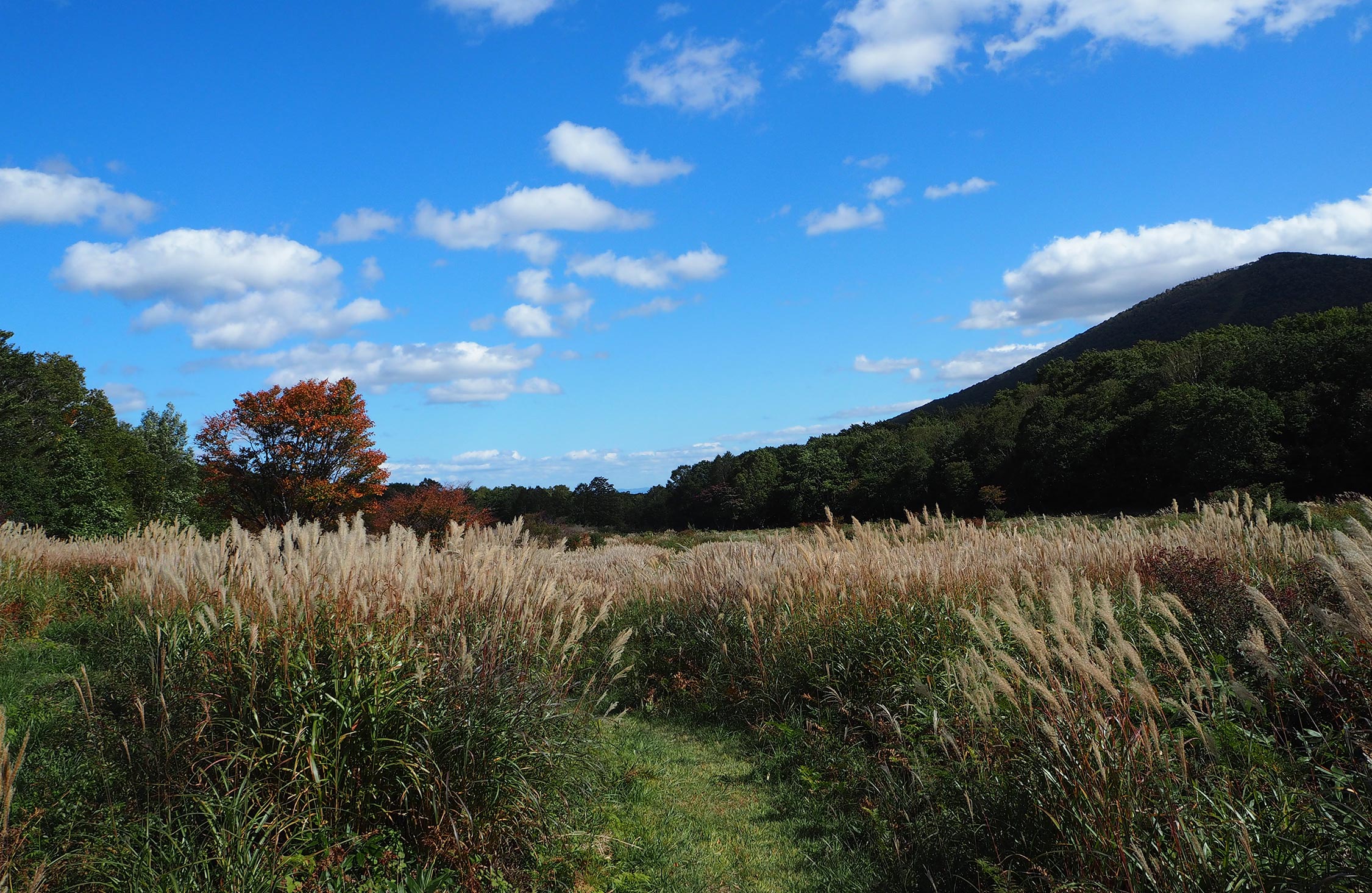 ブナ林を抜けると景色が一変し、今度は一面のススキ野。聞こえてくるのは、黄金色のススキを撫でる風の音だけ。視界には人工物が一切なく、絵画のなかに入り込んだよう。圧倒的な静けさが、ぜいたくに感じる。